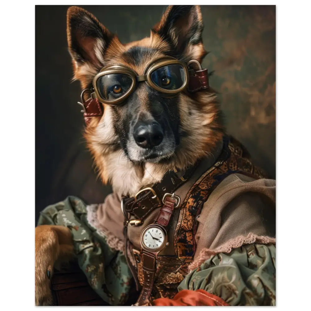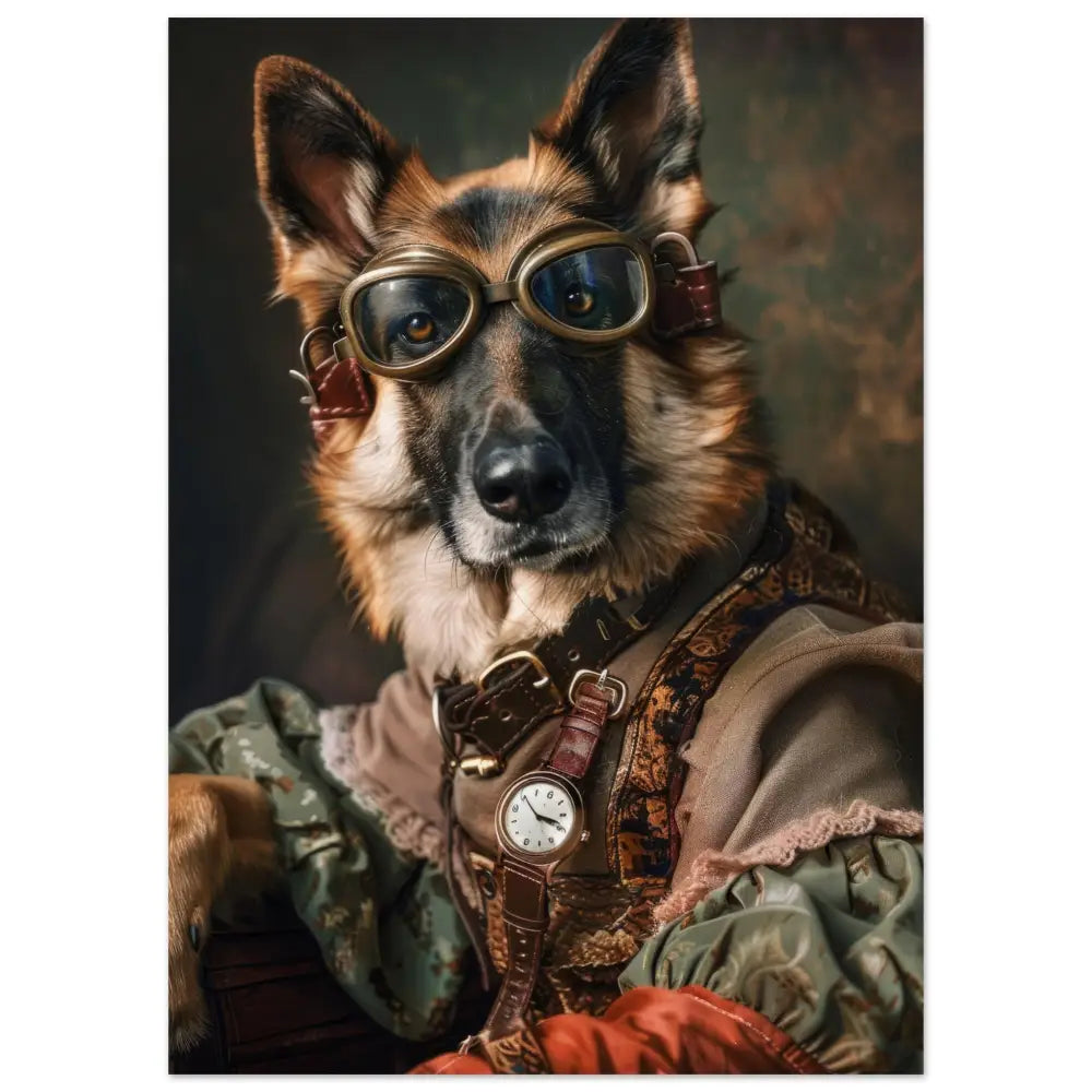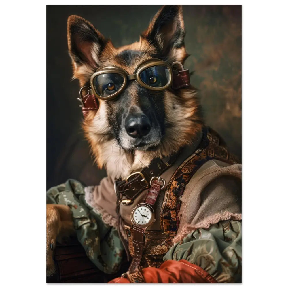 Deze afbeelding toont een dier, gekleed in een prachtige vintage steampunk outfit. Het draagt een elegante bruine jas met complexe patronen en gouden accenten. Om de nek hangt een antieke zilverkleurige klok, die de tijdloze allure van de outfit versterkt. De kop is versierd met een paar grote, koperkleurige brillen met metalen details, wat het dier een avontuurlijke uitstraling geeft. De poten zijn voorzien van verfijnde, groene bontachtige manchetjes die de outfit completeren. De achtergrond heeft een rustieke, gebarsten muur die bijdraagt aan de nostalgische sfeer van het schilderij.