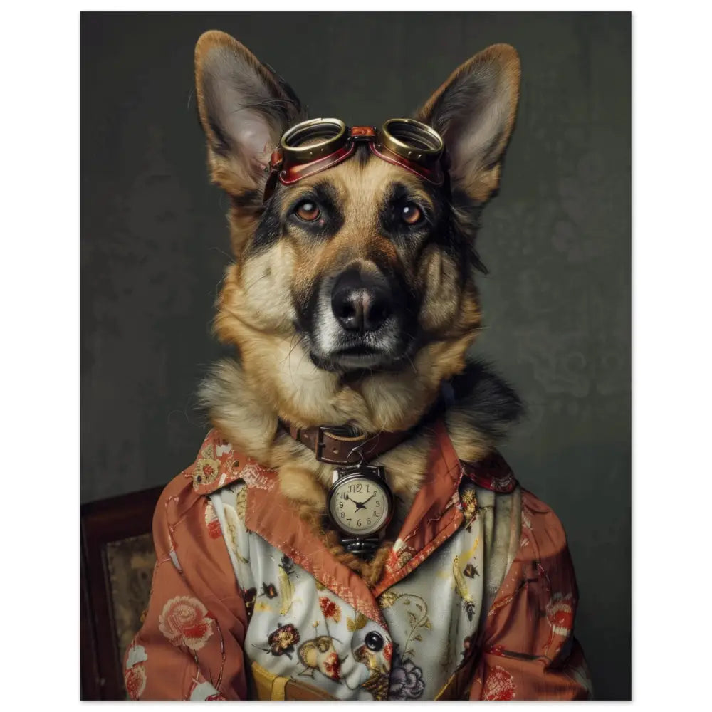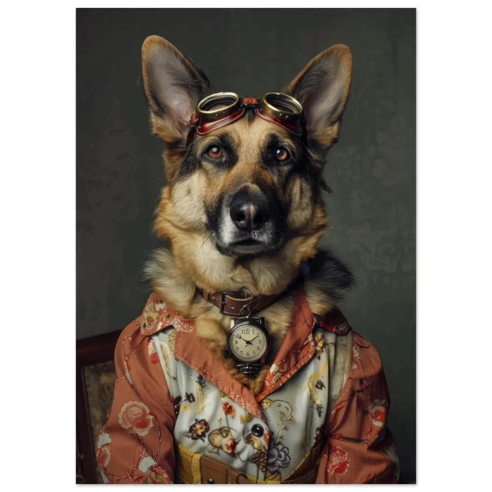 Deze afbeelding toont een dier, gekleed in een prachtige vintage steampunk outfit. Het draagt een elegante, roestkleurige jas met delicate bloemmotieven en subtiele fluwelen accenten. Om de nek hangt een antieke, zilveren klok die de verfijnde uitstraling benadrukt. Op het hoofd rust een paar grote, bronzen retro-futuristische brillen met verfijnde metalen details, wat het geheel een avontuurlijke ambiance geeft. De poten zijn voorzien van schattige, beige bontachtige manchetjes en leren riemen met contrasterende stiksels. De achtergrond is bedekt met een vintage bloemenbehang, wat de romantische sfeer van het portret versterkt.