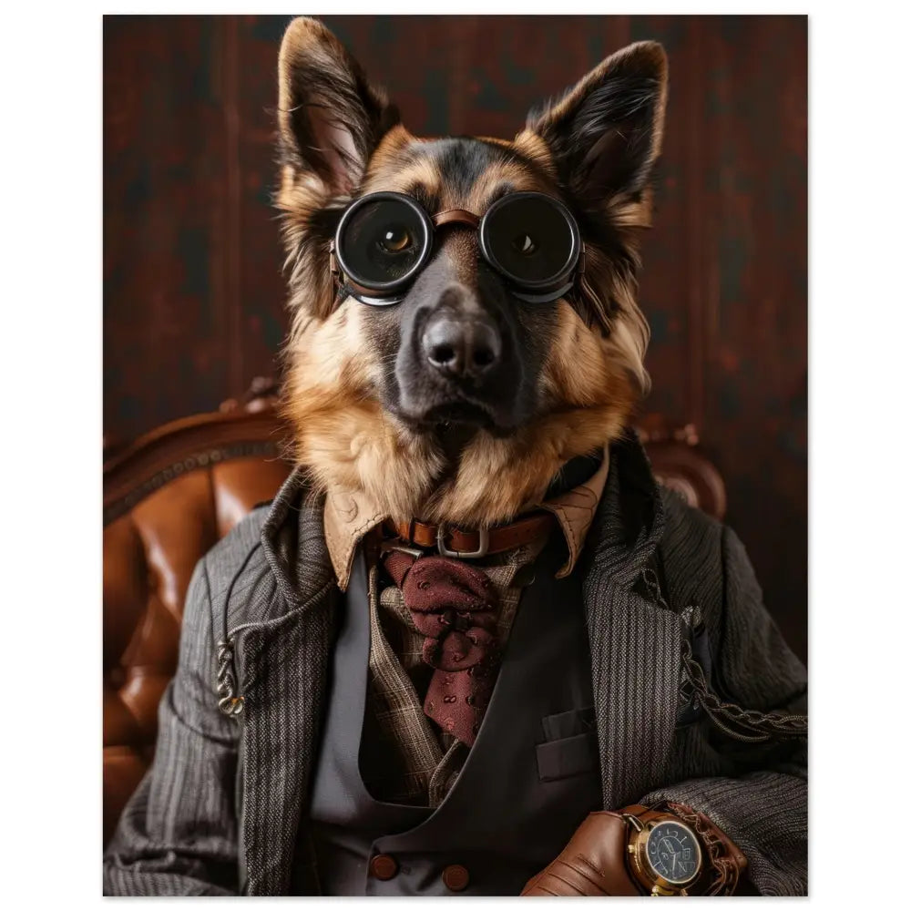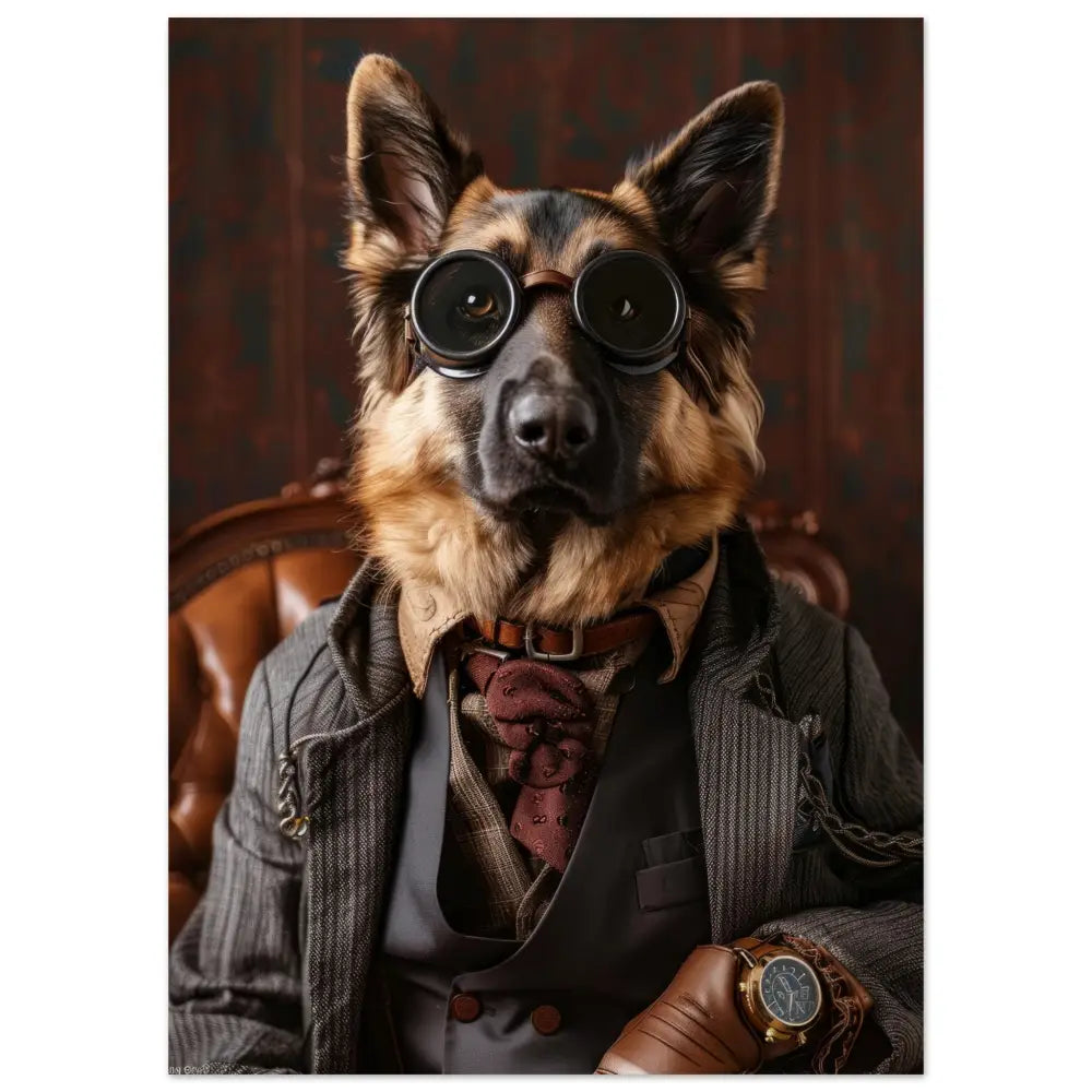 Deze afbeelding toont een dier, gekleed in een prachtige vintage steampunk outfit. Het draagt een gedistingeerde grijze jas met fijne strepen en leren accenten, verrijkt met subtiele metalen kettingen. Om zijn nek hangt een antieke bronzen klok, die de elegante uitstraling accentueert. Op het hoofd prijkt een paar imposante, retro-futuristische brillen met robuuste, zwarte metalen details. De pootjes zijn stijlvol afgewerkt met leren manchetjes en contrasterende stiksels, die de verfijnde look aanvullen. De achtergrond bestaat uit een kleurrijk bloemenbehang, die een romantische sfeer toevoegt aan het geheel.