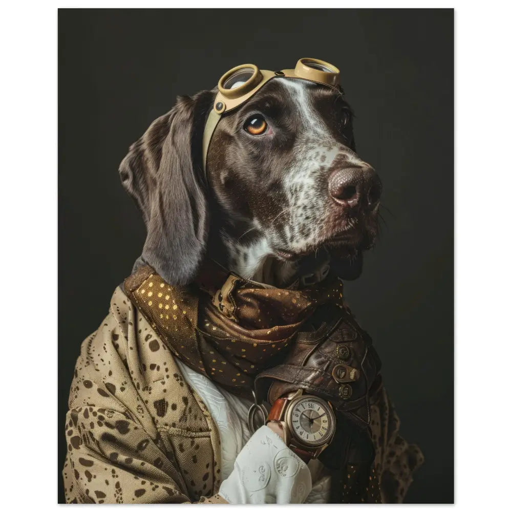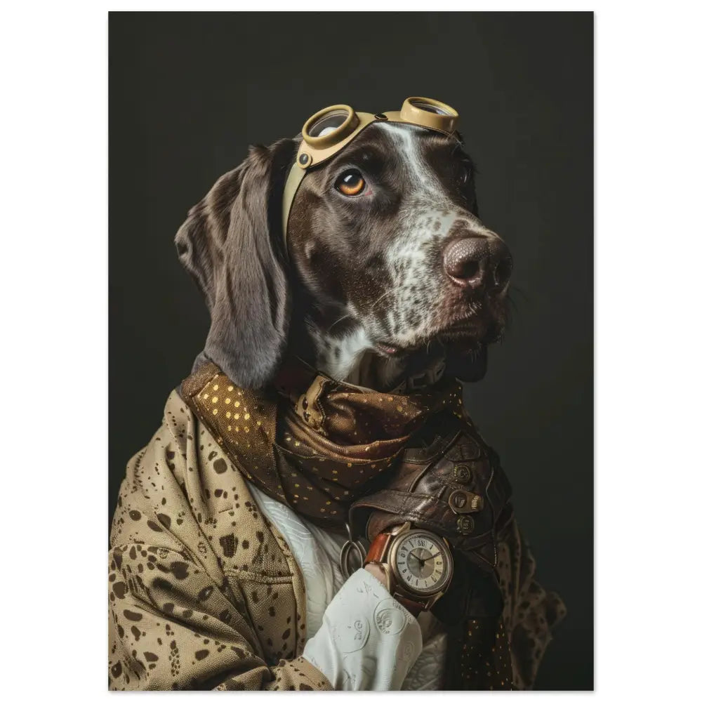 Deze afbeelding toont een hond, gekleed in een prachtige vintage steampunk outfit. Het draagt een elegante, beige jas met gevlekte patronen en gouden stippen accenten. Om de nek hangt een antieke bronzen klok, wat een verfijnde, historische uitstraling geeft. De kop wordt gesierd door een paar grote, koperen retro-futuristische brillen met glanzende metalen details, wat de hond eruit doet zien als een nieuwsgierige ontdekkingsreiziger. De pootjes zijn voorzien van stijlvolle leren manchetjes die het geheel compleet maken. De achtergrond is donker en neutraal, waardoor de gedetailleerde steampunk outfit extra opvalt.