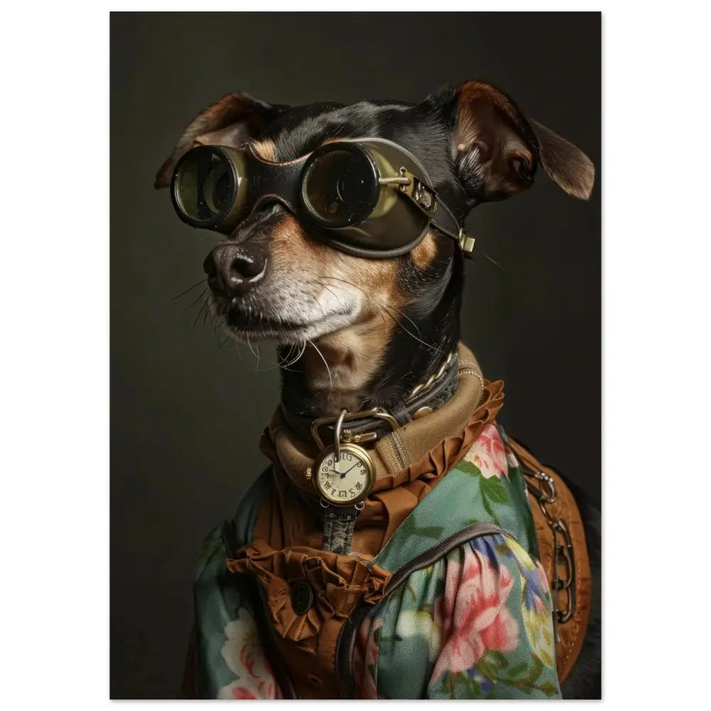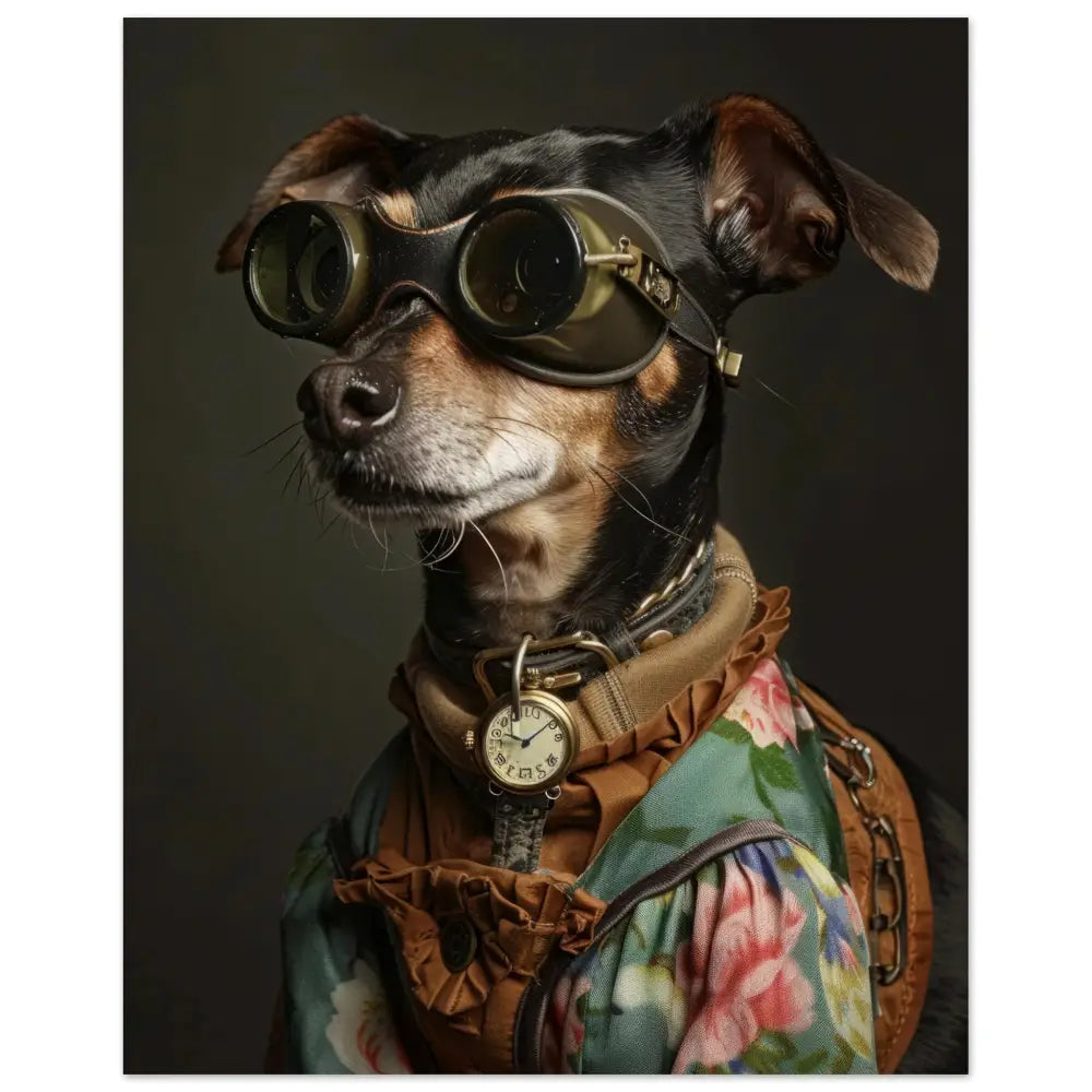 Deze afbeelding toont een dier, gekleed in een prachtige vintage steampunk outfit. De hond draagt een sierlijke, groene jas met kleurrijke bloemmotieven en delicate stiksels. Om zijn nek hangt een antieke gouden klok, wat een vleugje elegantie toevoegt. Op zijn hoofd prijkt een paar grote, futuristische brillen met bronzen metalen details, die een avontuurlijke uitstraling geven. De leren accenten op zijn jas en het contrasterende stikwerk dragen bij aan het gedetailleerde steampunk-thema. De achtergrond is donker en eenvoudig, waardoor alle aandacht naar het prachtig aangeklede dier gaat.