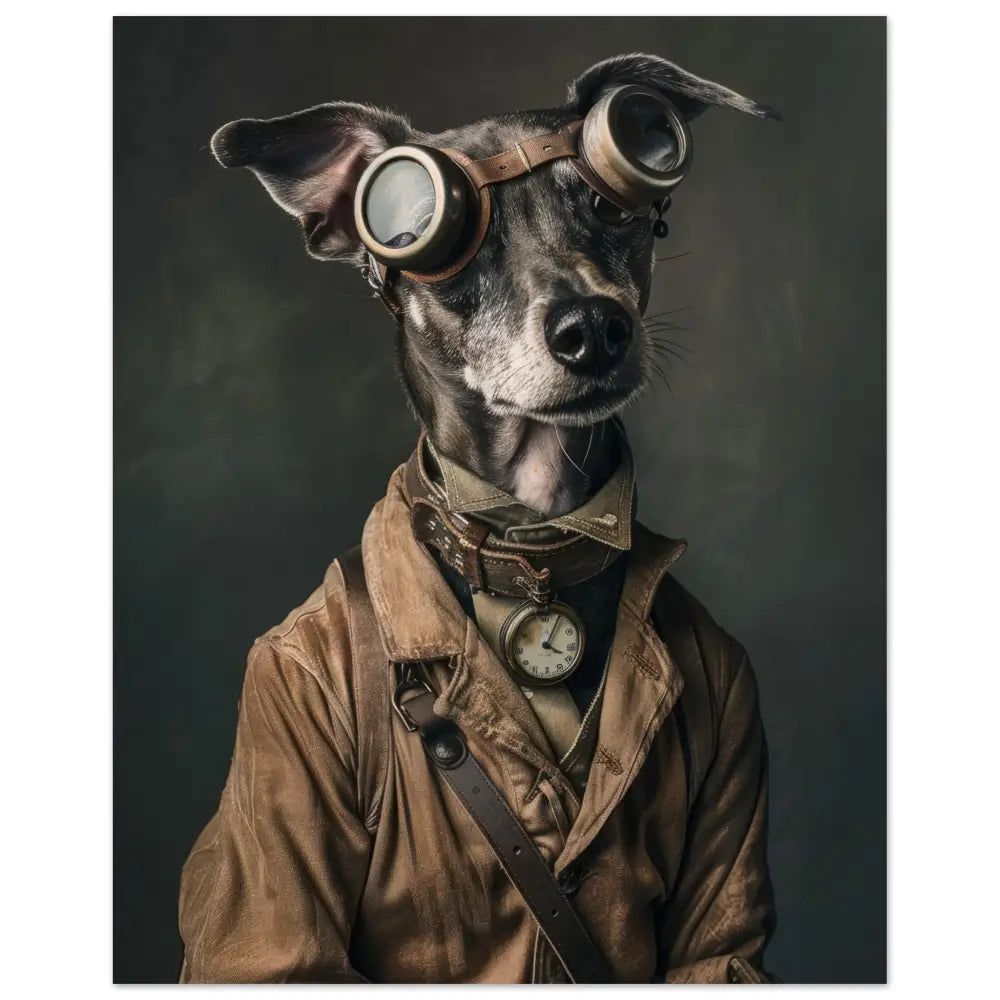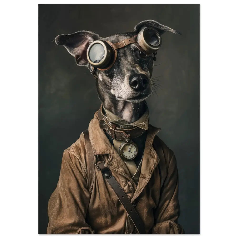Deze afbeelding toont een dier, gekleed in een prachtige vintage steampunk outfit. Het draagt een sierlijke, donkerbruine jas met subtiele stiksels en leren accenten. Om de nek hangt een antieke, gouden klok, zorgvuldig bevestigd aan een leren riem, waardoor er een charmant detail aan het geheel wordt toegevoegd. De kop wordt gesierd door een paar opvallende retro-futuristische brillen met metalen details in een warme bronskleur, waardoor de uitstraling van een avontuurlijke tijdreiziger compleet wordt gemaakt. Onder de jas zijn leren riemen zichtbaar, wat getuigt van een robuuste en avontuurlijke slag. De achtergrond is sfeerbepalend met een zacht, vervaagd patroon dat de klassieke uitstraling verder accentueert.