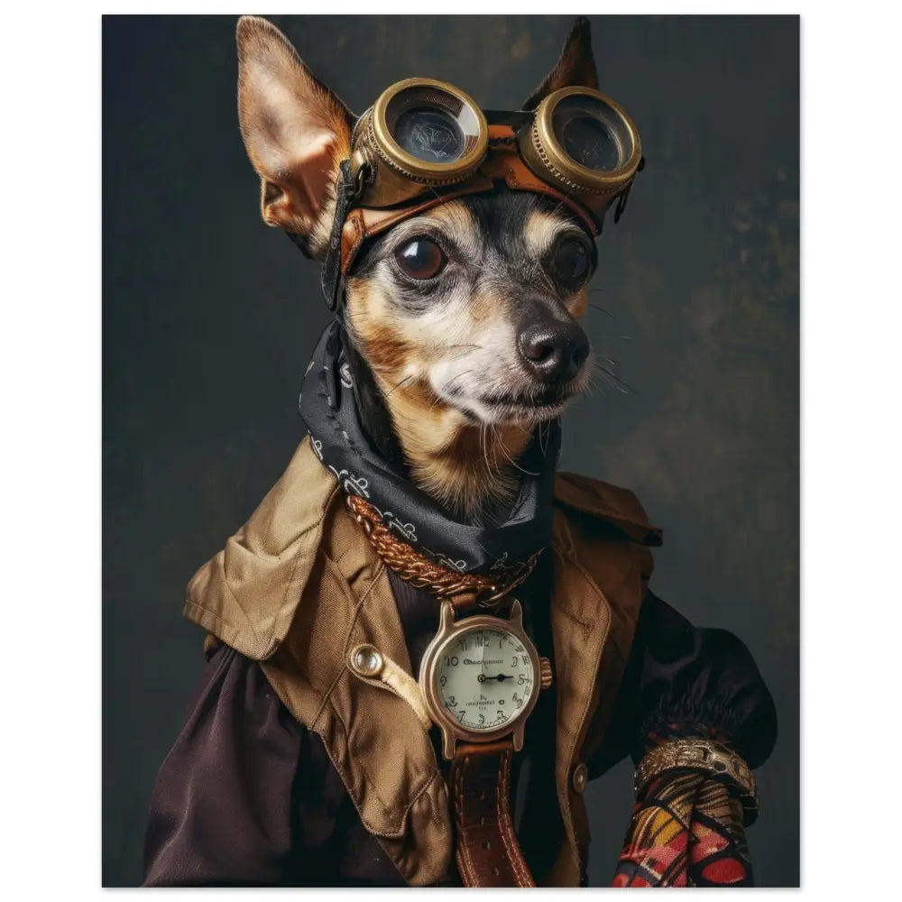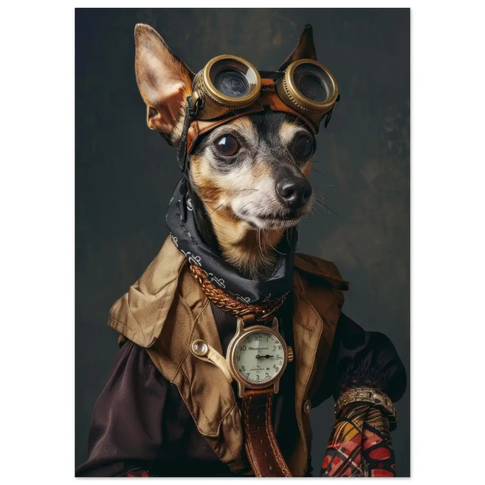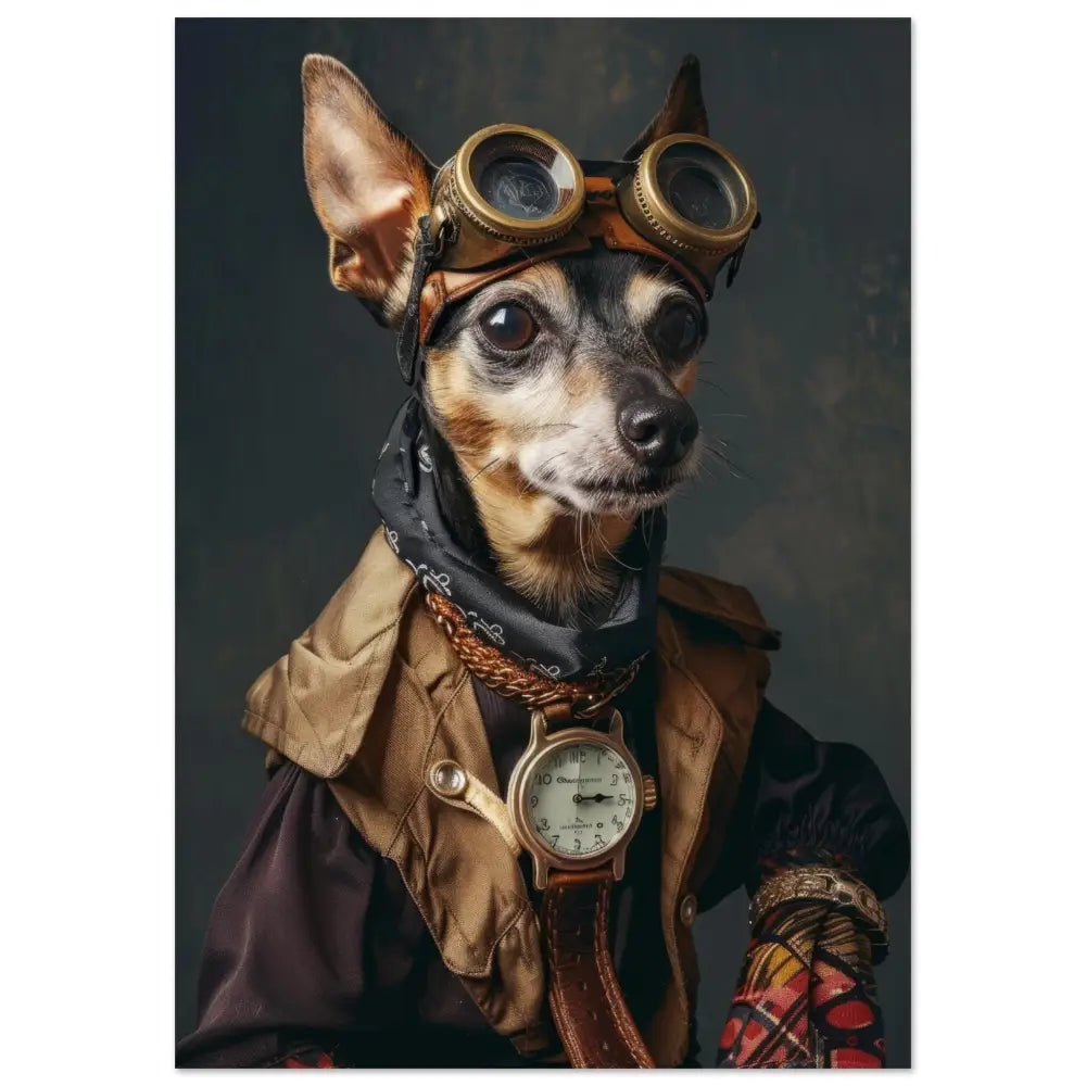 Deze afbeelding toont een dier, gekleed in een prachtige vintage steampunk outfit. Het draagt een elegante, bruin-gouden jas met subtiele, glanzende accenten. Om de nek hangt een antieke bronzen klok met een gedetailleerd gezicht dat de tijd aangeeft. De kop wordt gesierd door een stoere, koperkleurige bril met metalen details, wat het een avontuurlijk en futuristisch uiterlijk geeft. De pootjes zijn voorzien van verfijnde, zwarte manchetjes met leren bandjes en contrasterende stiksels. De achtergrond is donker en mysterieus, waardoor het hoofdonderwerp nog meer naar voren komt.