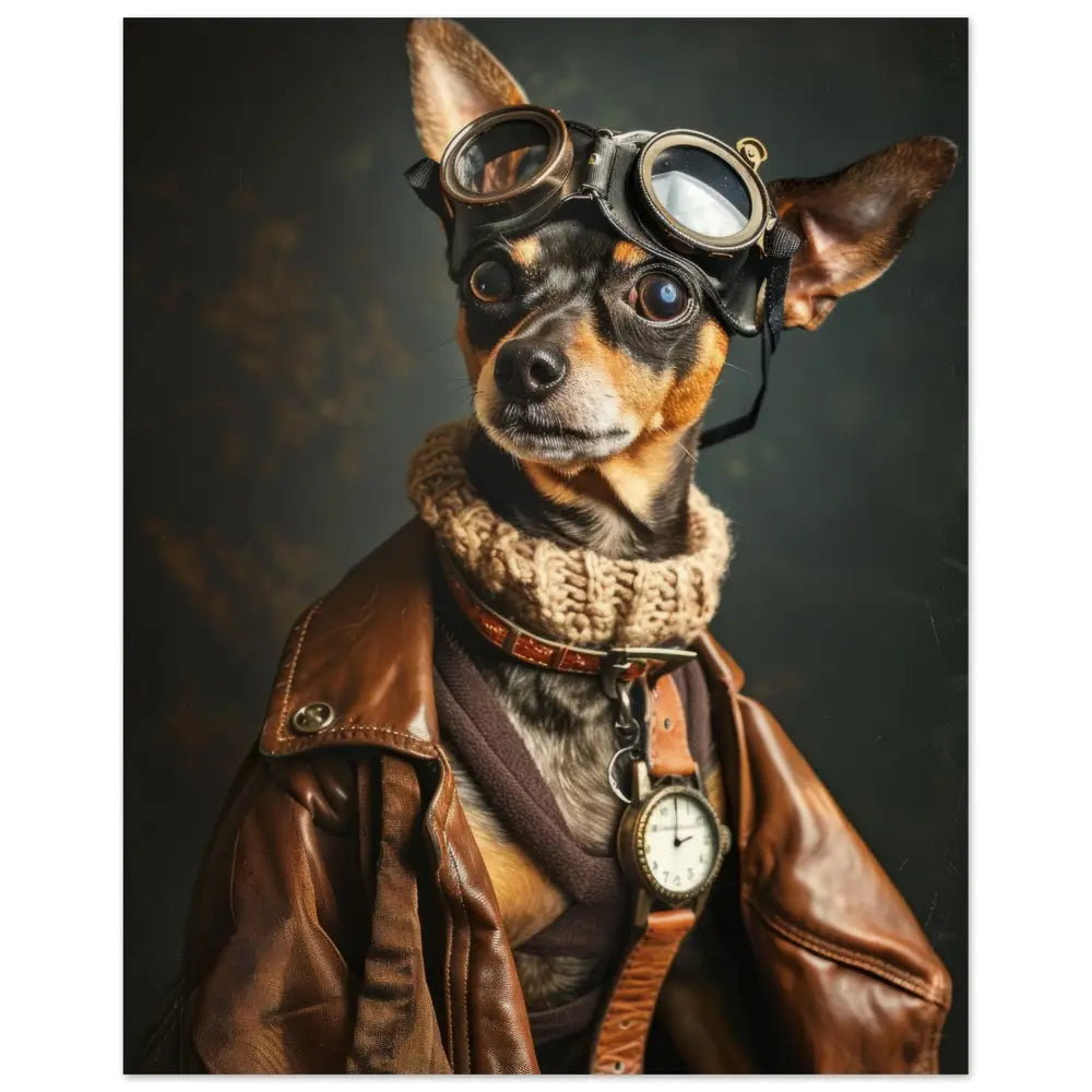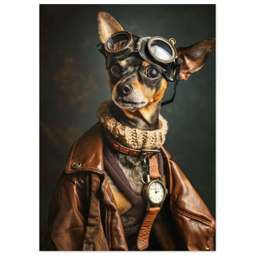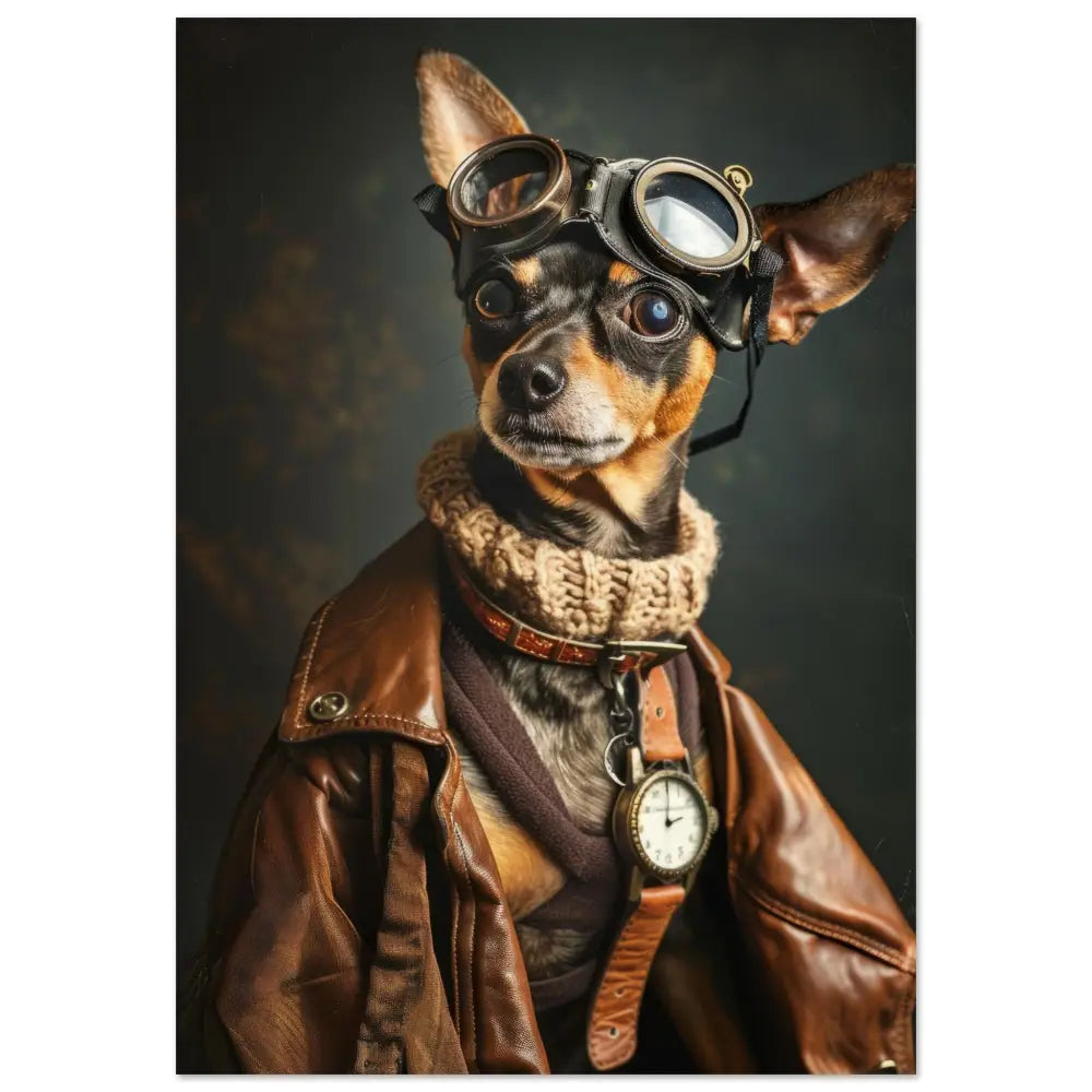 Deze afbeelding toont een dier, gekleed in een prachtige vintage steampunk outfit. Het draagt een stijlvolle, bruine leren jas met subtiele metalen accenten aan de schouders. Om de nek hangt een antieke gouden klok, die het geheel een elegante maar avontuurlijke uitstraling geeft. De kop wordt gesierd door een paar grote, retro-futuristische brillen met zwarte metalen details, wat de indruk wekt van een doorgewinterde ontdekkingsreiziger. De pootjes zijn versierd met leren accenten en contrasterende stiksels, die de outfit afronden. De achtergrond is mysterieus donker met een vage aanwezigheid van tandwielen en mechanische onderdelen.