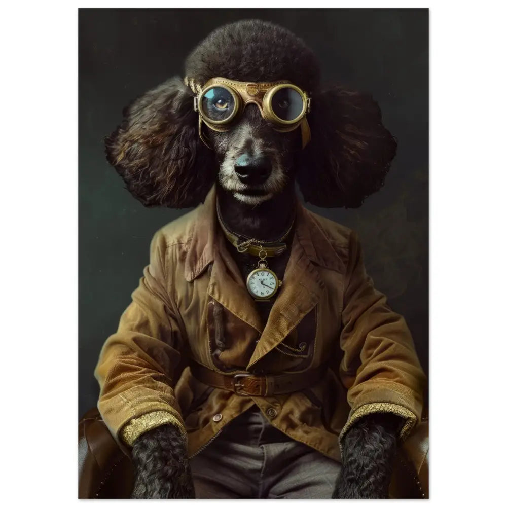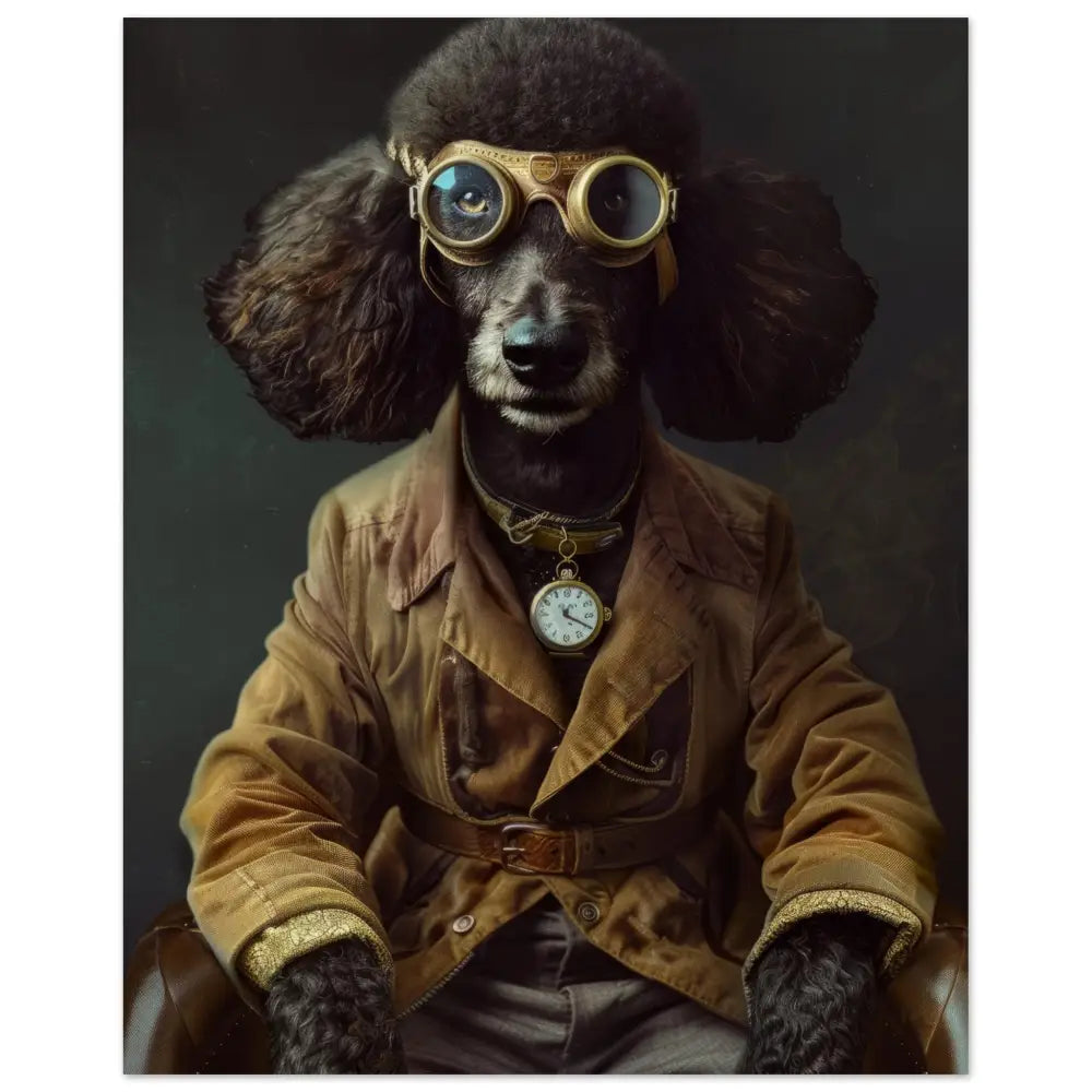 Deze afbeelding toont een dier, gekleed in een prachtige vintage steampunk outfit. Het draagt een verfijnde, bruine jas met subtiele gouden accenten en een riem die de taille benadrukt. Om de nek hangt een antieke zilveren klok, wat het geheel een klassieke uitstraling geeft. De kop wordt gesierd door een paar grote, messingkleurige retro-futuristische brillen met ingewikkelde metalen details en leren bandjes. De pootjes zijn versierd met luxueuze, goudgetinte bontachtige manchetjes, die elegantie en stijl uitstralen. De achtergrond is donker en mysterieus, waardoor het steampunk-thema wordt versterkt en het dier echt opvalt als een tijdreiziger.