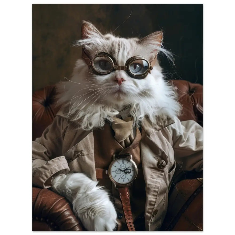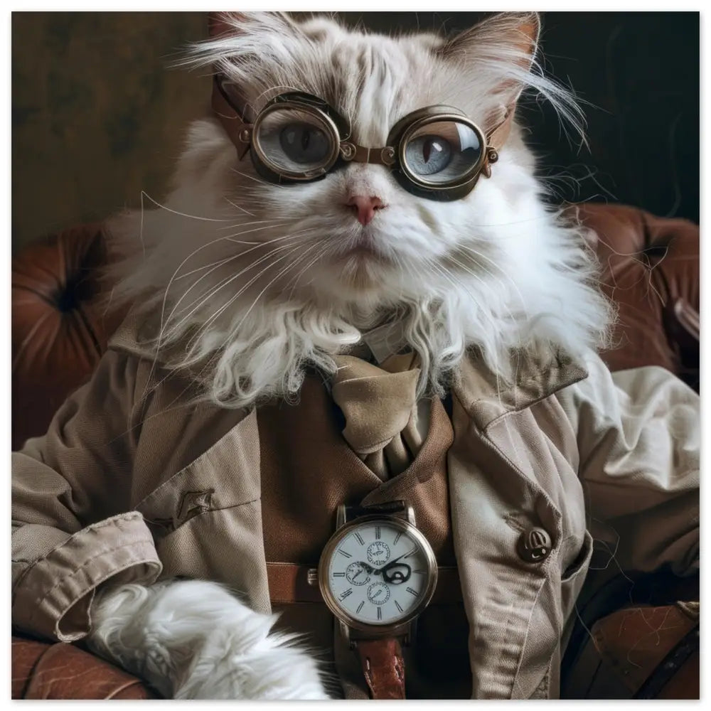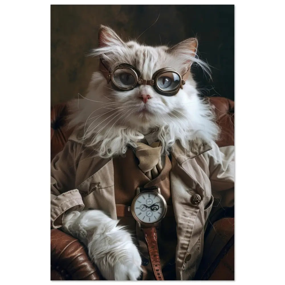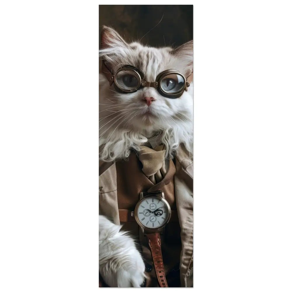 Dit schilderij toont een kat, gekleed in een prachtige vintage steampunk outfit. De kat draagt een elegante, beige jas met subtiele stiksels en leren accenten aan de manchetten. Om haar nek hangt een antieke gouden klok, die prachtig contrasteert met haar vacht en de jas. Haar kop wordt gesierd door een paar grote, retro-futuristische brillen met bronzen metalen details, waardoor ze een mysterieuze en avontuurlijke uitstraling heeft. Haar pootjes zijn versierd met leren bandjes die het geheel afmaken. De achtergrond van de afbeelding heeft een rustieke, antieke uitstraling, wat de vintage sfeer versterkt.