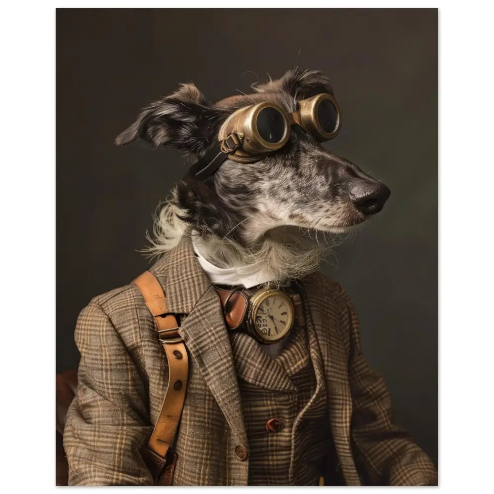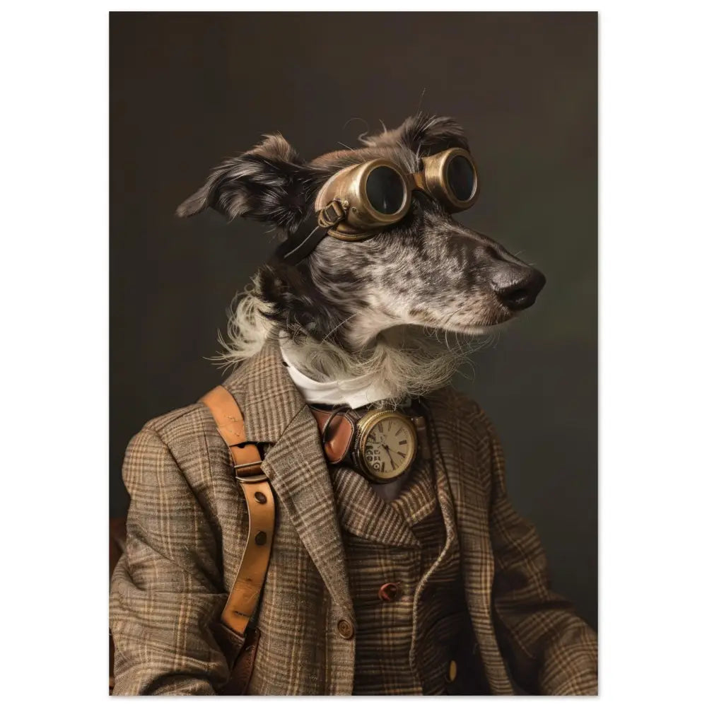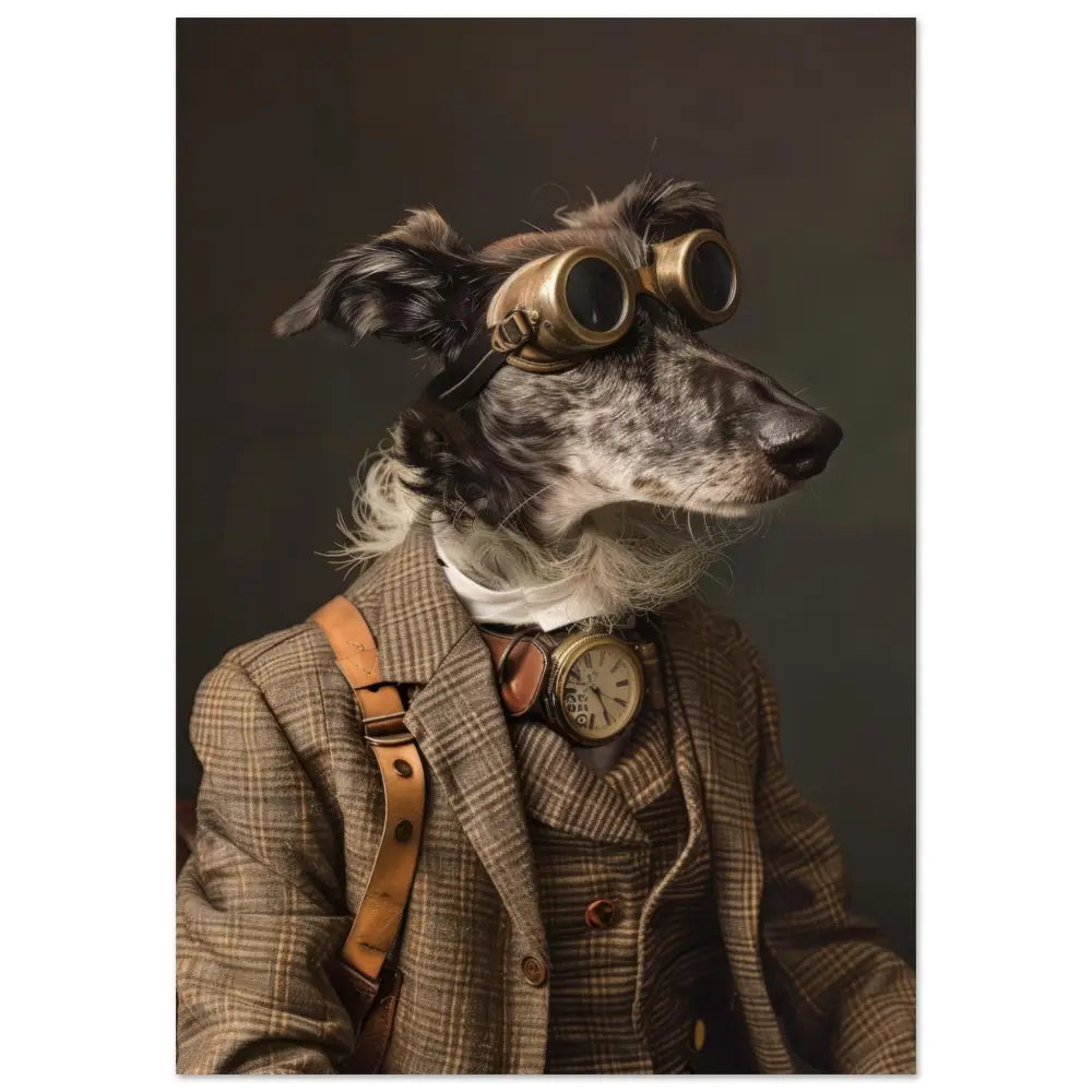 Deze afbeelding toont een dier, gekleed in een prachtige vintage steampunk outfit. Het draagt een verfijnde, geruite bruine jas met subtiele lijnen en knopen in houten tinten. Om de nek hangt een antieke gouden klok, wat een gevoel van historie en elegantie toevoegt. De kop wordt gesierd door een robuuste, retro-futuristische bril met bronzen metalen details, die het karakter van een dappere ontdekkingsreiziger accentueert. Leren riemen en een witte, pluizige manchet aan de kraag completeren de look. De achtergrond is donker en mysterieus, wat de aandacht volledig richt op het stijlvolle dier en zijn uitgebreide outfit.