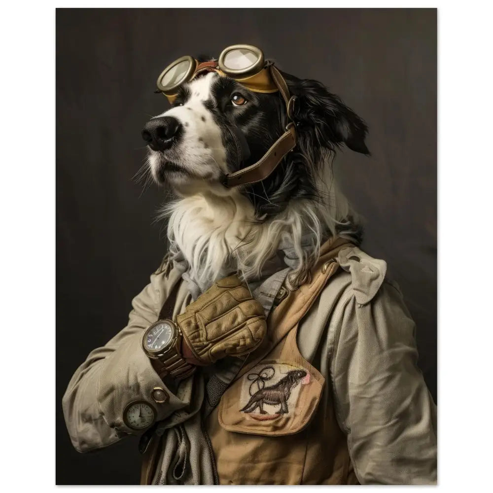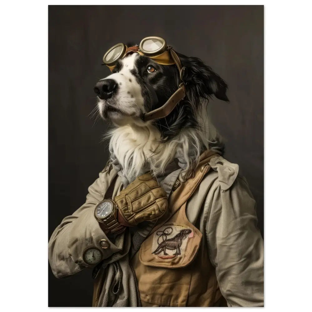 Deze afbeelding toont een dier, gekleed in een prachtige vintage steampunk outfit. Het draagt een stijlvolle, beige jas met subtiele patronen en gedetailleerde accenten. Om de nek hangt een antieke, bronzen klok, die een extra vleugje elegantie toevoegt. Het hoofd van het dier is voorzien van een artistiek paar gouden brillen met ingewikkelde metalen details, waaronder een lederen riempje. De pootjes zijn sierlijk versierd met gedetailleerde leren handschoenen en bontachtige manchetjes. Op de schouder prijkt een geborduurde insigne die het steampunk-thema compleet maakt. De donkere, fluwelen achtergrond creëert een dramatisch contrast, wat de allure van het portret versterkt.