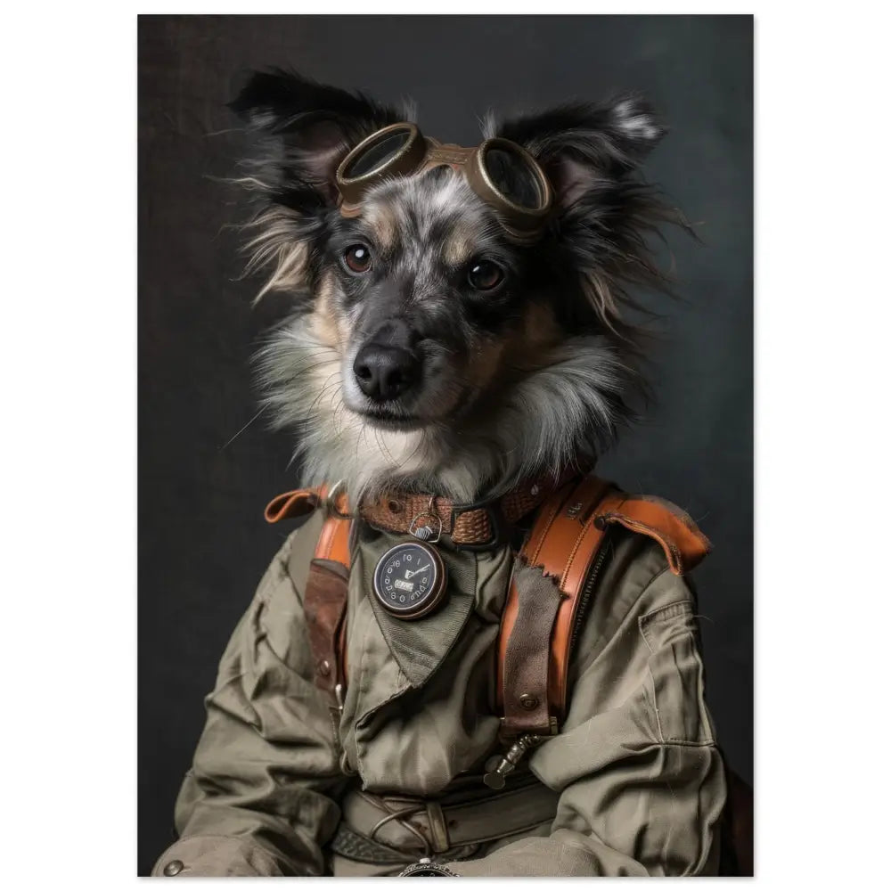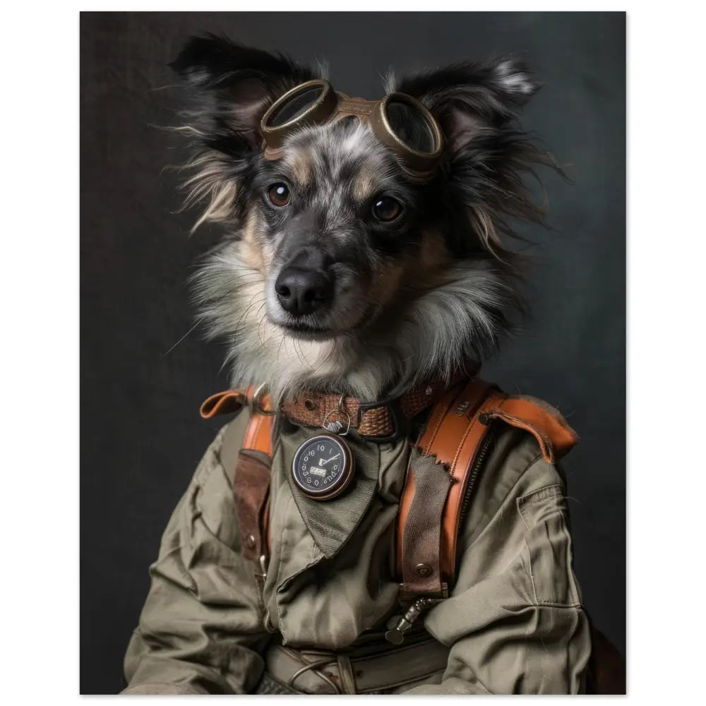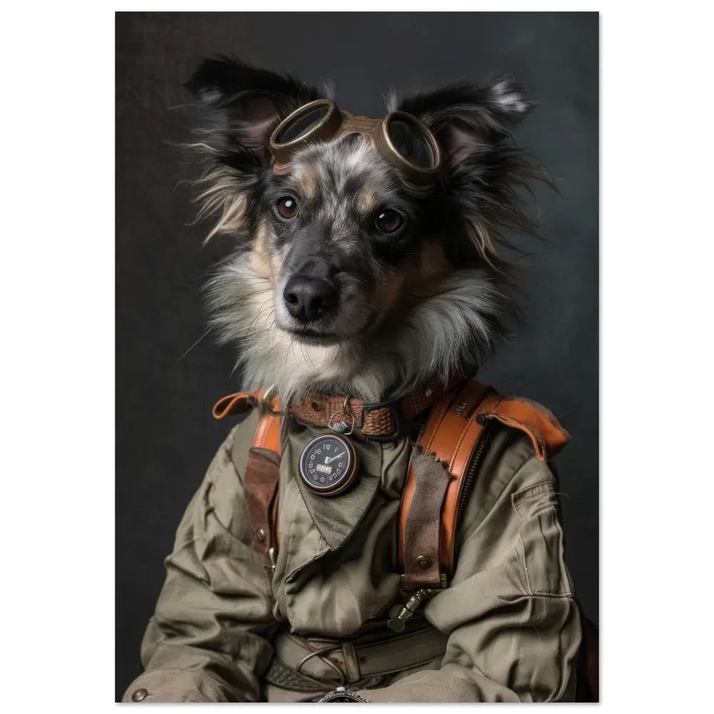 Deze afbeelding toont een dier, gekleed in een prachtige vintage steampunk outfit. Het draagt een elegant groene jas met subtiele, ingewerkte ritsen en leren accenten. Om de nek hangt een antieke bronzen klok, die de stoere uitstraling versterkt. De kop wordt gesierd door een paar grote, retro-futuristische brillen met metalen details in messingkleur, waardoor deze eruitziet als een avontuurlijke tijdreiziger. De pootjes zijn versierd met bruin lederen riempjes en contrasterende stiksels, die het geheel afmaken. De achtergrond is donker en mysterieus, met een industriële flair dat de steampunk esthetiek benadrukt.