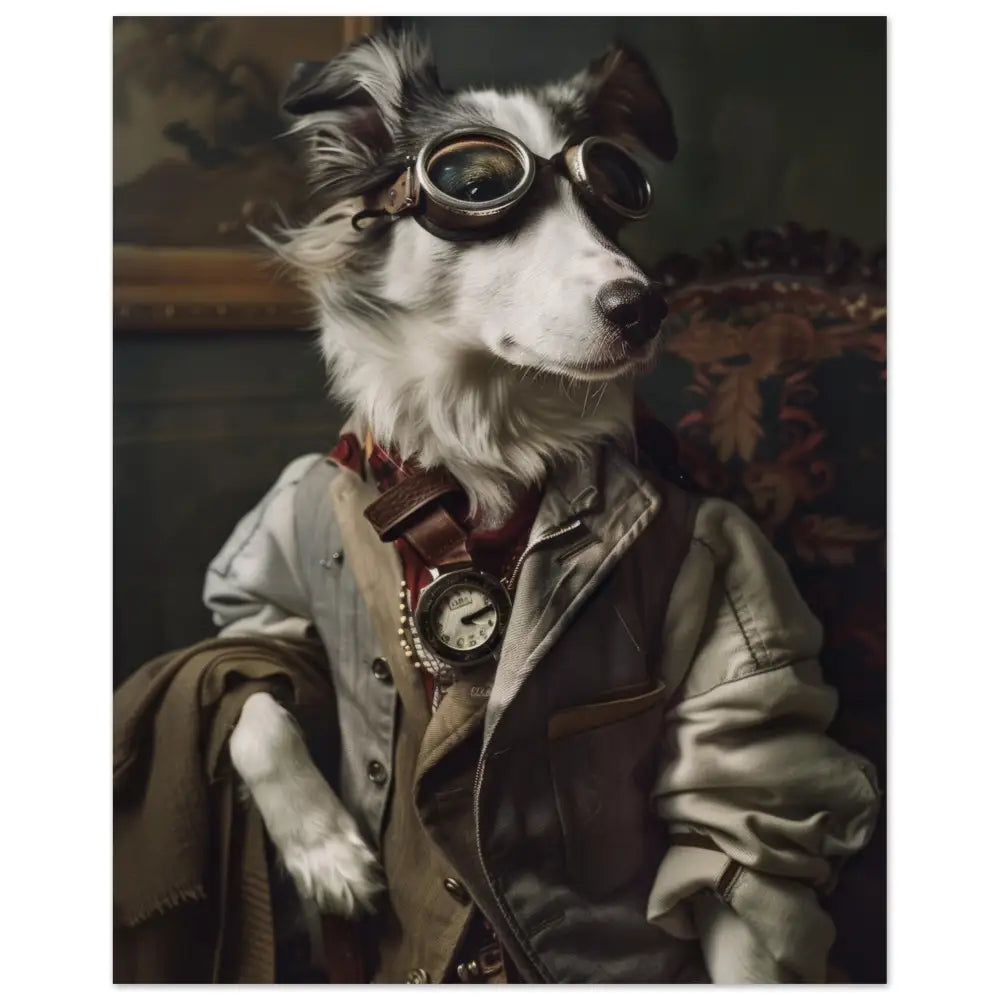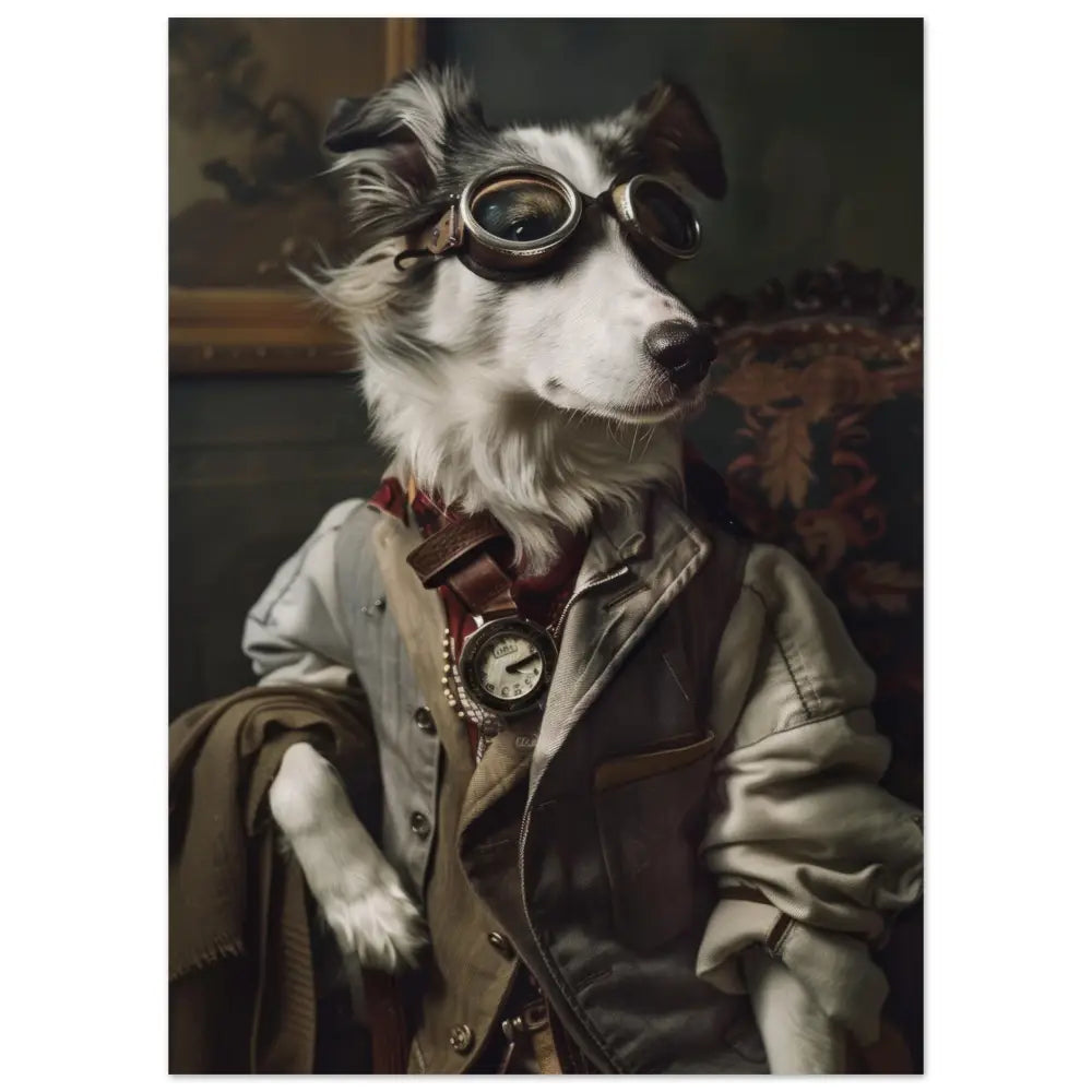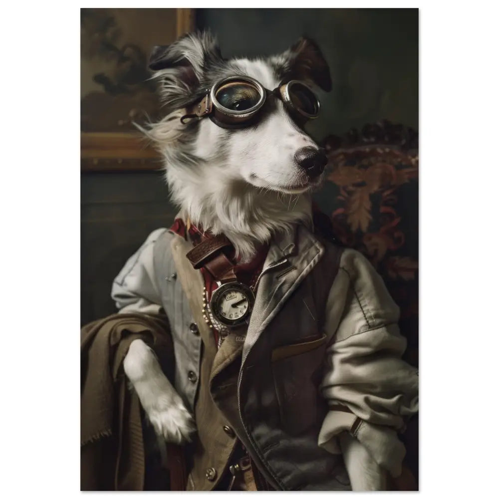 Deze afbeelding toont een dier, gekleed in een prachtige vintage steampunk outfit. Het draagt een stijlvolle grijs-beige jas met subtiele patronen en verfijnde accenten die een klassieke uitstraling geven. Om de nek hangt een antieke bronzen klok, die een tijdloze elegantie toevoegt. De kop wordt gesierd door een paar grote, bronzen retro-futuristische brillen met metalen details, wat het geheel een avontuurlijke flair geeft. De pootjes zijn voorzien van luxe, beige leren manchetjes die het geheel complementeren. De achtergrond toont een kunstzinnig schilderij, wat bijdraagt aan de nostalgische en elegante sfeer van het portret.