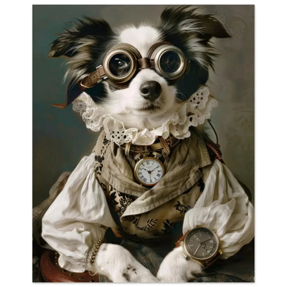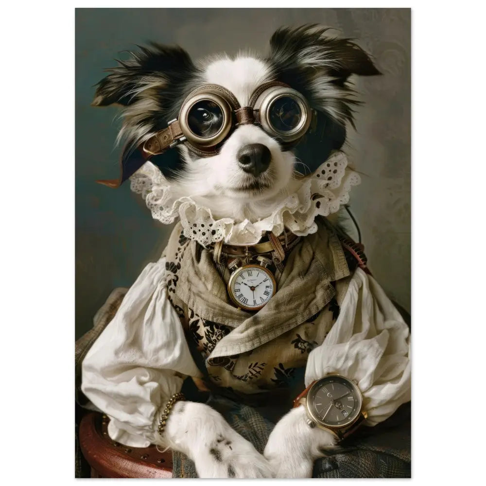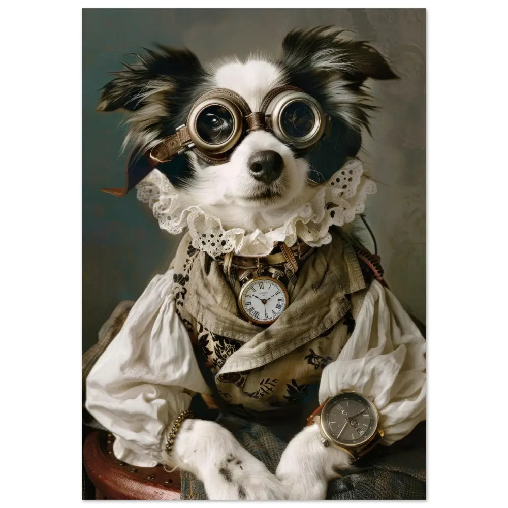Deze afbeelding toont een dier, gekleed in een prachtige vintage steampunk outfit. Het draagt een sierlijke, beige jas met ingewikkelde zwarte patronen en fluwelen accenten. Om de nek hangt een antieke zilveren klok, die de aristocratische uitstraling versterkt. De kop wordt gesierd door een paar grote, retro-futuristische brillen met metalen details in bronzen kleur, waardoor deze eruitziet als een avontuurlijke tijdreiziger. De pootjes zijn voorzien van elegante, witte bontachtige manchetjes die het geheel afmaken. De afbeelding heeft een gedetailleerde achtergrond die een romantische vintage sfeer oproept met subtiele mechanische elementen.