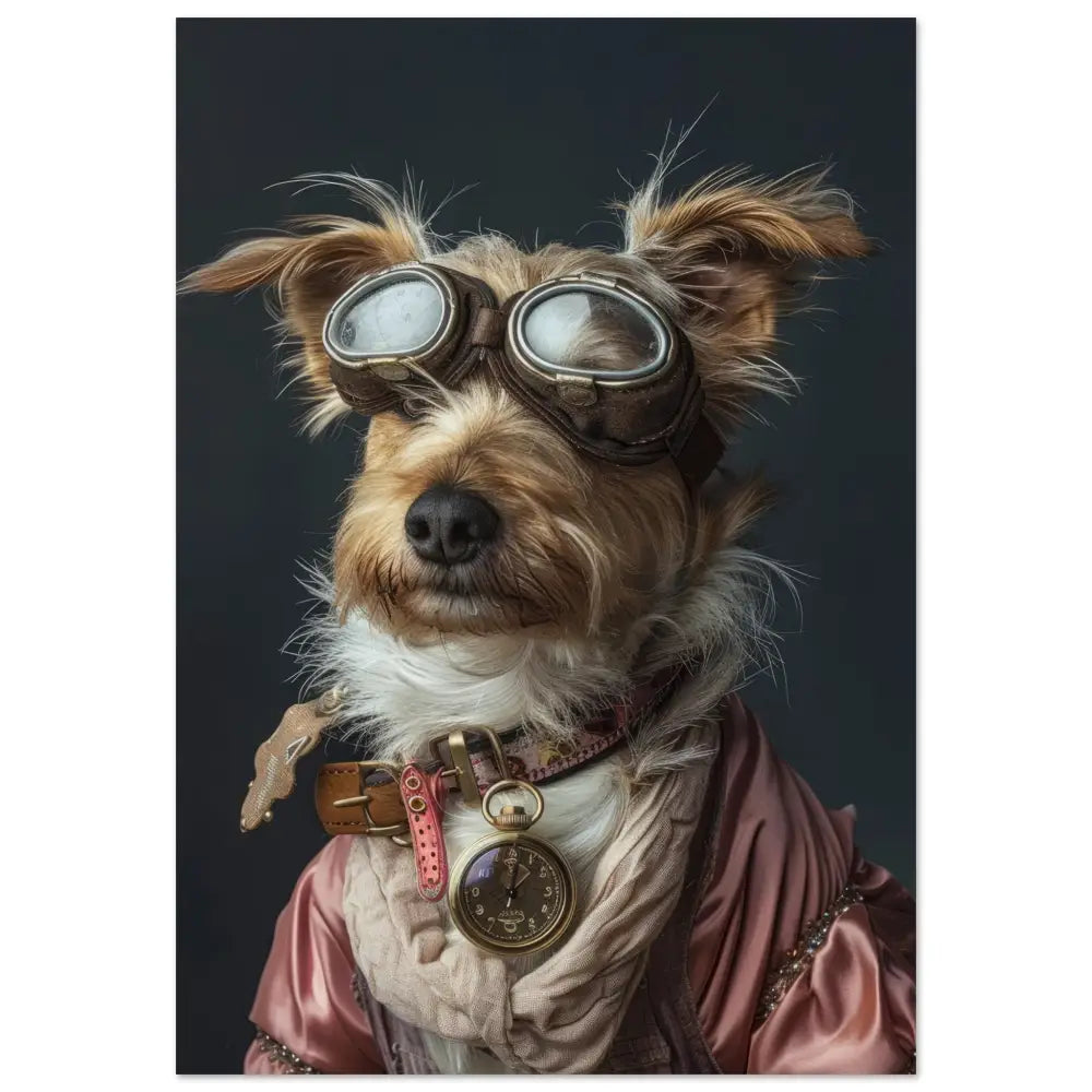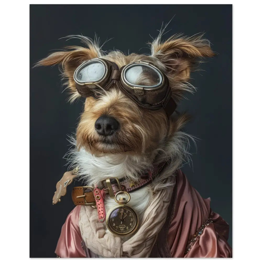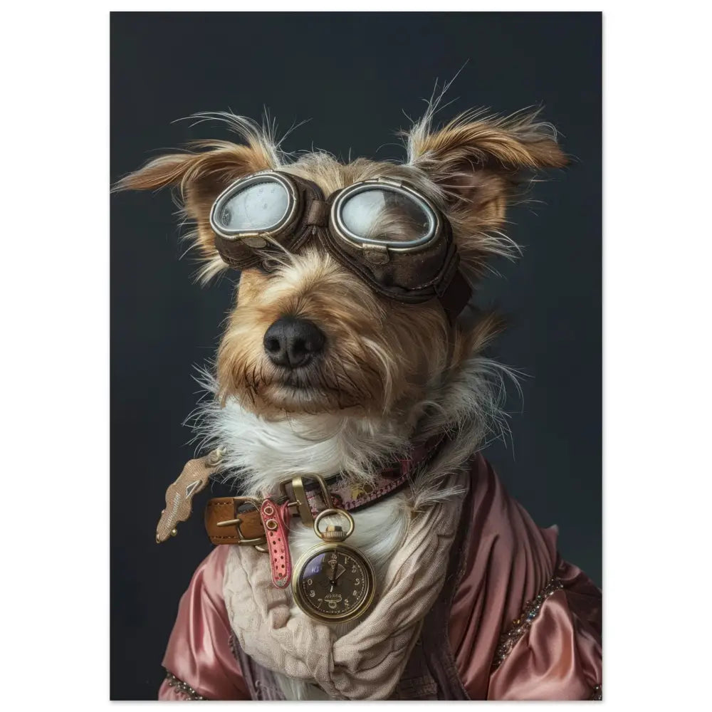 Deze afbeelding toont een dier, gekleed in een prachtige vintage steampunk outfit. Het draagt een sierlijke, roze jas met glanzende stof en subtiele kralenversieringen. Om de nek hangt een antieke, gouden klok die een toonbeeld is van verfijning en tijdloosheid. Het hoofd is gesierd met een paar grote, retro-futuristische brillen met robuuste, metalen details in bronskleur, wat een avontuurlijke sfeer toevoegt. De pootjes zijn versierd met elegante linten en een zachte, crèmewitte sjaal die de uitstraling verder verrijkt. De achtergrond is simpel en donker, waardoor de geraffineerde details van het steampunk kostuum extra opvallen.