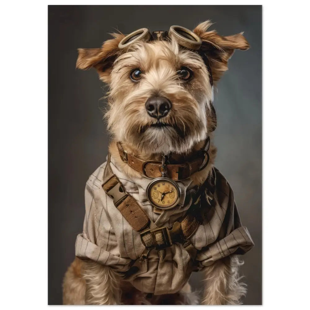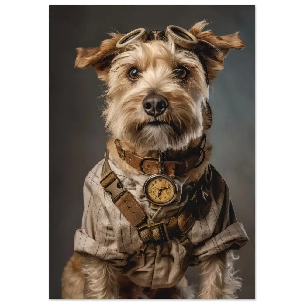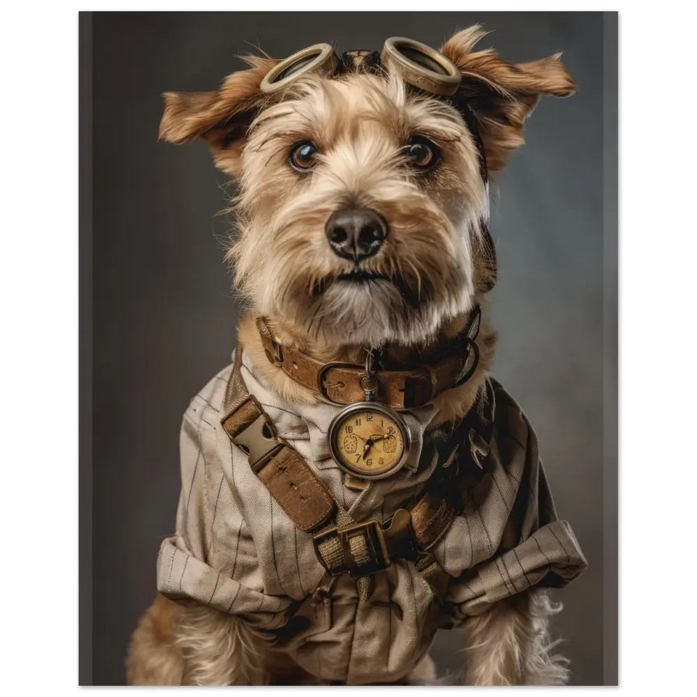 Deze afbeelding toont een dier, gekleed in een prachtige vintage steampunk outfit. Het draagt een stijlvolle, beige jas met dunne verticale strepen en leren accenten. Om de nek hangt een antieke gouden klok, die extra verfijning verleent. De kop is voorzien van een stoere, metalen bril met bronzen details, waardoor het dier een avontuurlijke air heeft. De pootjes zijn uitgerust met robuuste, leren riempjes die het geheel compleet maken. De achtergrond is sfeervol donker met een lichte rokerige gloed, wat de mystieke steampunk-atmosfeer prachtig benadrukt.
