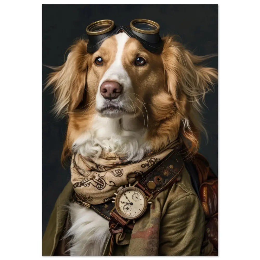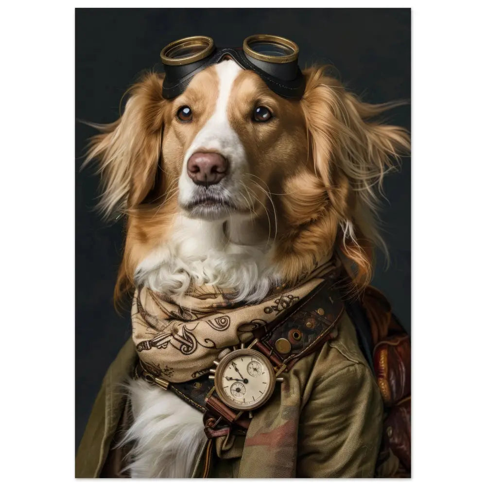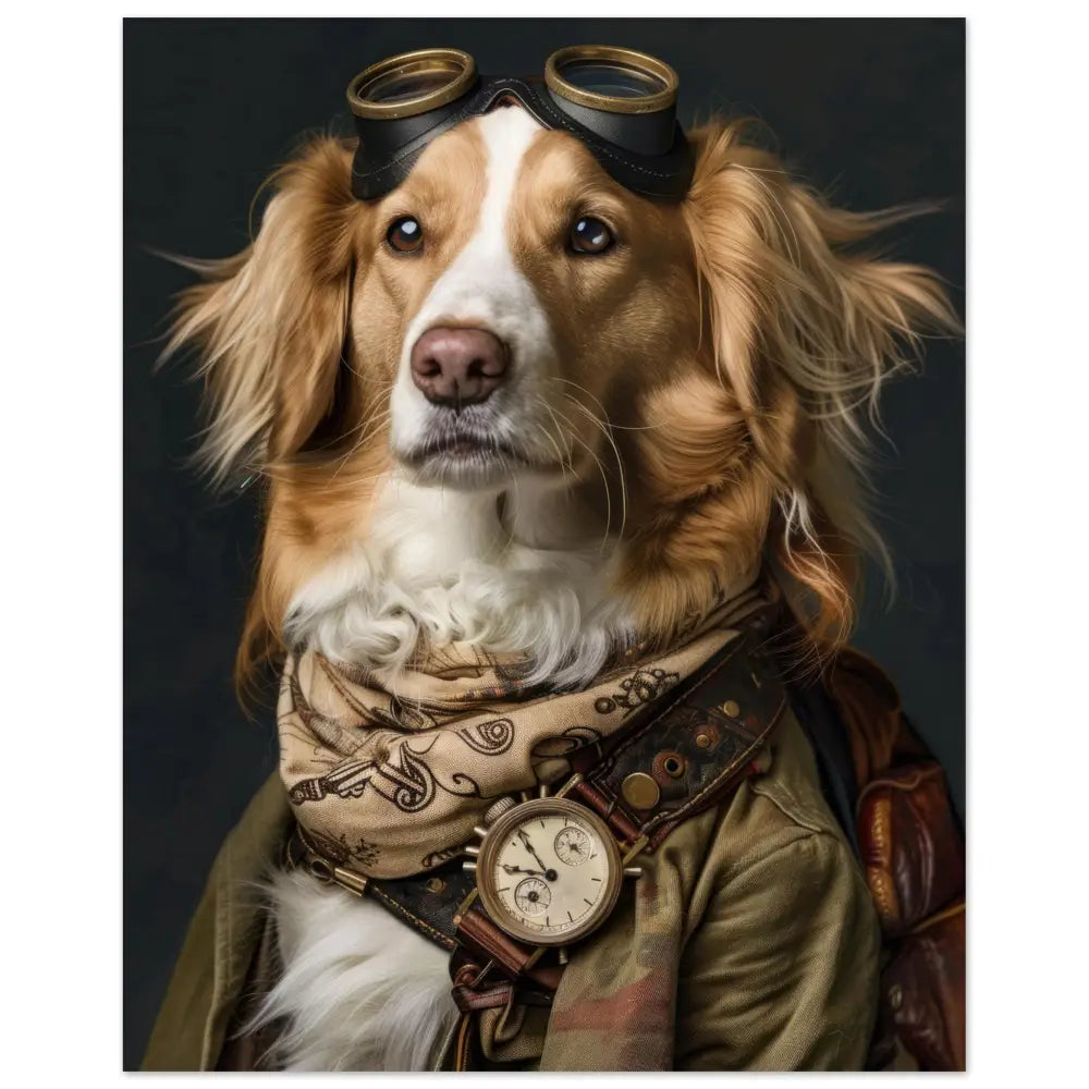 Deze afbeelding toont een dier, gekleed in een prachtige vintage steampunk outfit. Het draagt een stijlvolle, olijfkleurige jas met subtiele, militaire patronen en leren accenten. Om de nek van het dier hangt een antieke gouden klok, die een verfijnde tijdloze uitstraling geeft. Op het hoofd prijkt een paar grote, robuuste steampunk-brillen met metalen details in een antiek bronzen kleur, wat bijdraagt aan de avontuurlijke sfeer. De pootjes zijn versierd met verfijnde, crèmekleurige faux-bont manchetjes die het geheel afronden. De achtergrond is donker en mysterieus, perfect passend bij het tijdloze steampunk-thema.