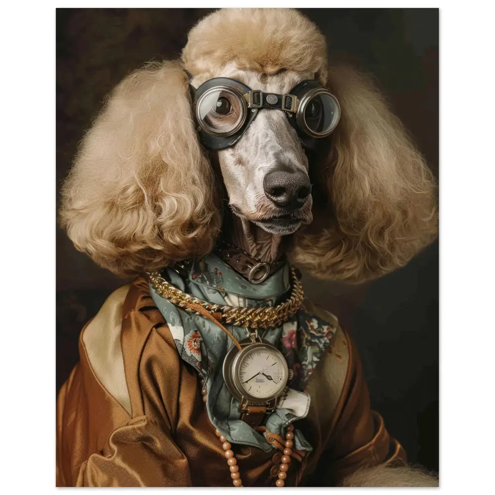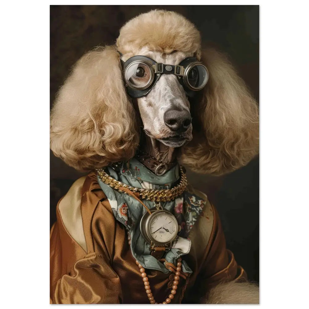 Deze afbeelding toont een dier, gekleed in een prachtige vintage steampunk outfit. Het draagt een zijdeachtige, koperkleurige jas met delicate patronen en lichte crèmekleurige accenten. Om de nek hangt een antieke zilveren klok, die de stijlvolle uitstraling benadrukt. De kop wordt gesierd door indrukwekkende retro-futuristische brillen met metalen details in een donkere bronstint, waardoor deze eruitziet als een avontuurlijke tijdreiziger. De pootjes zijn voorzien van elegante, zachte manchetjes die het geheel een koninklijke flair geven. De achtergrond bestaat uit een mysterieuze, schaduwrijke setting, waardoor het dier nog meer opvalt en allure krijgt.
