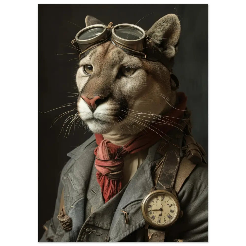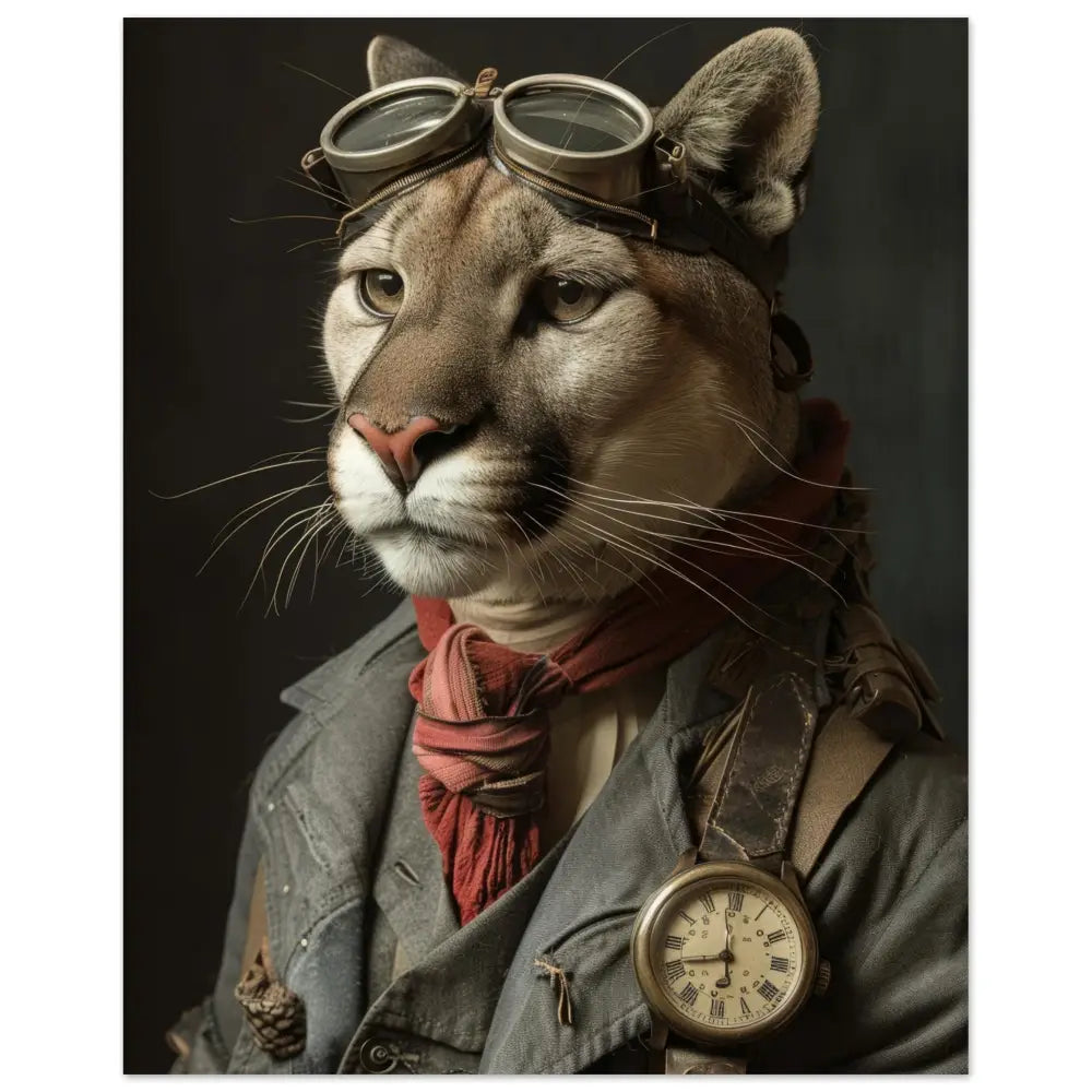 Deze afbeelding toont een dier, gekleed in een prachtige vintage steampunk outfit. Het draagt een elegante, grijze jas met subtiele stiksels en lederen accenten op de schouders. Om de nek hangt een antieke gouden klok, die schittert en een nobele uitstraling geeft. De kop wordt gesierd door een paar grote, retro-futuristische brillen met metalen details in een bronzen kleur, wat een avontuurlijke charme toevoegt. De pootjes en rug zijn versierd met ruige, leren accessoires die het geheel compleet maken. De donkere achtergrond benadrukt het sfeervolle en mysterieuze karakter van deze kunstige afbeelding.