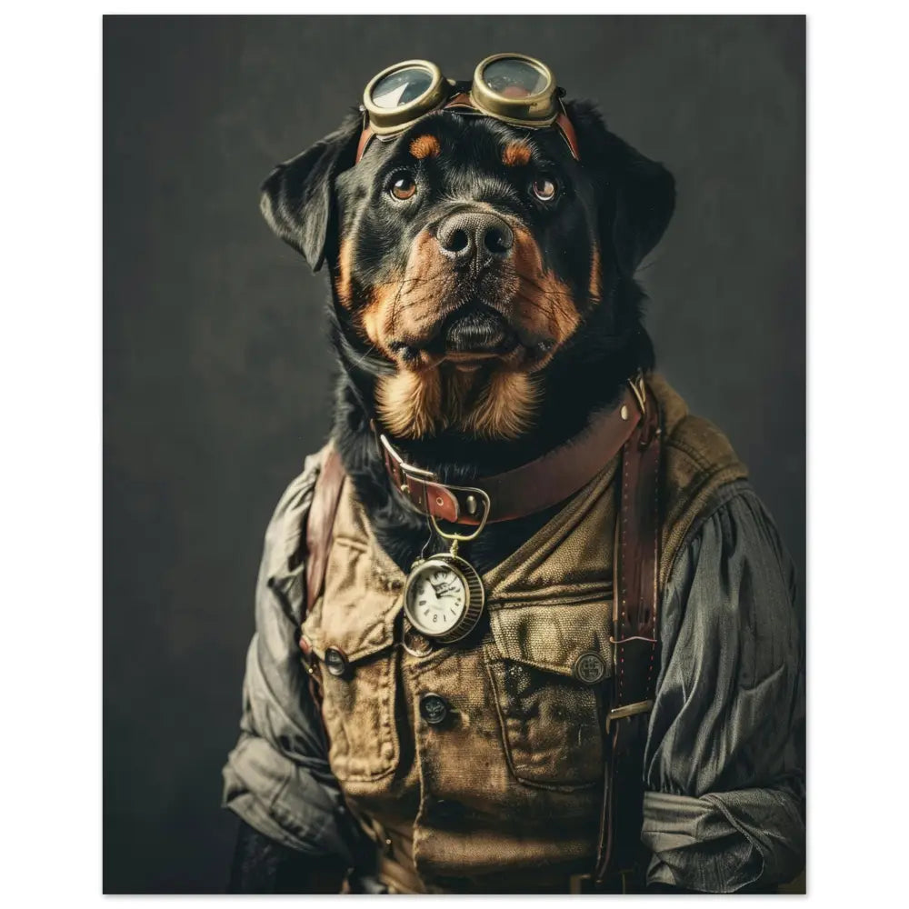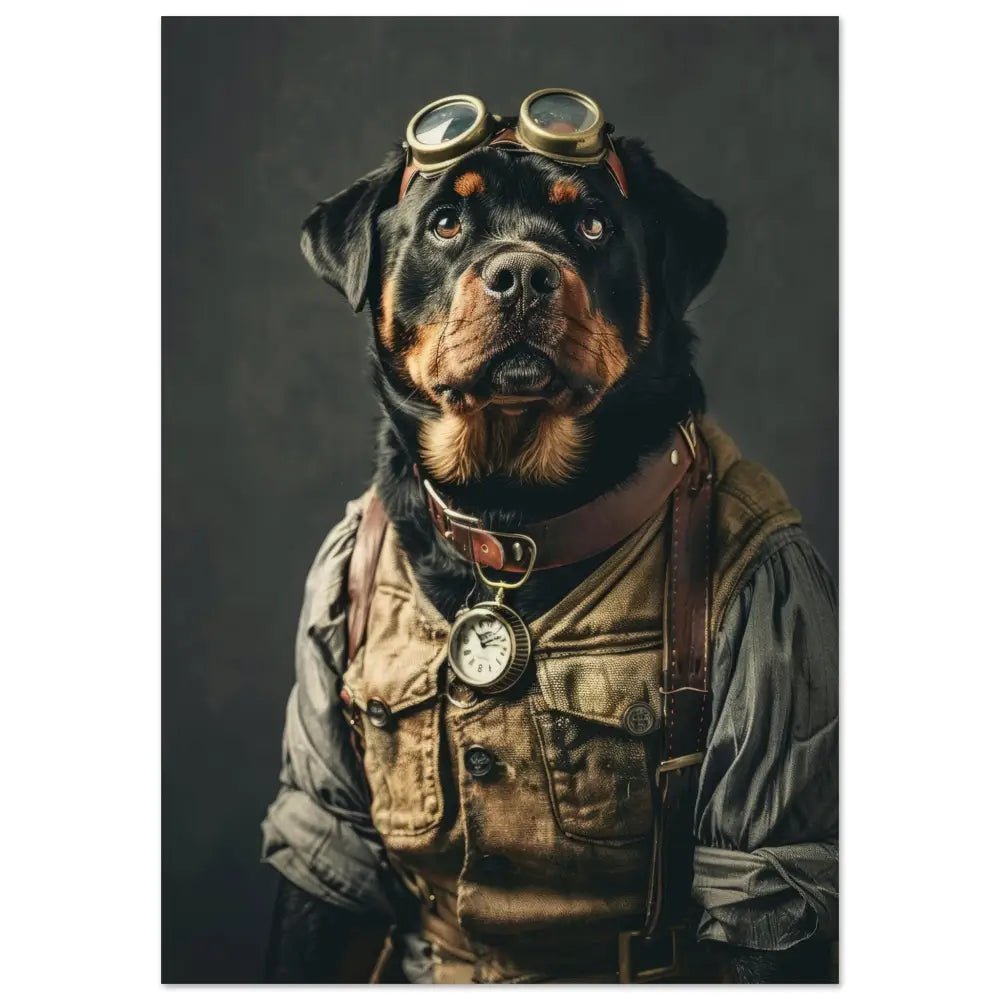 Deze afbeelding toont een dier, gekleed in een prachtige vintage steampunk outfit. Het draagt een stijlvolle beige jas met subtiele patronen en leren accenten. Om de nek hangt een antieke zilveren klok, die het geheel een klassieke uitstraling geeft. De kop wordt gesierd door een paar grote, retro-futuristische brillen met gouden metalen details, waardoor deze eruitziet als een gedistingeerde ontdekkingsreiziger. De pootjes zijn voorzien van verfijnde, leren riempjes en contrasterende stiksels. De achtergrond is eenvoudig, waardoor de aandacht volledig naar het gedetailleerde tenue van het dier wordt getrokken.