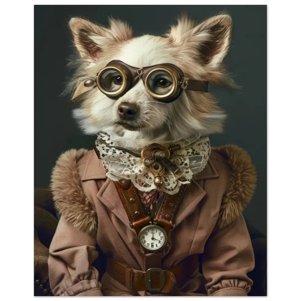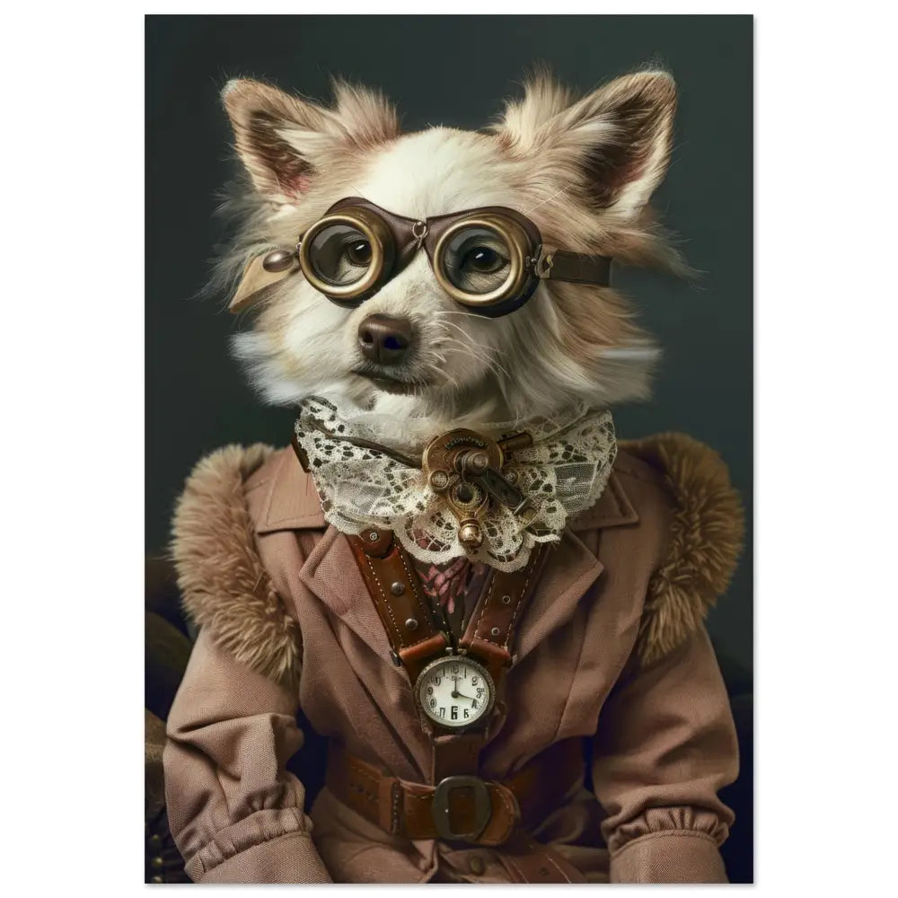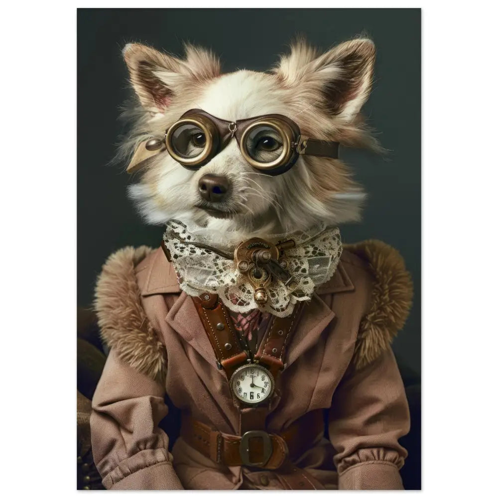 Deze afbeelding toont een dier, gekleed in een prachtige vintage steampunk outfit. Het draagt een elegante, beige jas met zijdeachtige textuur en gedetailleerde stiksels. Om de nek hangt een antieke bronzen klok, die de verfijnde look van het schilderij accentueert. De kop wordt gesierd door een paar grote, bruingekleurde brillen met luxe gouden metalen details, wat het geheel een avontuurlijke uitstraling geeft. De voorpoten zijn voorzien van zachte, beige bontachtige manchetjes en stijlvolle leren riemen, terwijl de achtergrond subtiel donker is gehouden om het dier in het middelpunt van de aandacht te plaatsen.