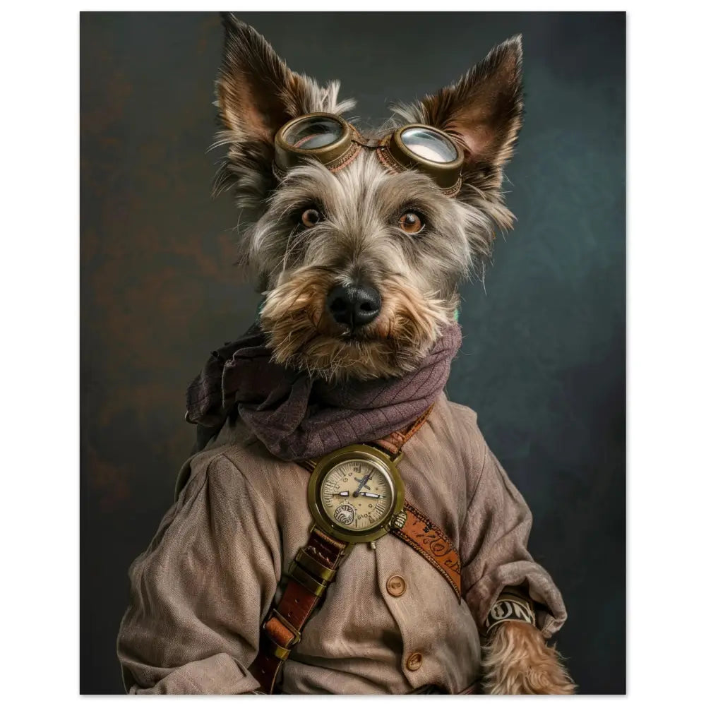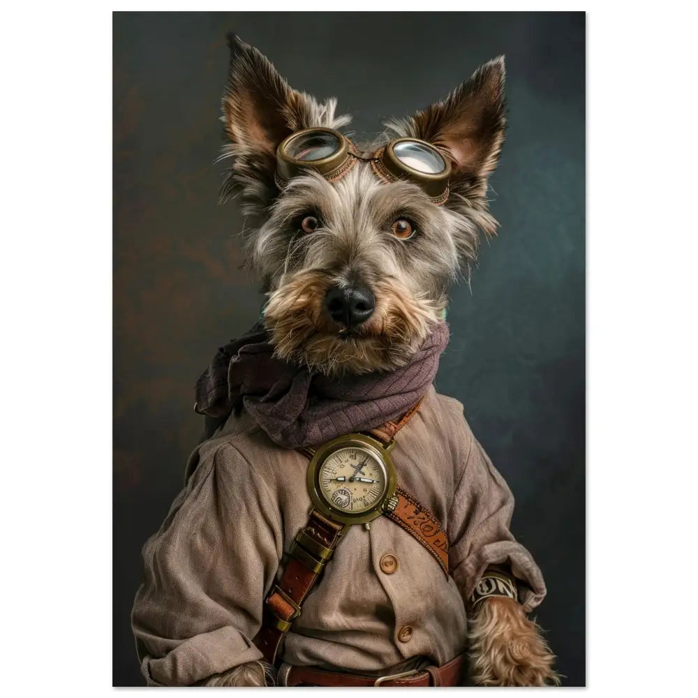 Deze afbeelding toont een dier, gekleed in een prachtige vintage steampunk-outfit. Het draagt een zandkleurige jas met subtiele accenten en een gestreepte sjaal rond de nek. Om de nek bungelt een antieke klok in een bronzen behuizing, die de elegantie van het ensemble benadrukt. Het hoofd van het dier is versierd met een stoere bril, voorzien van robuuste metalen details in koperkleur. De pootjes zijn afgewerkt met leren riemen en knopen, die een ruige maar verfijnde uitstraling geven. De achtergrond is mysterieus en grijsgroen, waardoor het geheel een enigszins dramatische sfeer krijgt.