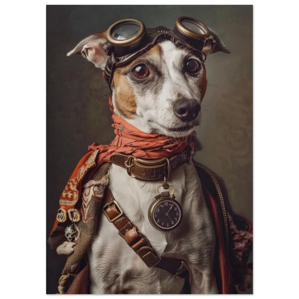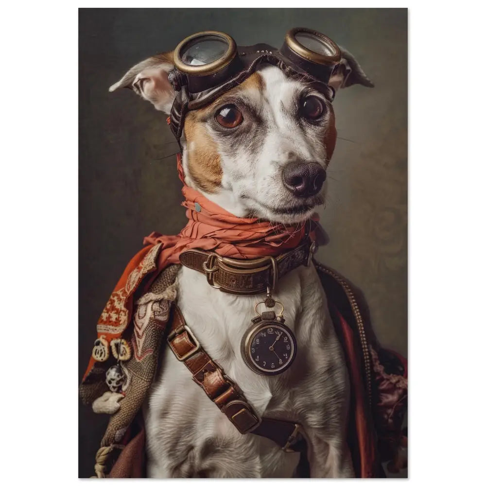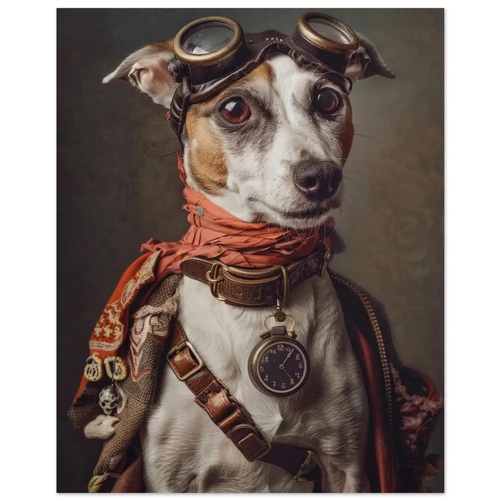 Deze afbeelding toont een dier, gekleed in een prachtige vintage steampunk outfit. Het draagt een gedetailleerde, rode jas met complex geweven patronen en subtiele stoffen accenten. Om de nek van het dier hangt een antieke, bronzen klok die de tijdloze elegantie van deze stijl benadrukt. De kop is voorzien van een paar robuuste, retro-futuristische brillen met bronzen metalen details, die het geheel een avontuurlijke uitstraling geven. De voorpoten worden geaccentueerd door lederen riemen en contrasterende stiksels. De achtergrond bestaat uit een grof geschilderd canvas met een antiek patroon, wat de nostalgische charme van deze steampunk compositie versterkt.