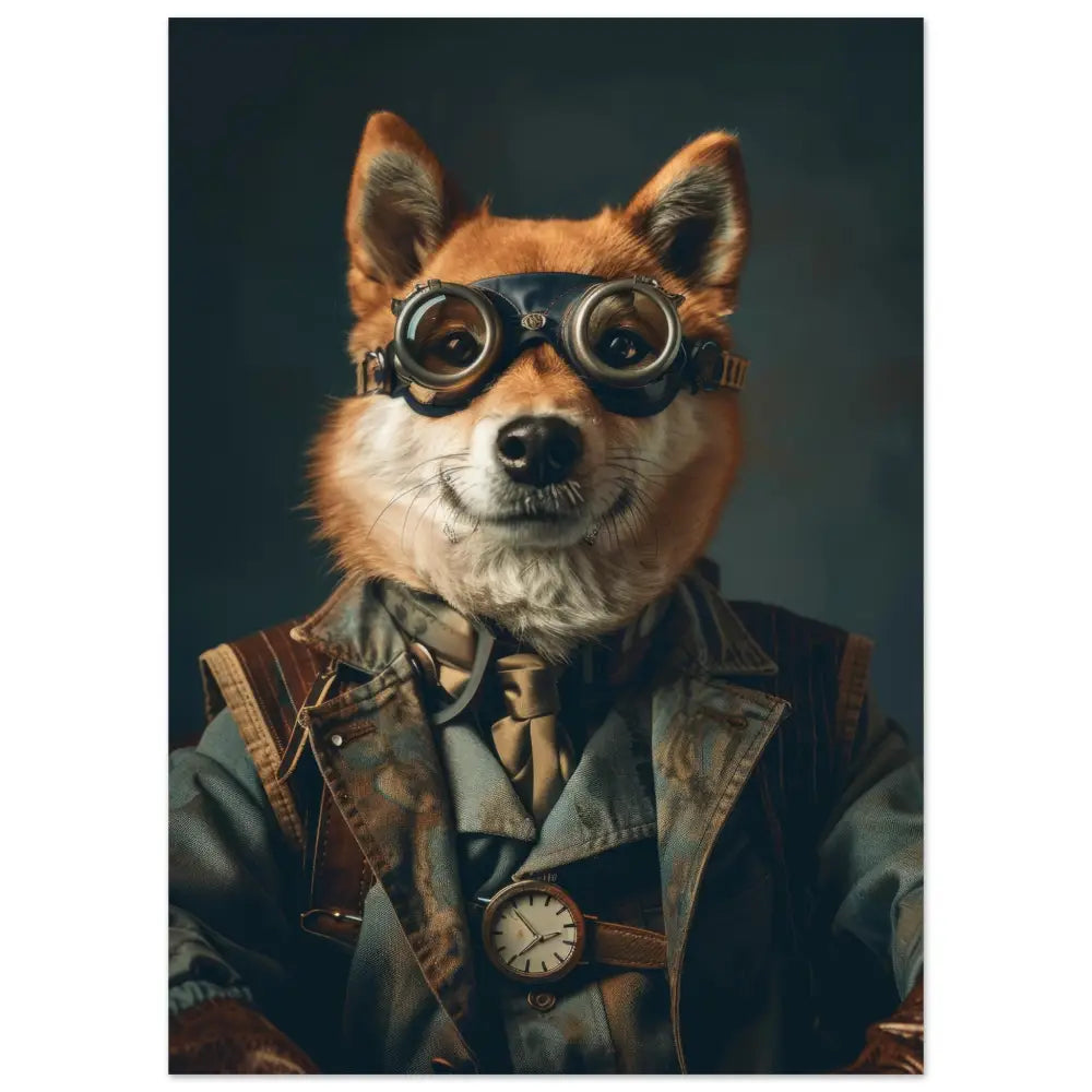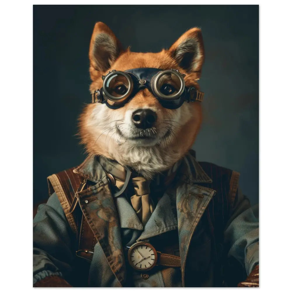 Deze afbeelding toont een dier, gekleed in een prachtige vintage steampunk outfit. Het draagt een stoere, grijsblauwe jas met verweerde patronen en leren accenten, die een avontuurlijke indruk wekken. Om de nek hangt een antieke gouden klok met een wit gezicht, die elegant contrasteert met de rest van de outfit. Op de kop bevindt zich een set robuuste, bronzen bril met ingewikkelde metalen details, wat de uitstraling van een ontdekkingsreiziger versterkt. De pootjes hebben verfijnde leren manchetbanden die het geheel stijlvol afmaken. De achtergrond is een sombere, industriële setting, passend bij het steampunk thema.