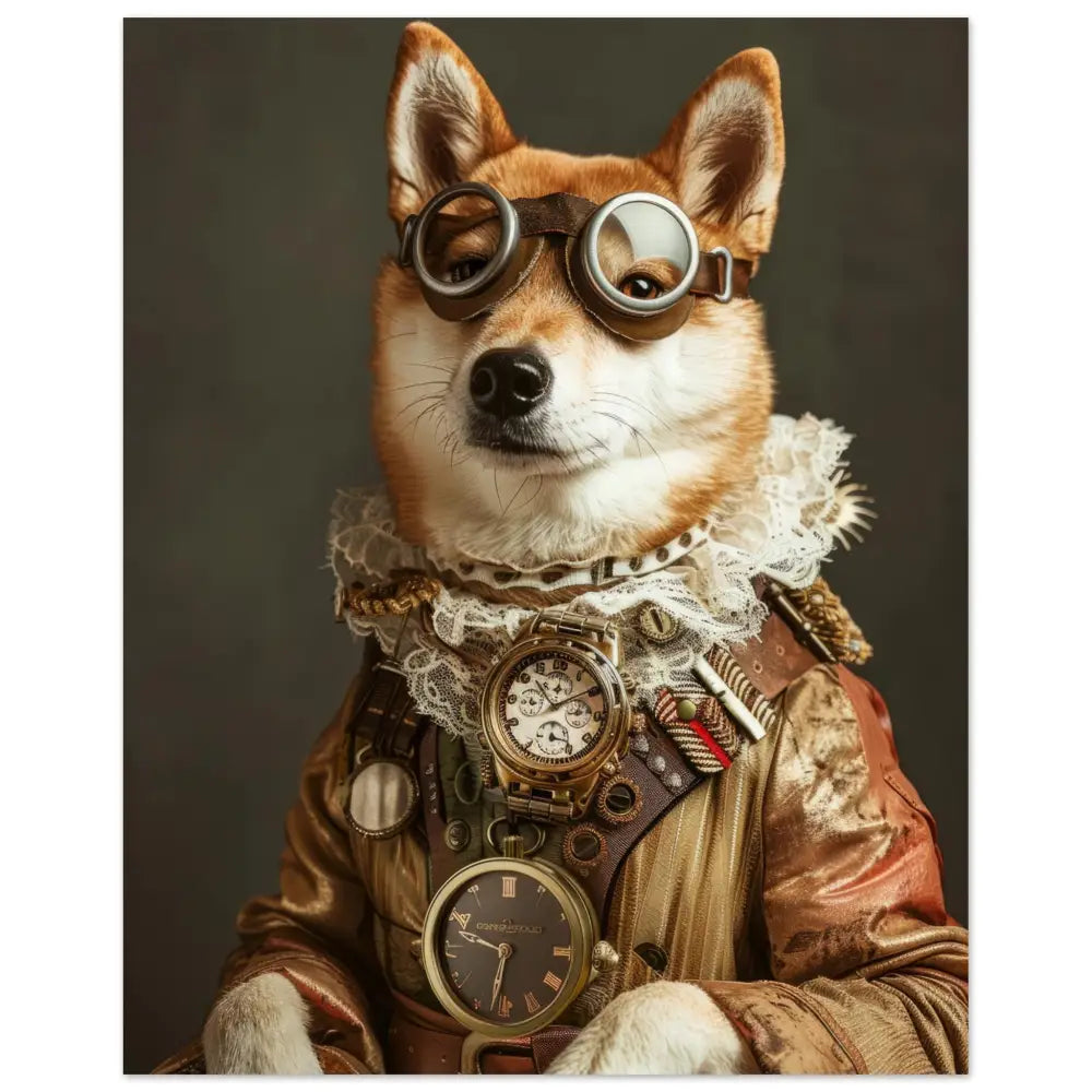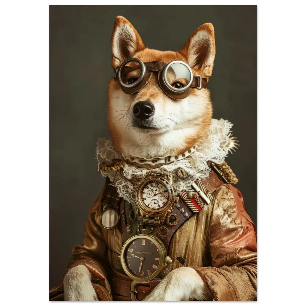Deze afbeelding toont een hond, gekleed in een prachtige vintage steampunk outfit. Het draagt een adembenemende, koperen jas met glinsterende patronen en bronzen accenten. Om de nek hangt een elegante antieke klok in gouden tinten, die de luxueuze uitstraling van het totaalbeeld benadrukt. De kop van de hond is voorzien van een stoere, retro-futuristische bril met zilverkleurige metalen details, waardoor het een onbevreesde ontdekkingsreiziger lijkt. De poten zijn omgeven door verfijnde, ivoorkleurige bontachtige manchetjes, leren riem accenten, en contrasterende zwarte stiksels. De achtergrond is donker en mystiek, wat de steampunk sfeer benadrukt.