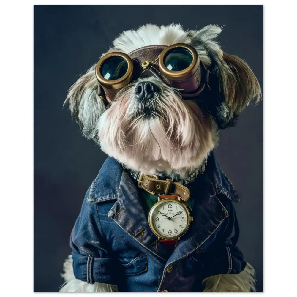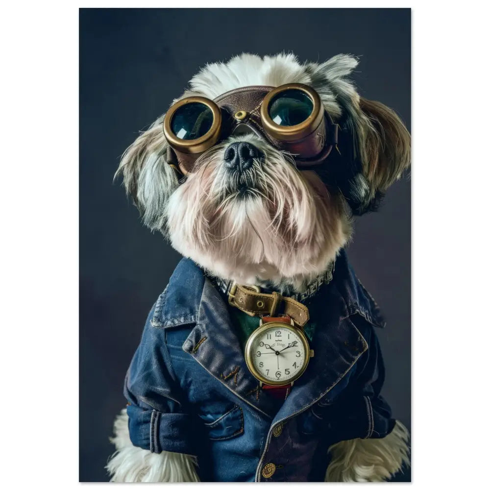 Deze afbeelding toont een dier, gekleed in een prachtige vintage steampunk outfit. Het draagt een stijlvolle, donkerblauwe jas met subtiele rafel- en slijtagepatronen die diepte en karakter toevoegen. Om de nek hangt een antieke gouden klok, die warm afsteekt tegen de koele tinten van de jas. Het hoofd wordt gesierd door imposante, retro-futuristische brillen met metalen details in roestkleur, wat resulteert in een warme, nostalgische uitstraling. De pootjes zijn afgezet met elegante, witte, bontachtige manchetjes die het geheel afronden. De achtergrond is een rustig, donkerblauw canvas dat de nadruk legt op het geportretteerde dier en zijn outfit.