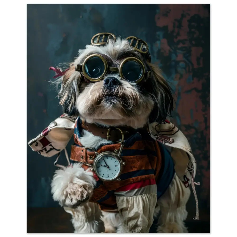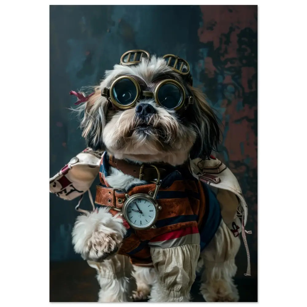 Deze afbeelding toont een dier, gekleed in een prachtige vintage steampunk outfit. Het draagt een elegante, bruine jas met subtiele strepen en leren accenten. Om de nek hangt een antieke zilveren klok, die een vleugje tijdloze charme toevoegt. De kop wordt gesierd door een paar grote, retro-futuristische brillen met metalen details in bronskleur, waardoor het een avontuurlijke uitstraling krijgt. De pootjes zijn voorzien van zachte, witte bontachtige manchetjes die het geheel afmaken. De achtergrond is donker met vervaagde patronen, wat de focus op het dier en zijn bijzondere outfit legt.