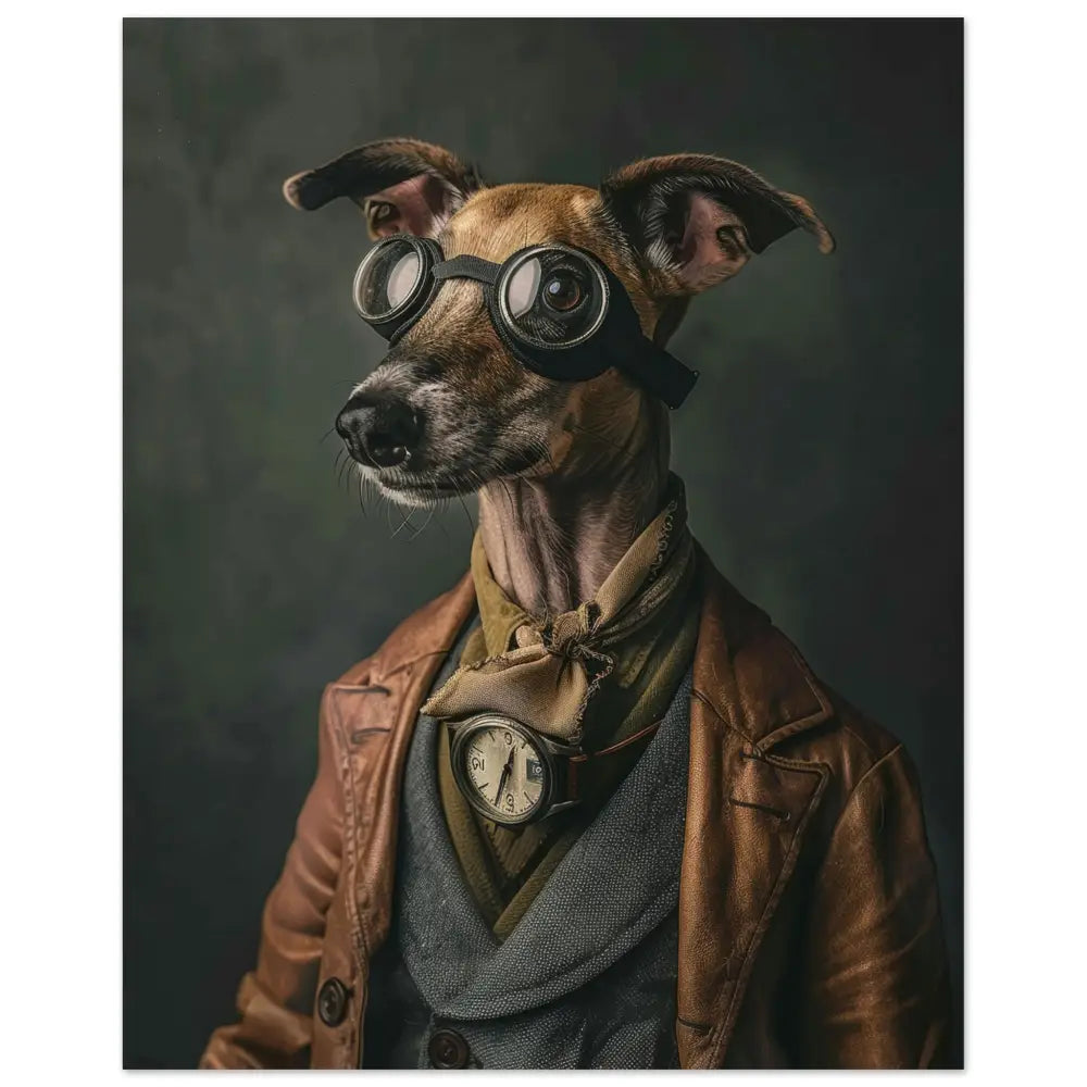 Deze afbeelding toont een dier, gekleed in een prachtige steampunk outfit. Het draagt een elegante, bruine leren jas met subtiele stiksels en sierlijke accenten. Om de nek hangt een antieke klok van brons, die de verfijnde look van het dier versterkt. De kop is voorzien van een set robuuste, zwarte brillen met metalen randjes, waardoor het een avontuurlijke pionier lijkt. De nek is omhuld met een stijlvol, olijfgroen sjaaltje dat extra flair toevoegt. De achtergrond bestaat uit een mystieke, donkere sfeer met een vleugje vintage, wat het geheel compleet maakt.
