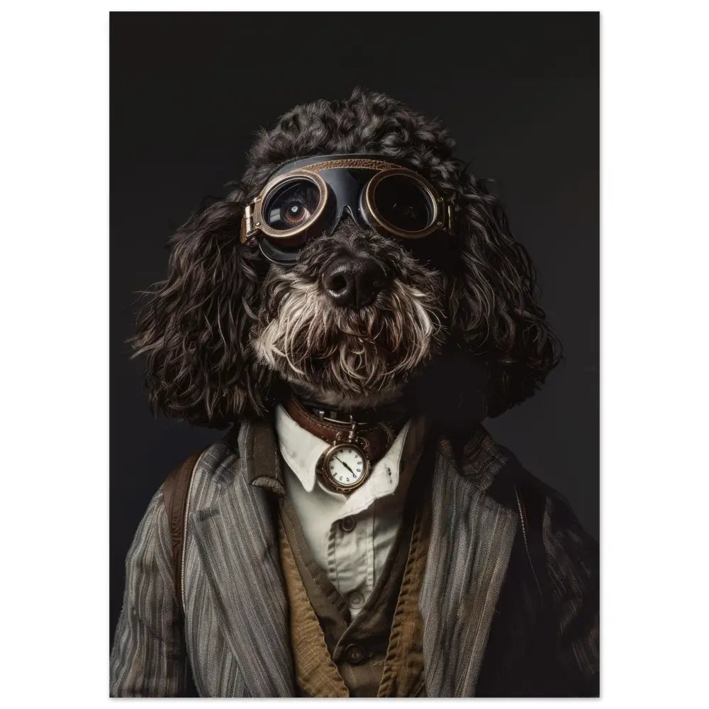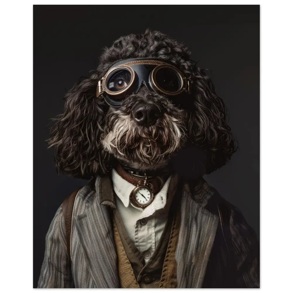 Deze afbeelding toont een dier, gekleed in een prachtige vintage steampunk outfit. Het draagt een elegante, grijs gestreepte jas met subtiele patronen en leren accenten. Om de nek hangt een antieke bronzen klok, die een klassieke charme toevoegt aan het geheel. Het hoofd van het dier wordt geaccentueerd door een stoere bril met bronzen metalen details en donkeren glazen, wat een avontuurlijke uitstraling geeft. De manchetjes zijn versierd met zacht bruin bont, terwijl leren accenten en contrasterende stiksels de steampunk-thematiek versterken. De achtergrond is donker, wat de nadruk legt op de gedetailleerde outfit en het gezicht van het dier.
