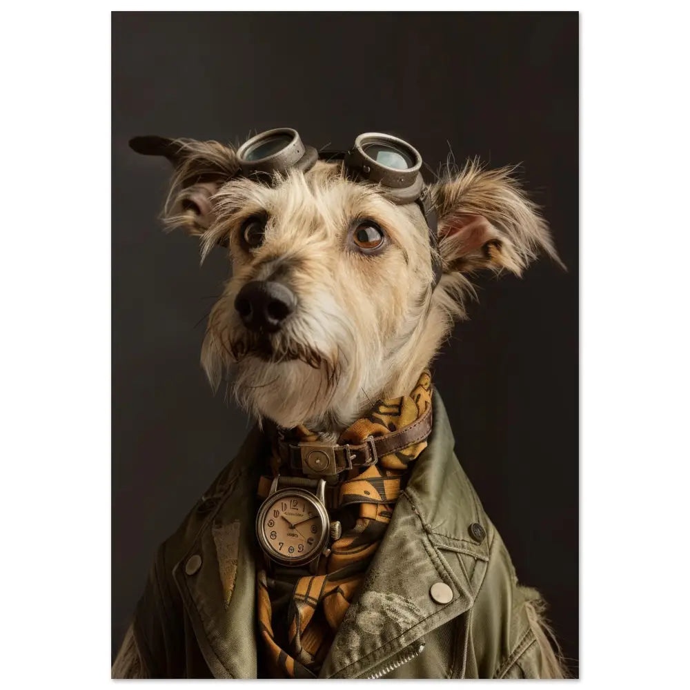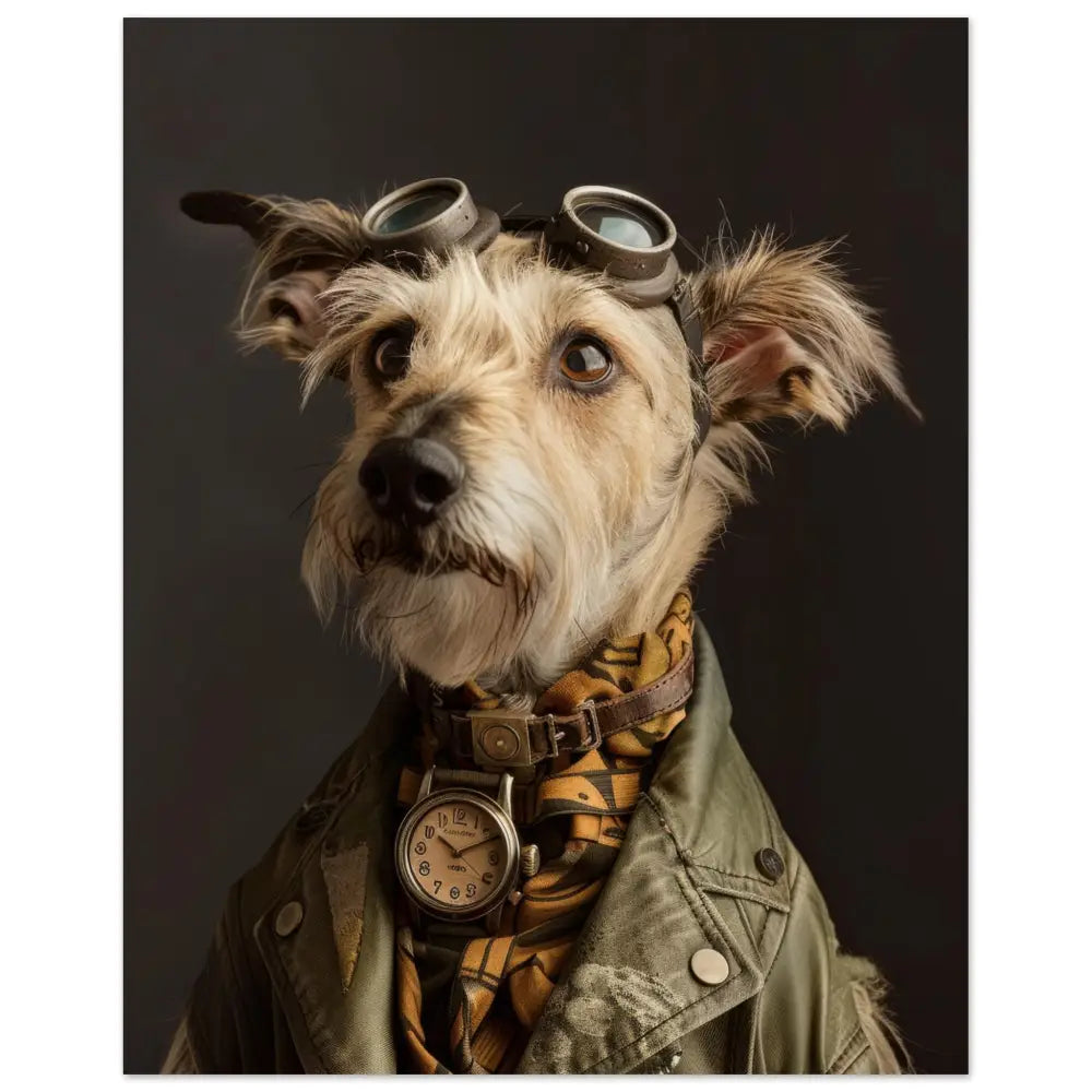 Deze afbeelding toont een dier, gekleed in een prachtige steampunk outfit. Het draagt een stijlvolle, groene leren jas met verweerde patronen en messing accenten. Om de nek hangt een antieke klok, glanzend in bronskleur, die zijn tijdloze elegantie benadrukt. Op het hoofd is een set robuuste, metalen bril in een donkere bronstint te zien, wat het een avontuurlijke uitstraling geeft. De pootjes worden gesierd door subtiele leren accenten en contrasterende stiksels die de steampunk esthetiek versterken. De achtergrond is donker, waardoor het dier centraal staat en de gedetailleerde outfit nog meer opvalt.