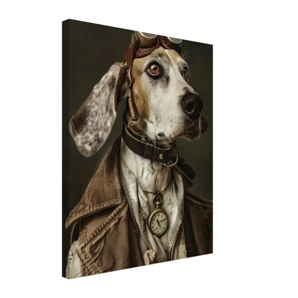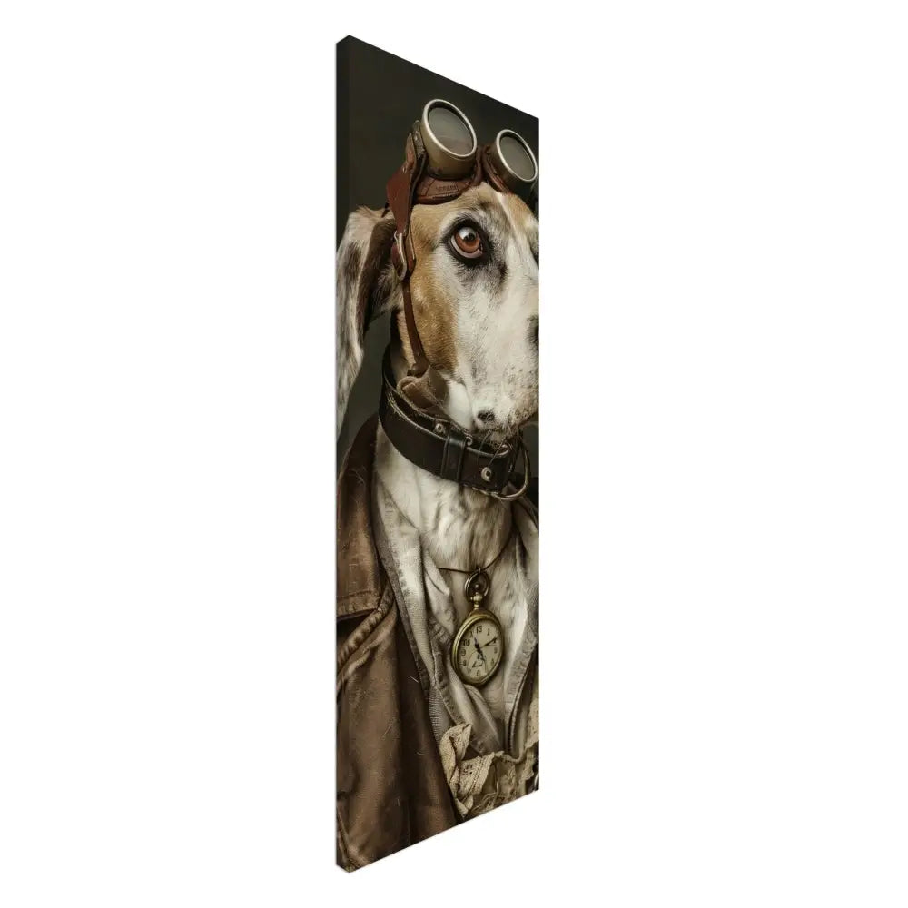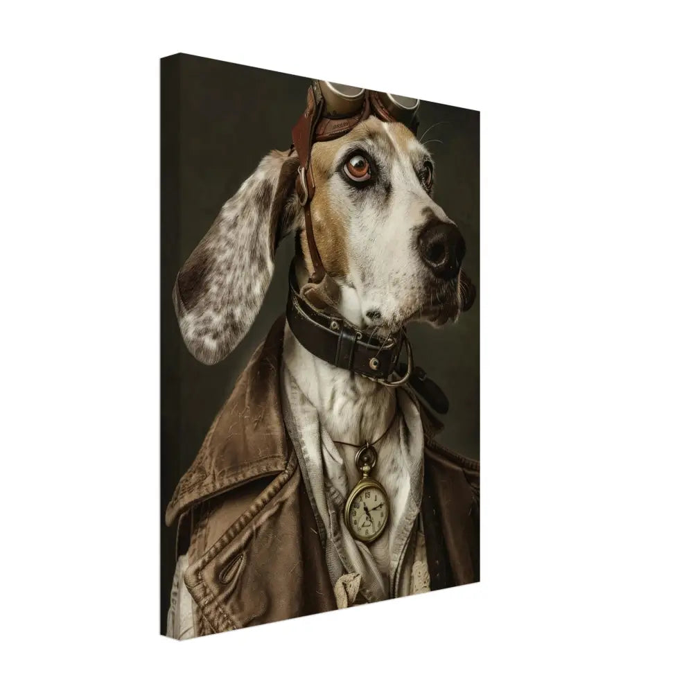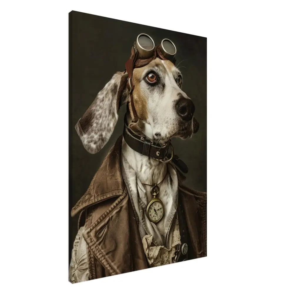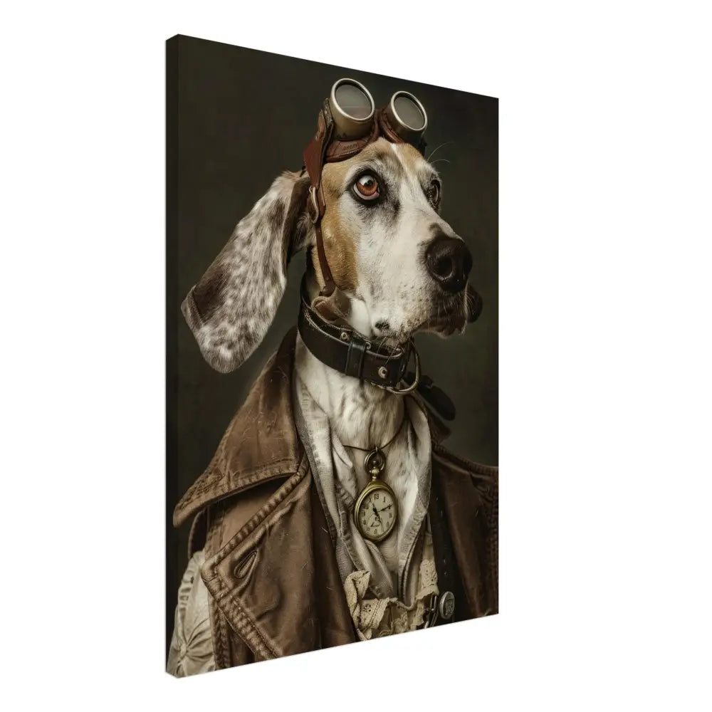 Deze afbeelding toont een dier, gekleed in een prachtige vintage steampunk outfit. De sierlijke, bruine jas is verrijkt met subtiele patronen die een verweerde look geven, terwijl de leren accenten de stevigheid benadrukken. Om de nek hangt een antieke, goudkleurige klok, een tijdloze touch van verfijning. De kop van het dier is prachtig gesierd met een robuuste, metalen bril in bronzen tinten, wat het een mysterieus en avontuurlijk karakter verleent. Elegant afgewerkt met leren manchetjes en fijne stiksels, creëert dit een harmonieus geheel. De achtergrond, een verfijnde donkere tint, versterkt de klassieke, tijdloze sfeer.