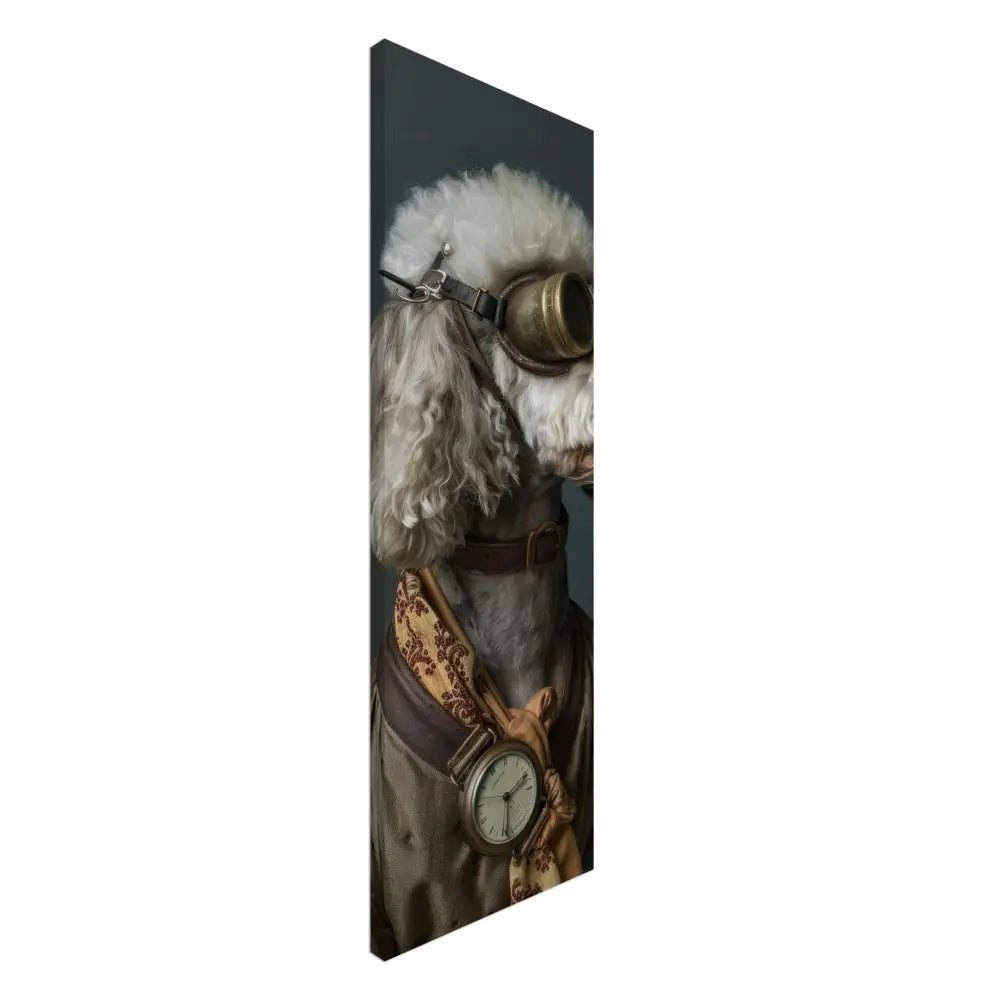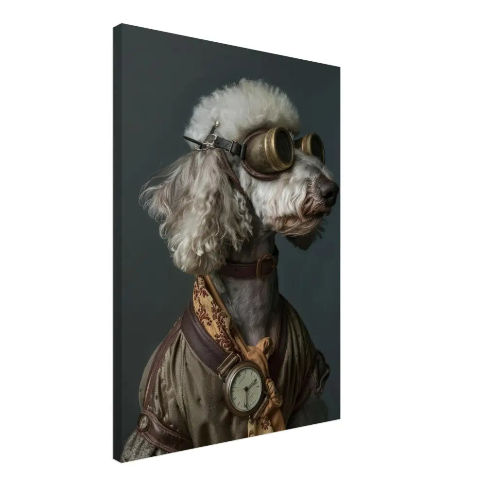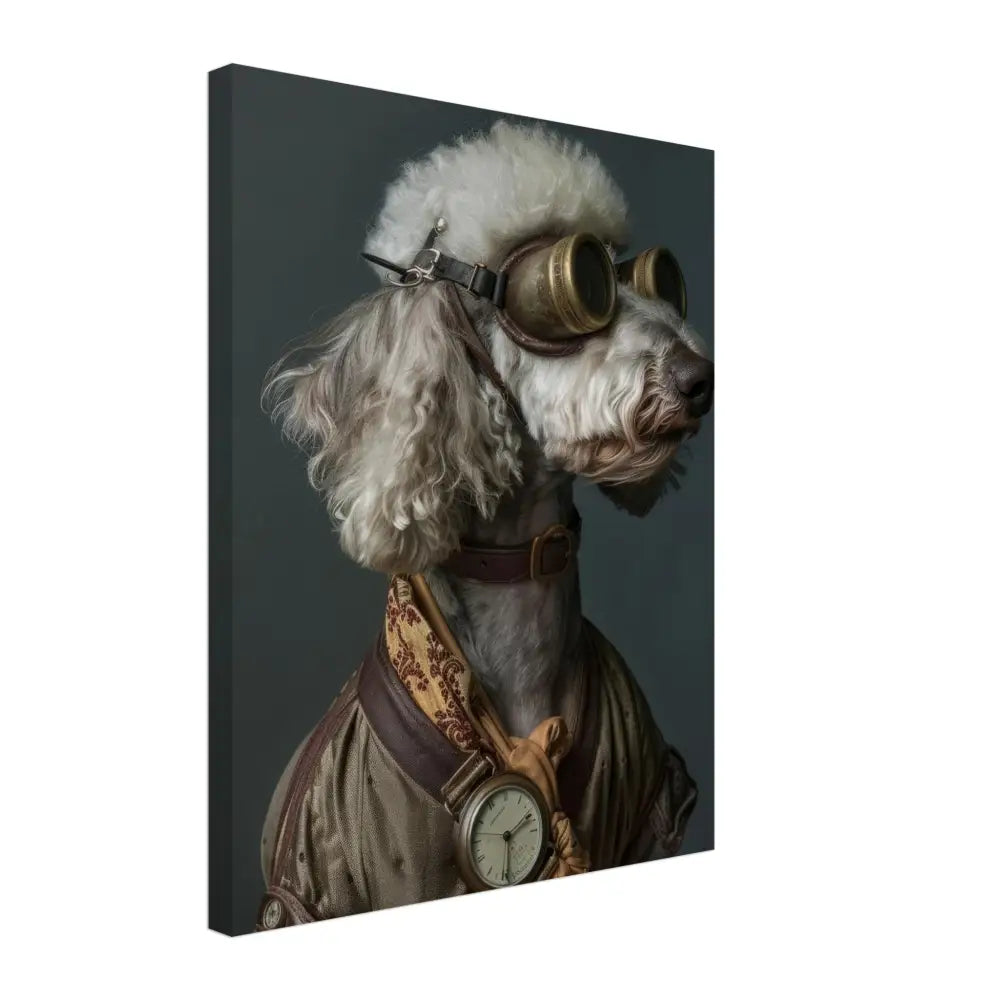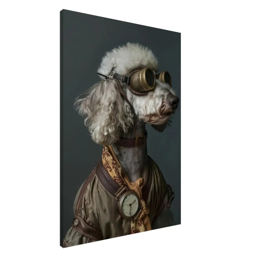 Deze afbeelding toont een dier, gekleed in een prachtige vintage steampunk outfit. Het draagt een elegante, bronskleurige jas met subtiele patronen en rijkelijk gedetailleerde accenten die een aristocratische charme uitstralen. Om de nek hangt een antieke klok in een klassieke bronzen behuizing, waarmee de tijdreiziger-look compleet wordt. Op het hoofd schittert een retro-futuristische bril met robuuste metalen details in een gouden tint, wat een gedurfde steampunk uitstraling geeft. De pootjes zijn versierd met stijvolle lederen manchetjes en contrasterende stiksels. De donkere, neutrale achtergrond zorgt voor een perfecte balans, die de aandacht volledig op het statige portret vestigt.
