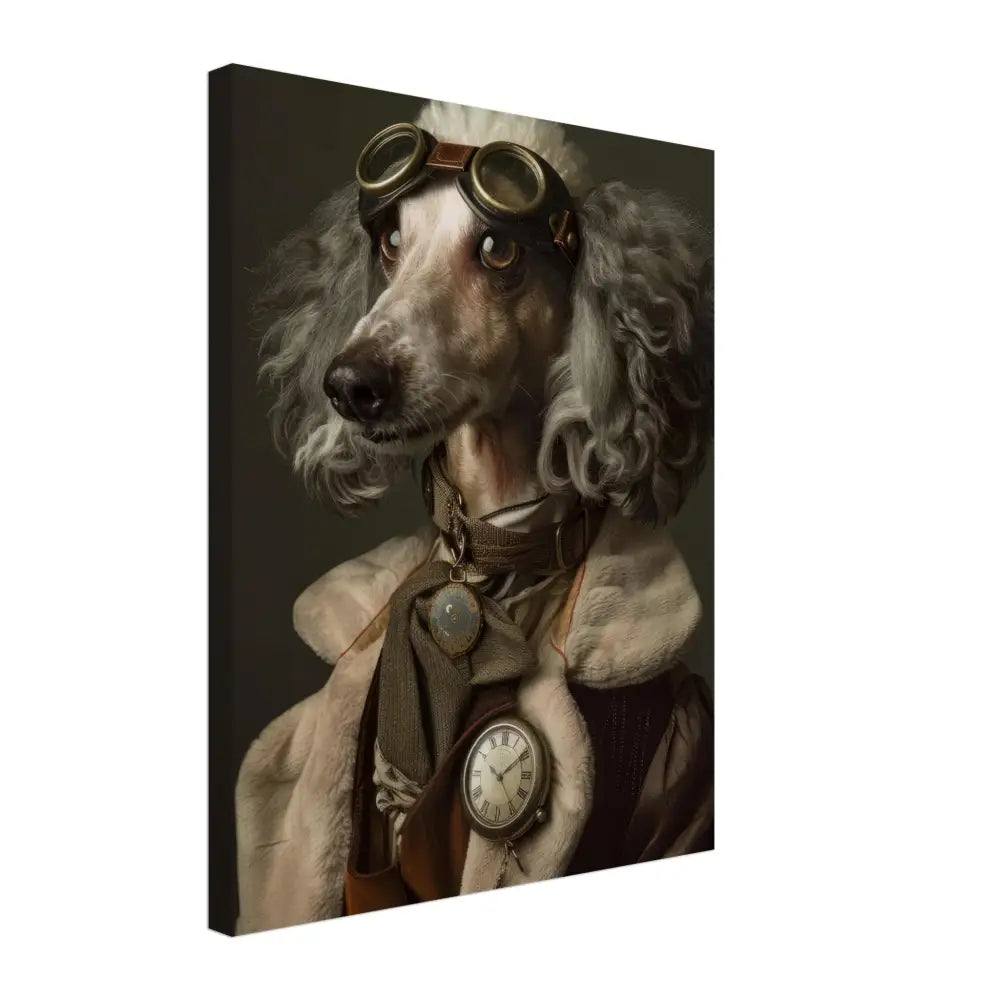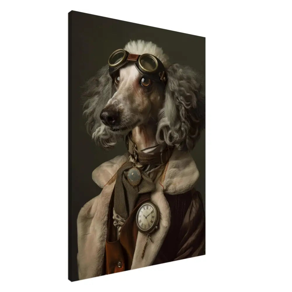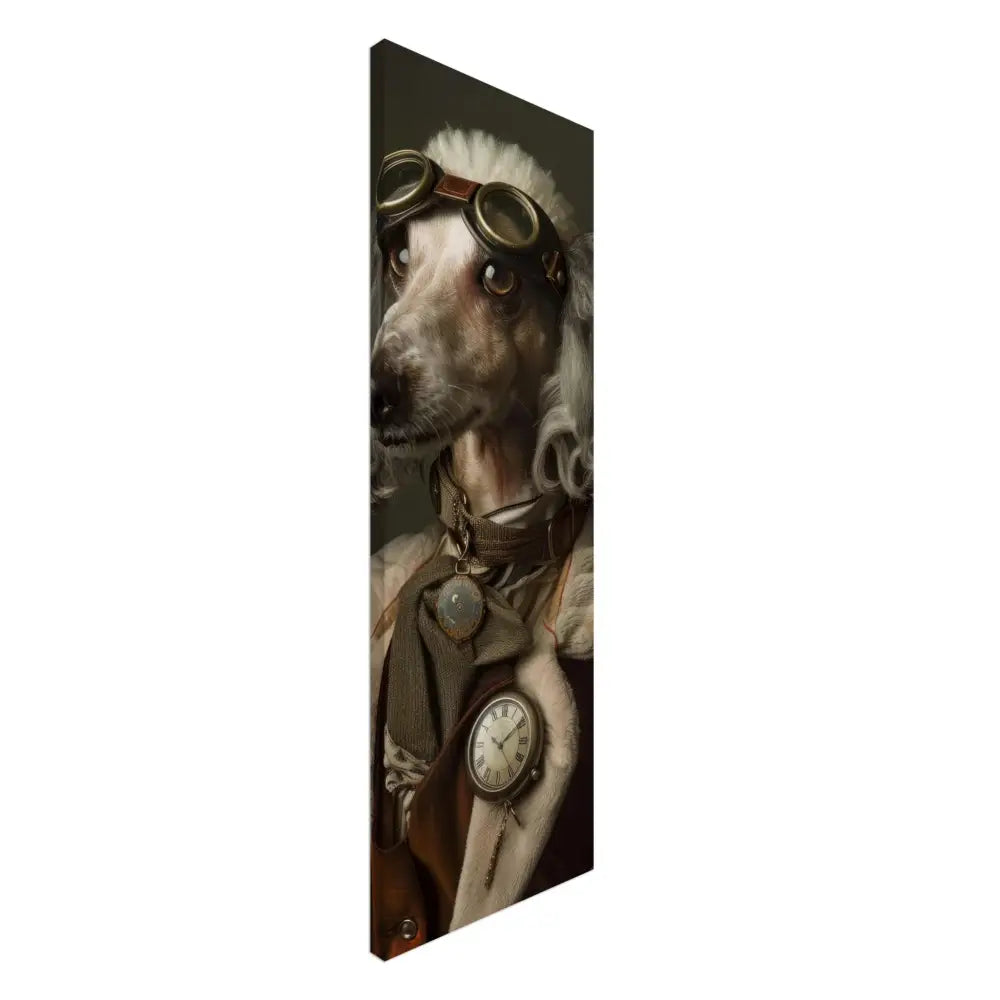 Deze afbeelding toont een dier, gekleed in een prachtige vintage steampunk outfit. Het draagt een elegant, bruin jasje met fluwelen beige accenten langs de randen en subtiele stiksels op de schouders. Om de nek hangt een antieke klok in een gedistingeerde bronskleur, die een tijdloze charme geeft. De kop wordt gesierd door een paar grote, retro-futuristische brillen met robuuste metalen details in diep brons, wat een avontuurlijke uitstraling toevoegt. De pootjes zijn voorzien van verfijnde, lichte bontachtige manchetjes met leren accenten, die een luxe uitstraling bieden. De achtergrond is klassiek en ingetogen, wat de focus op het dier legt.