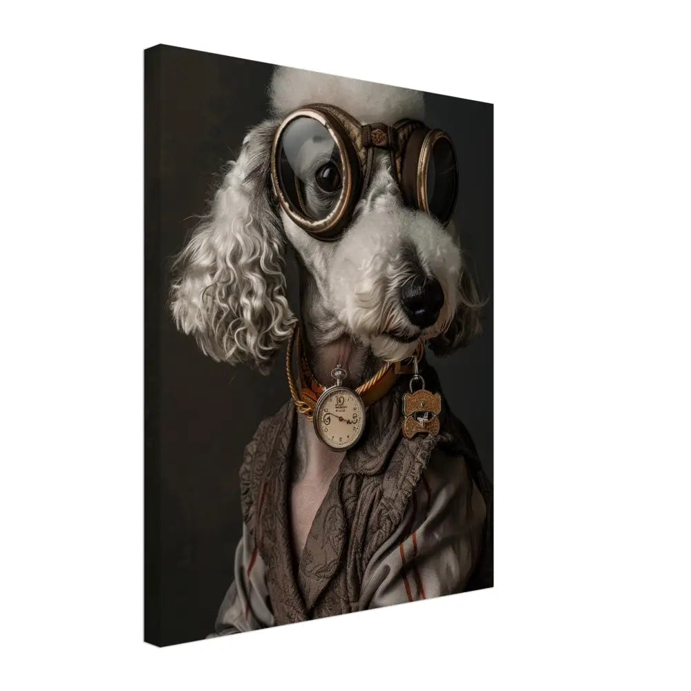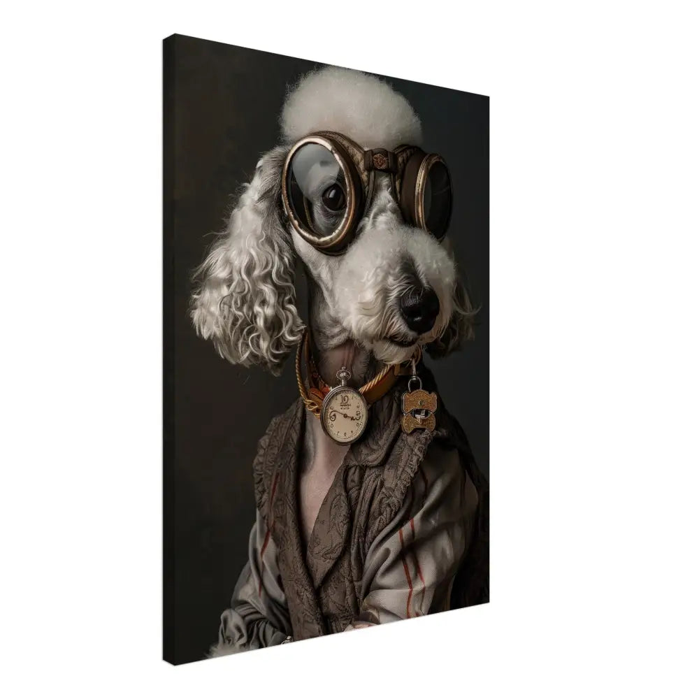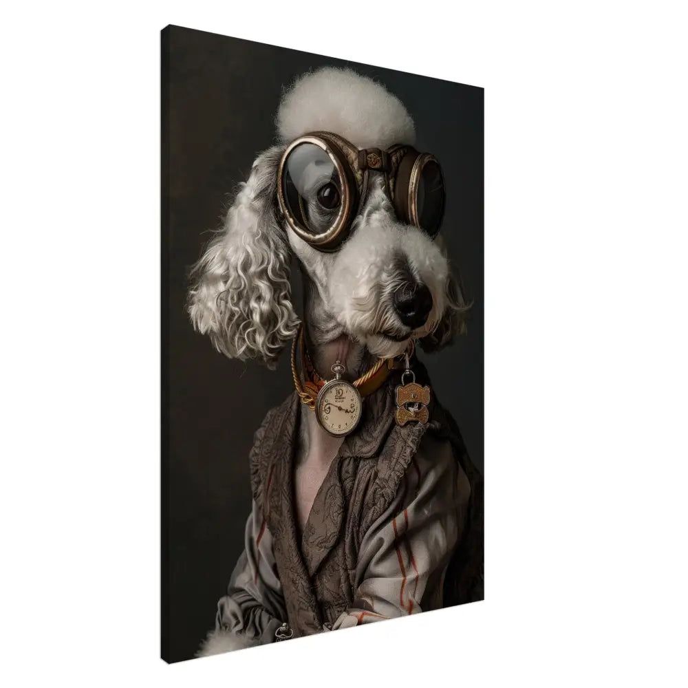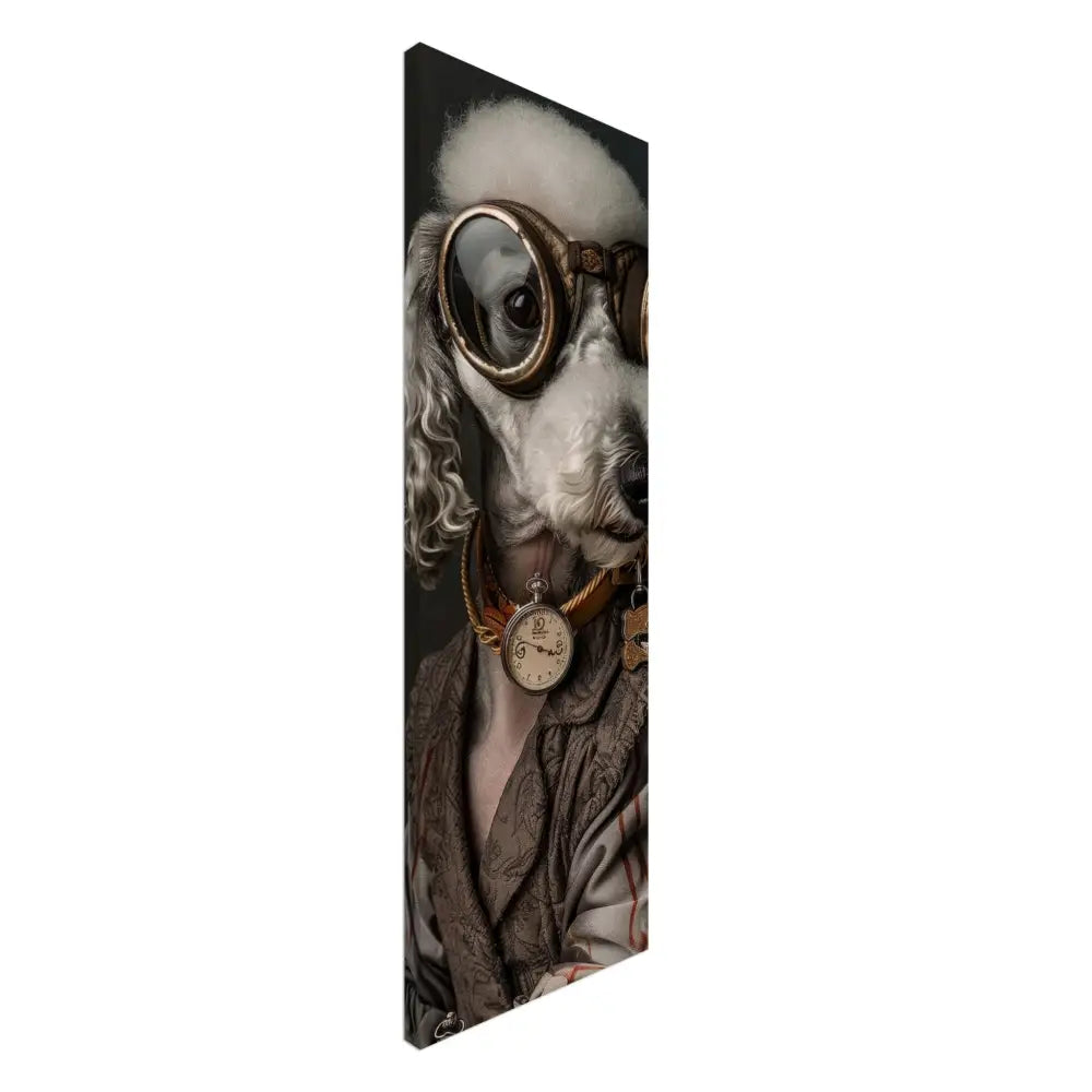 Deze afbeelding toont een dier, gekleed in een prachtige vintage steampunk outfit. Het draagt een elegante, bruin-grijze jas met subtiele patronen en fijne stiksels. Om de nek hangt een antieke gouden klok die prachtig afsteekt tegen de sierlijke kleding. De kop is uitgerust met een paar grote, bolvormige brillen met bronzen metalen details, die het dier een avontuurlijke uitstraling geven. Verder dragen de pootjes grijze bontachtige manchetjes die het geheel verfijnen. De achtergrond is gedetailleerd met een donker patroon dat de historische sfeer van de steampunk-stijl benadrukt.