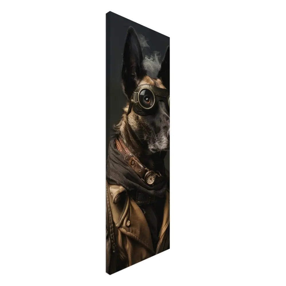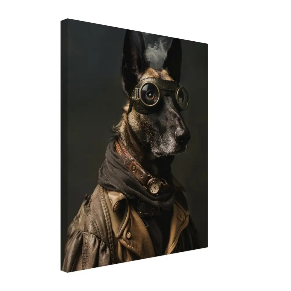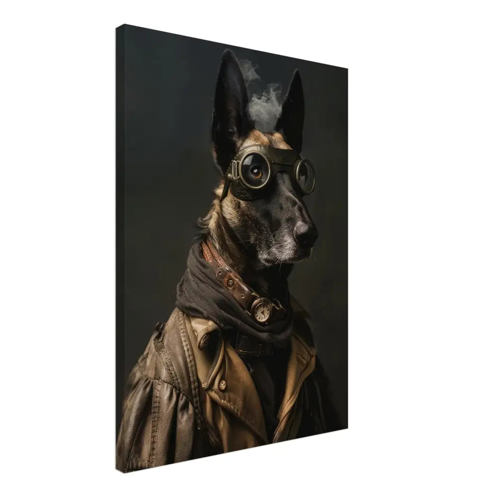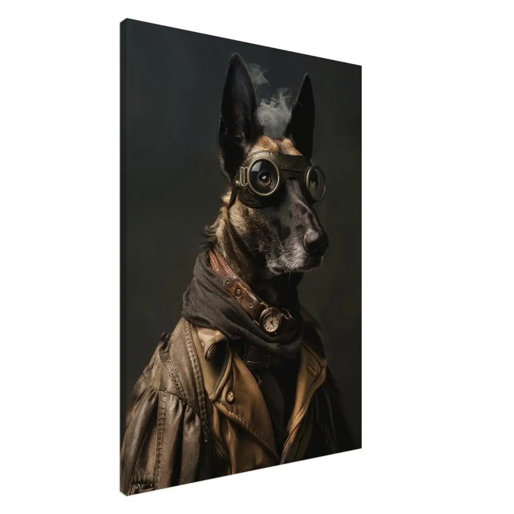 Deze afbeelding toont een dier, gekleed in een prachtige steampunk outfit. Het draagt een robuuste, bruine leren jas met metalen knopen en versleten randen. Om de nek hangt een antieke bronzen klok, subtiel glanzend op een leren band, waardoor de outfit een historische charme krijgt. De kop wordt gesierd door grote, retro-futuristische brillen met donkere metalen details, die een avontuurlijke uitstraling geven. De poten zijn bedekt met stoere, zwarte leren manchetjes en contrasterende stiksels. De achtergrond is donker en mysterieus, wat de dramatische en tijdloze sfeer van het portret versterkt.