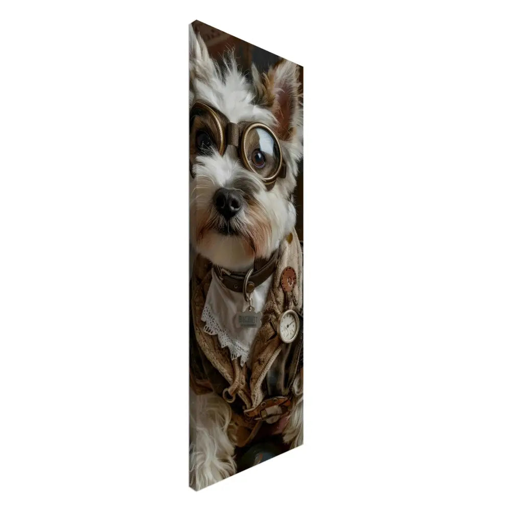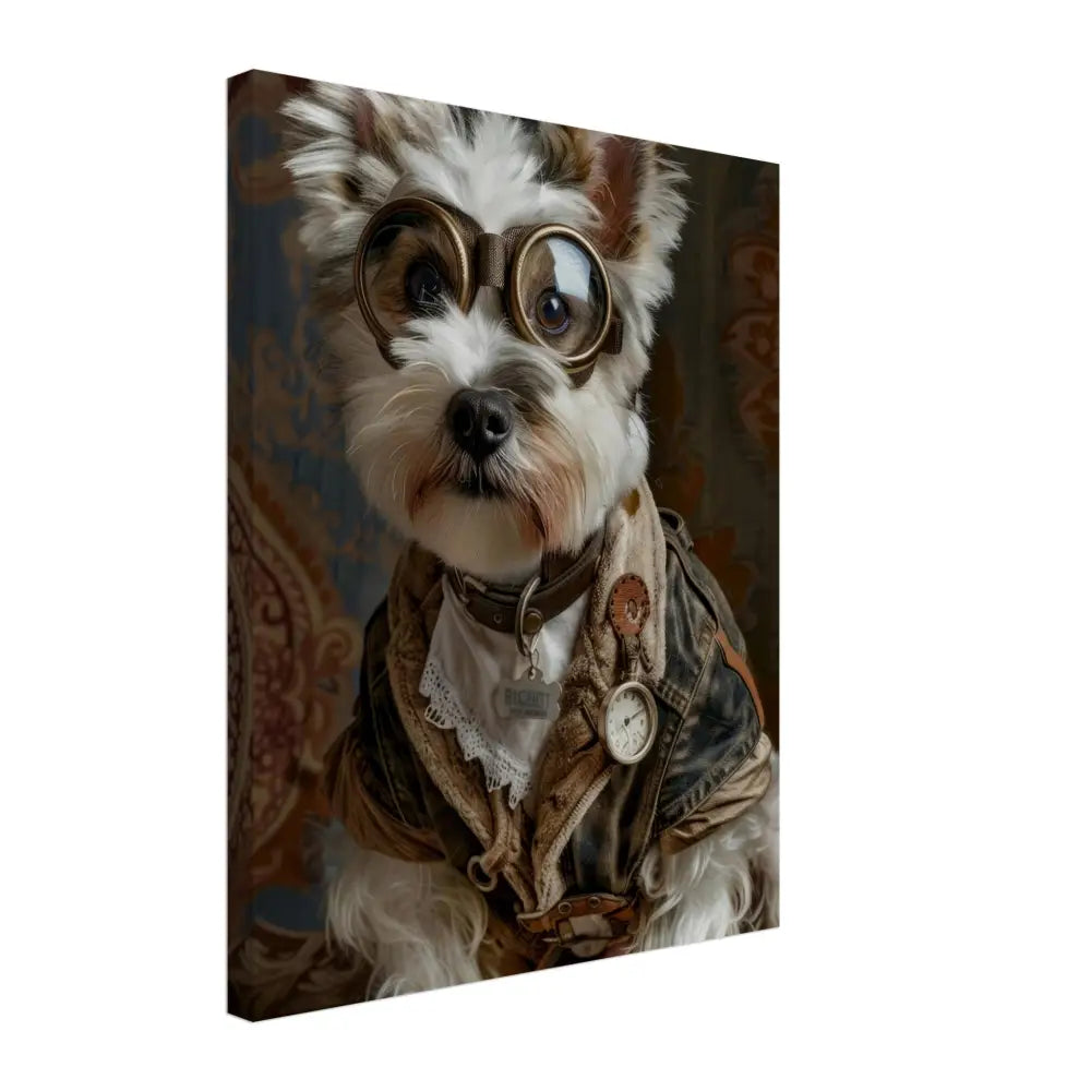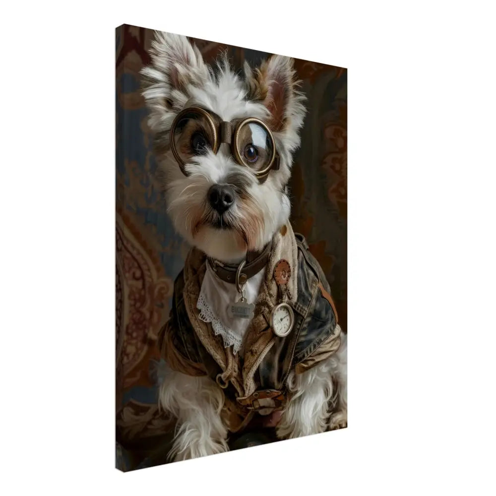 Deze afbeelding toont een dier, gekleed in een prachtige vintage steampunk outfit. Het draagt een gedistingeerde bruine jas met verweerde patronen en subtiele leren accenten. Om de nek hangt een antieke zilveren klok, die de aristocratische uitstraling versterkt. De kop wordt gesierd door een opvallende, bronskleurige retro-futuristische bril met verfijnde metalen details, wat het dier een avontuurlijke uitstraling geeft. De pootjes zijn voorzien van stijlvolle, crème bontachtige manchetjes die de outfit compleet maken. De achtergrond is rijkelijk versierd met een weelderig, barok behang in warme tinten, wat het klassieke steampunk-thema benadrukt.