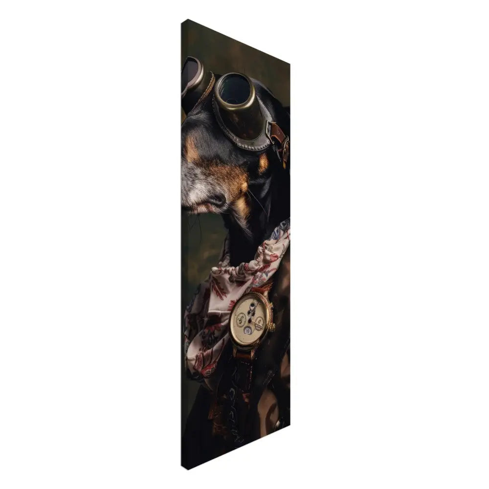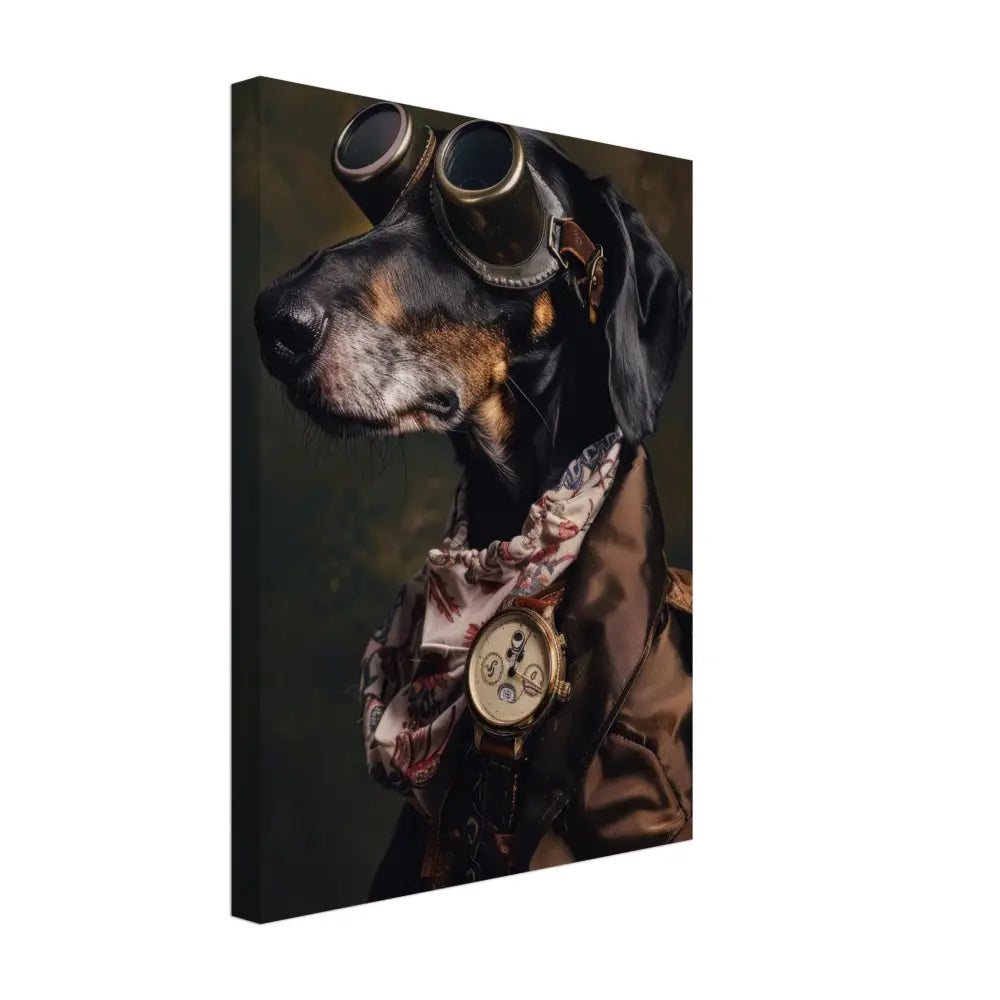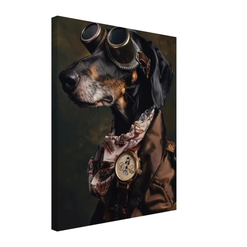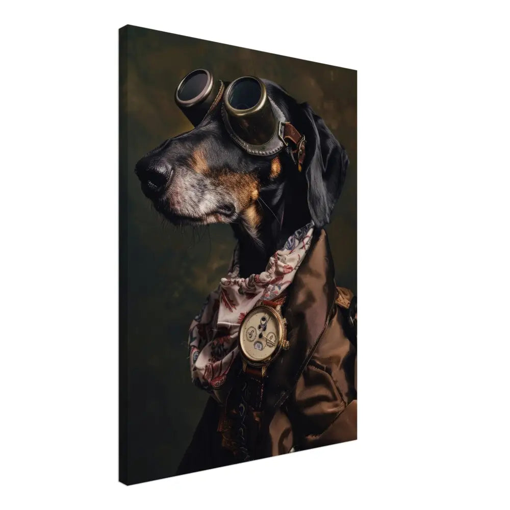 Deze afbeelding toont een dier, gekleed in een prachtige vintage steampunk outfit. Het draagt een glanzende, bruine jas met subtiele metallic accenten die de stijlvolle en verfijnde uitstraling benadrukken. Om de nek hangt een antieke gouden klok, die de klassieke allure verder versterkt. De kop van de hond wordt geaccentueerd door een paar grote, bronskleurige brillen met gedetailleerde metalen afwerkingen, die het geheel een avontuurlijke uitstraling geven. De extravagant gedecoreerde sjaal completeert de look met een vleugje elegantie. De achtergrond is subtiel en donker, wat de aandacht volledig richt op het sierlijke en intrigerende steampunk-thema.