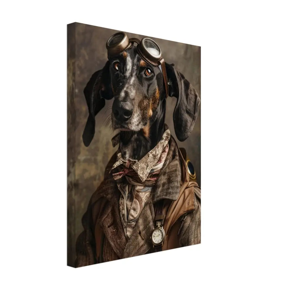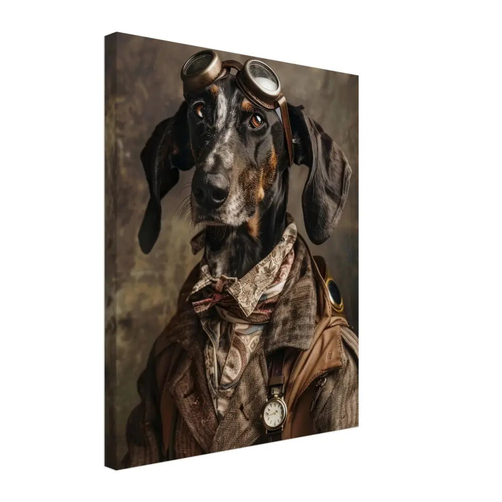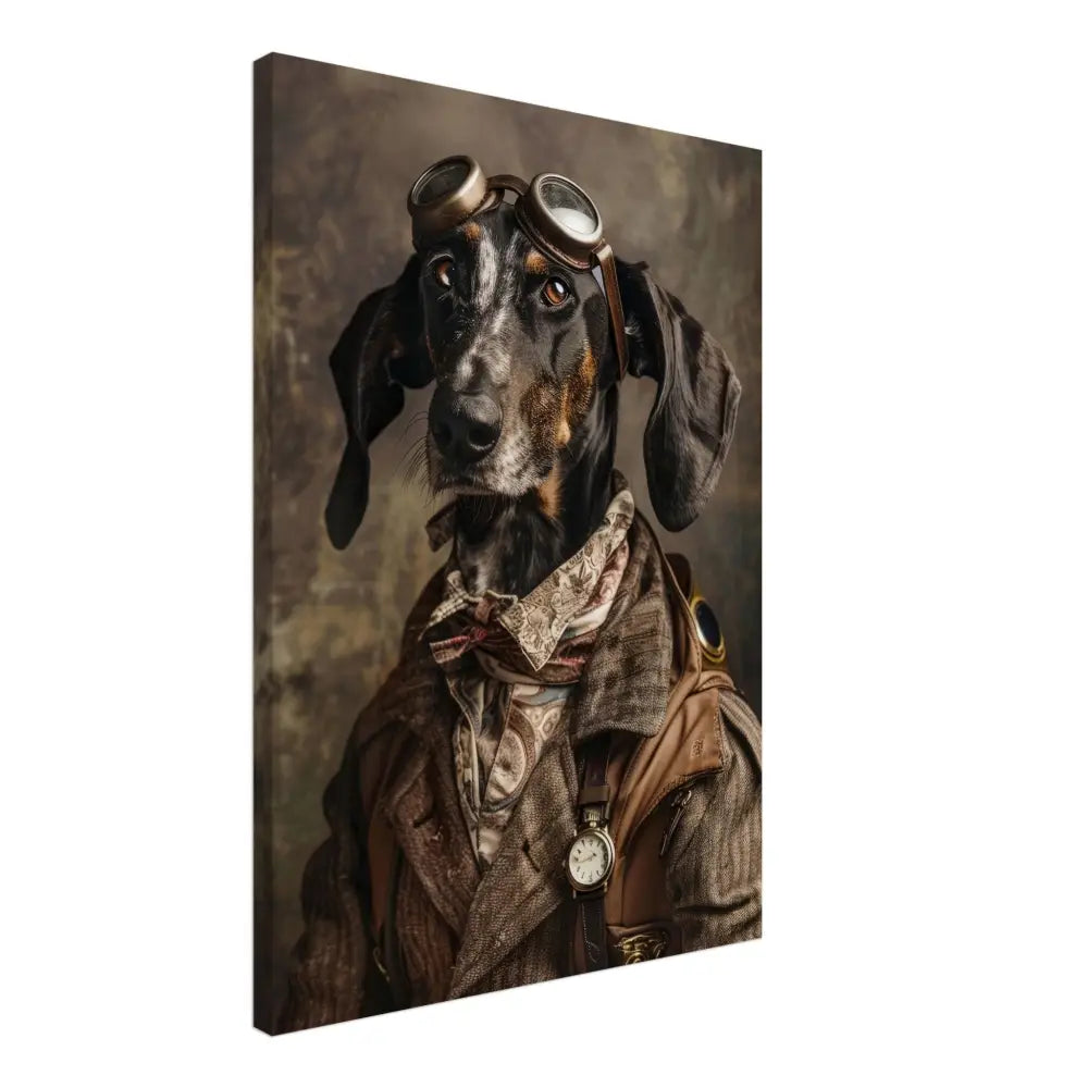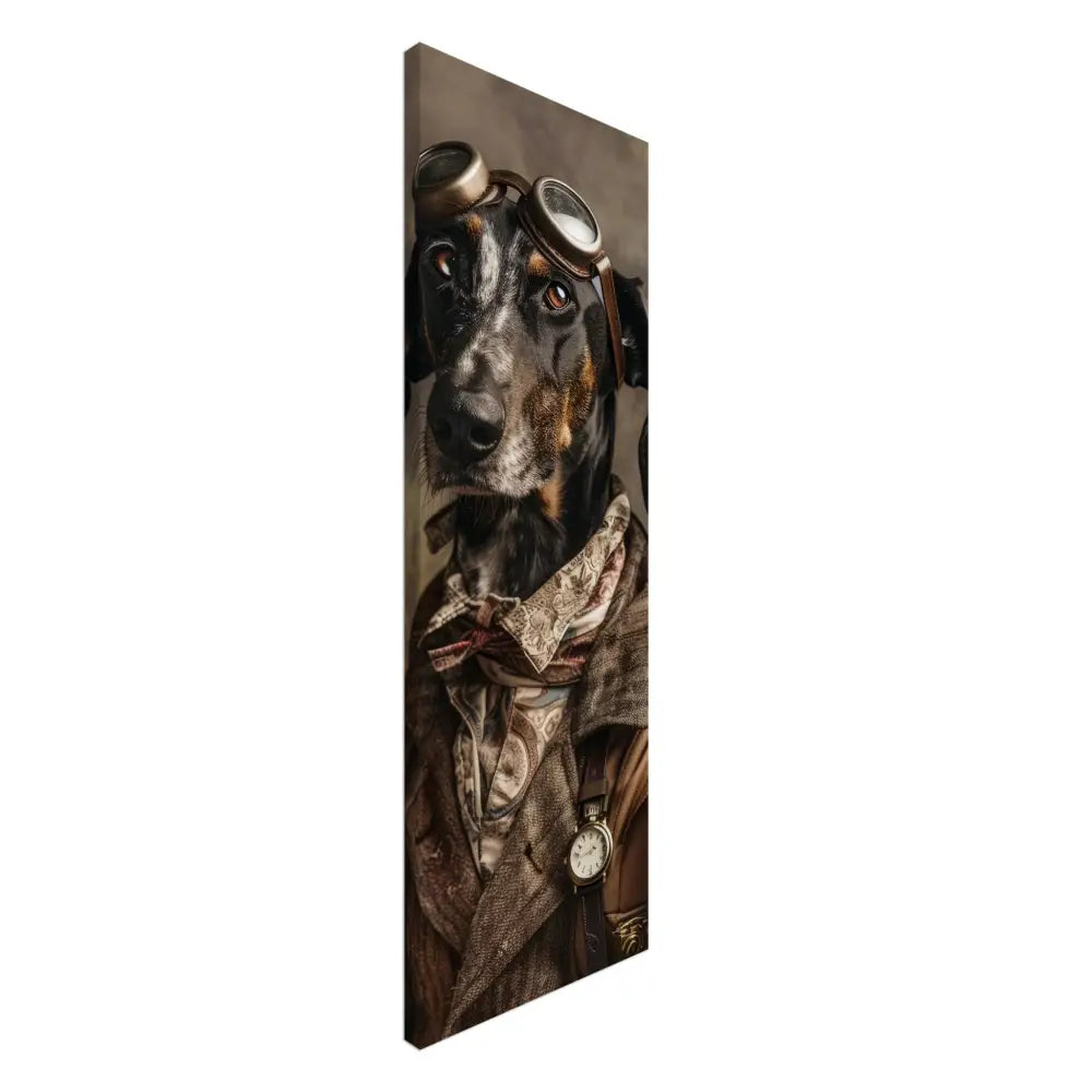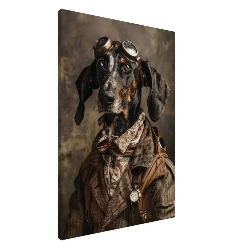 Deze afbeelding toont een dier, gekleed in een prachtige vintage steampunk outfit. Het draagt een sierlijke, bruin-grijze jas met een geweven patroon en goudkleurige knopen. Om de nek hangt een antieke gouden klok, die de tijdloosheid versterkt. De kop wordt gesierd door een paar grote, retro-futuristische brillen met metalen details in bronzen kleur, waardoor deze eruitziet als een inventieve ontdekkingsreiziger. De poten zijn voorzien van elegante, leren banden en contrasterende stiksels die het geheel afmaken. De achtergrond is artistiek met subtiele kleuren die de scène een mystieke sfeer geven.