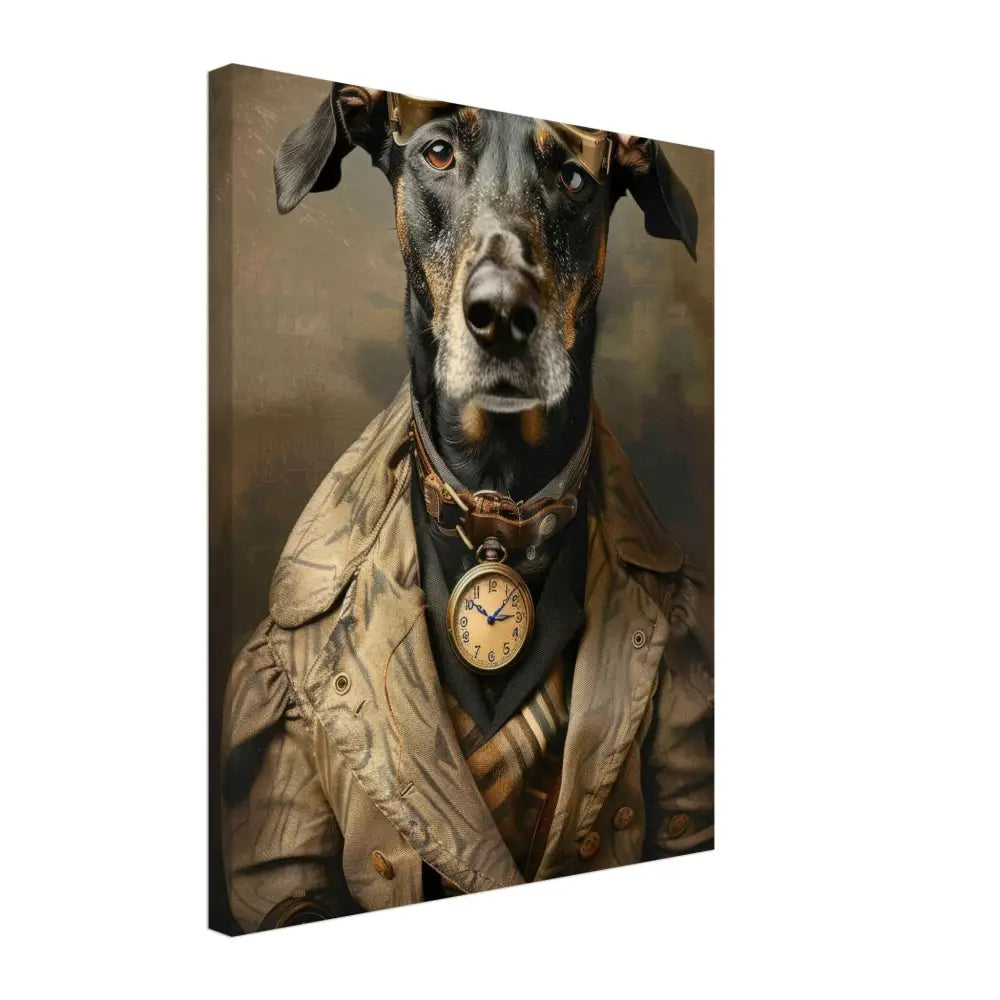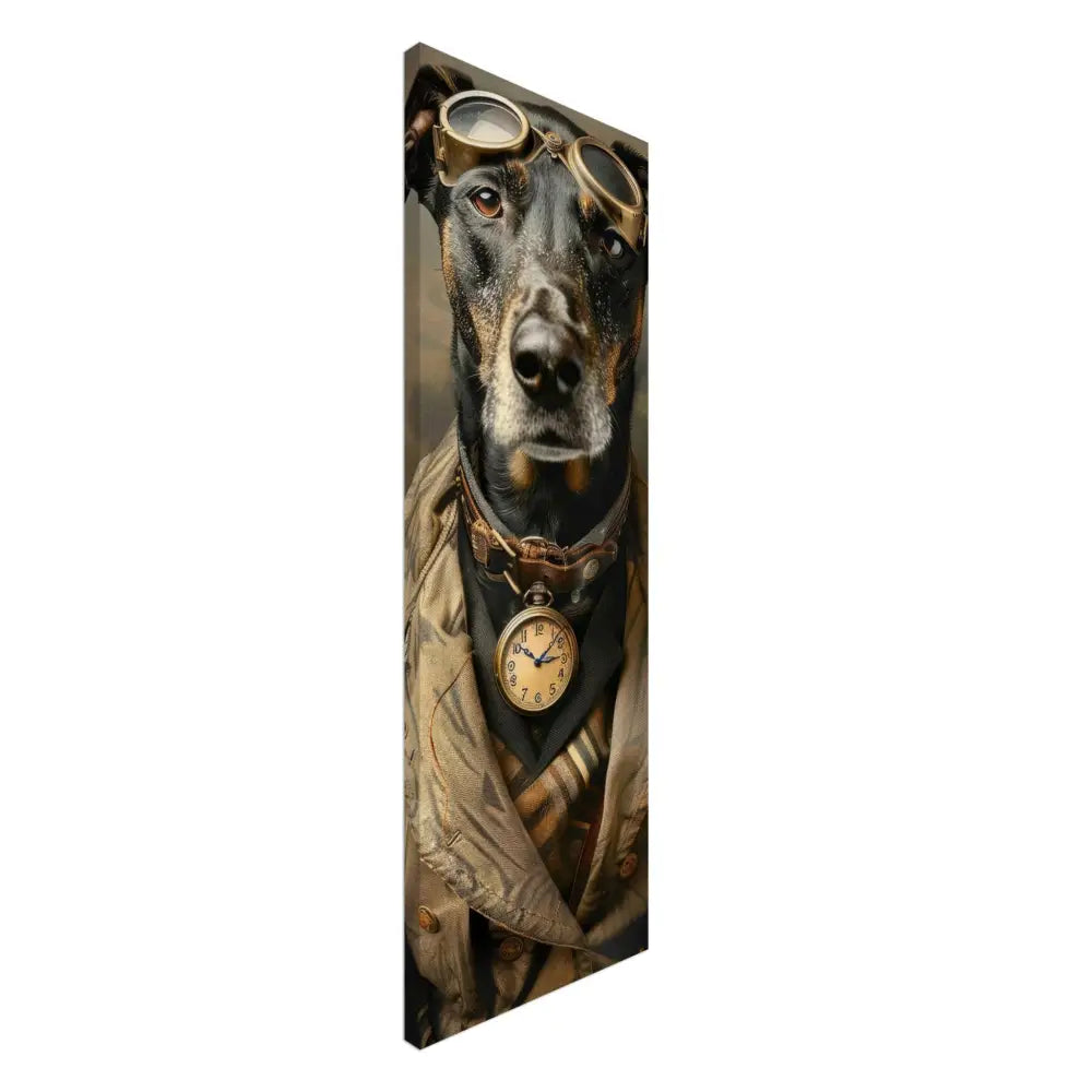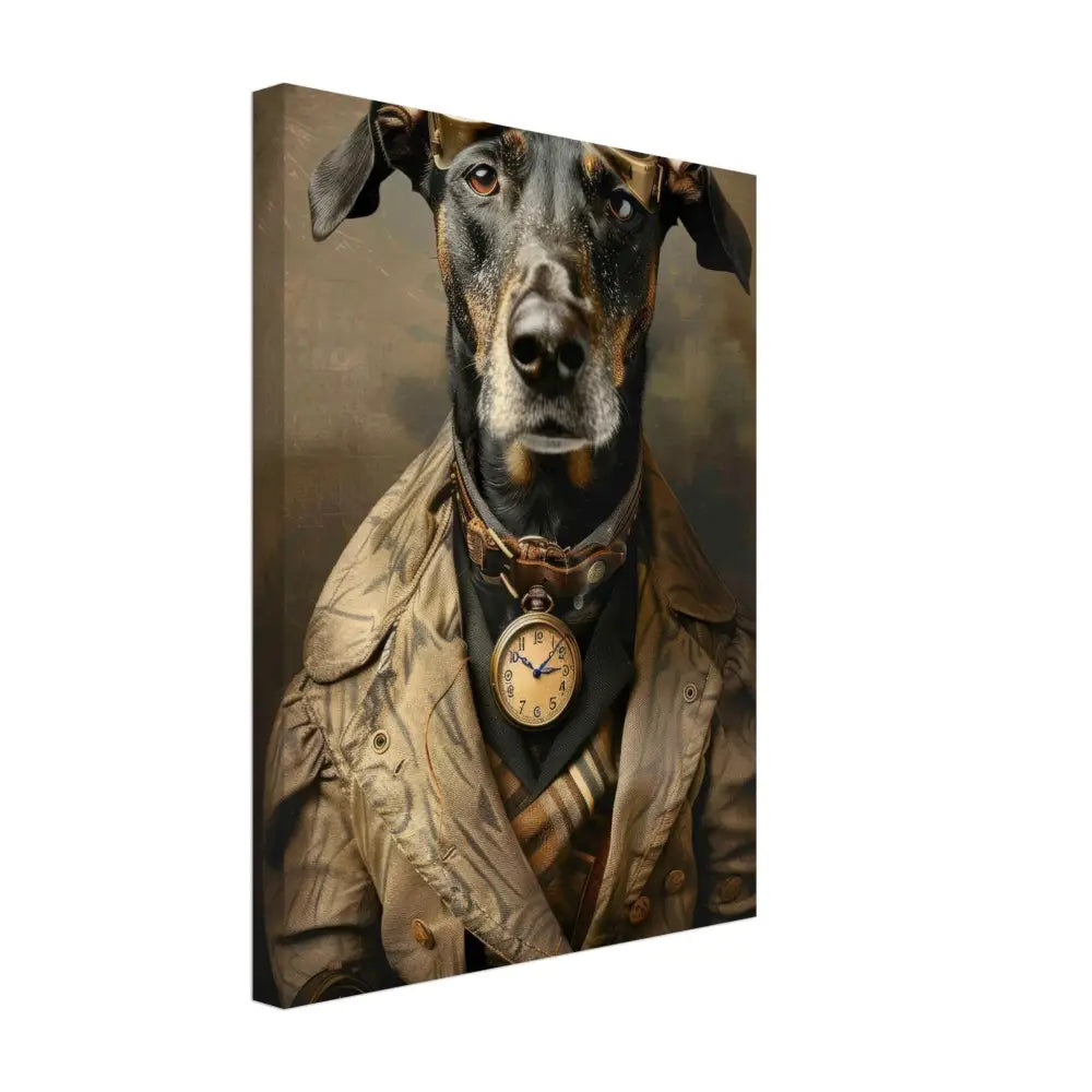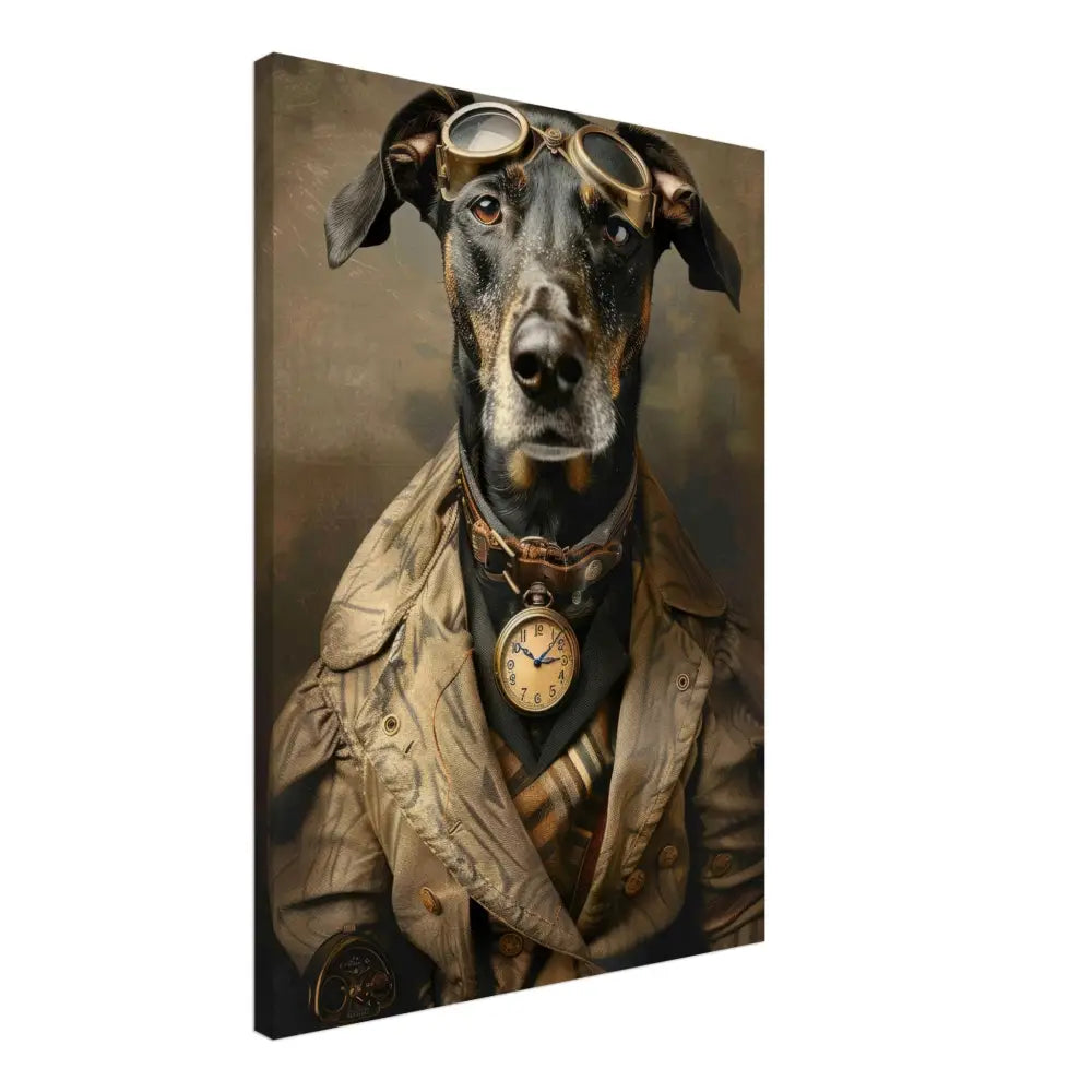Deze afbeelding toont een dier, gekleed in een prachtige vintage steampunk outfit. Het draagt een elegante, beige jas met gedetailleerde, bruin-blauwe patronen en subtiele accenten. Om de nek van het dier hangt een antieke gouden klok, die de tijdloze charme van het geheel benadrukt. Op het hoofd prijkt een imposante bril met bronzen metalen details, die een gevoel van avontuur en technologie oproept. Bij de voorpoten zijn stilvolle manchetjes van zwart leer te zien, voorzien van contrasterende stiksels. De achtergrond is strak en industrieel, met verweerde tonen die de historische sfeer verder versterken.