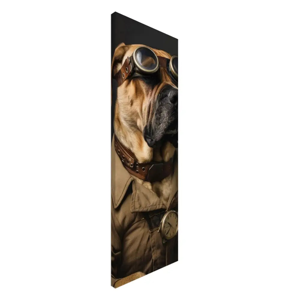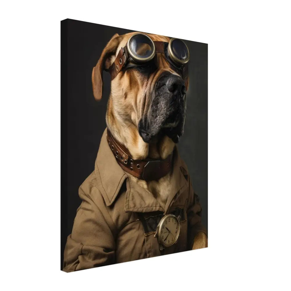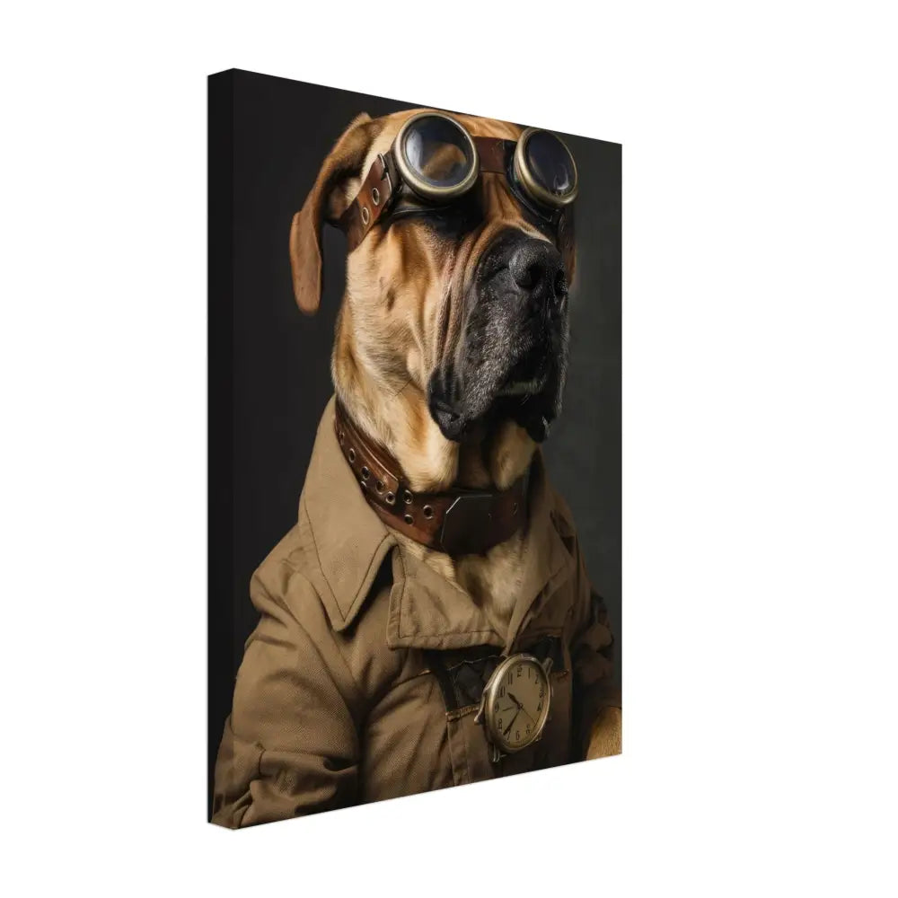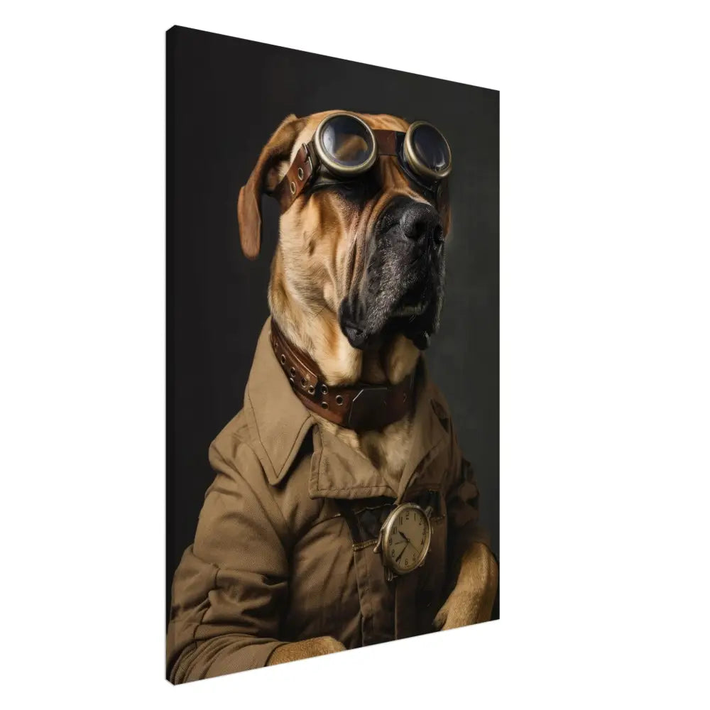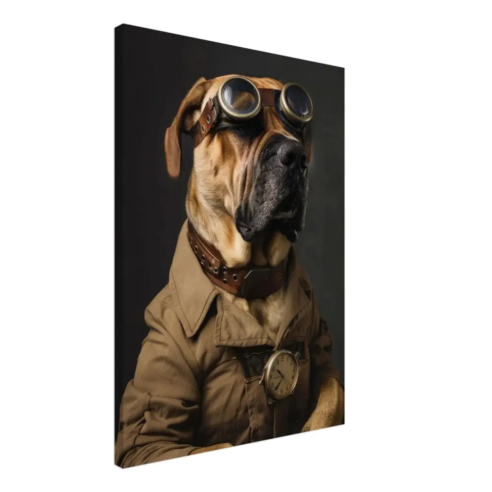 Deze afbeelding toont een dier, gekleed in een prachtige vintage steampunk outfit. Het draagt een stijlvol, bruin leren jack met subtiele stiksels en metaalachtige knopen. Om de nek hangt een antieke gouden klok, die een elegant tijdloos gevoel toevoegt. De kop wordt gesierd door een paar grote, vintage steampunk-brillen met bronzen metalen details, wat een avontuurlijk tintje geeft aan de look. De pootjes zijn voorzien van details zoals leren accenten en contrasterende stiksels. De achtergrond is donker en mysterieus, wat het dier een opvallende centrale plaats in het portret geeft.