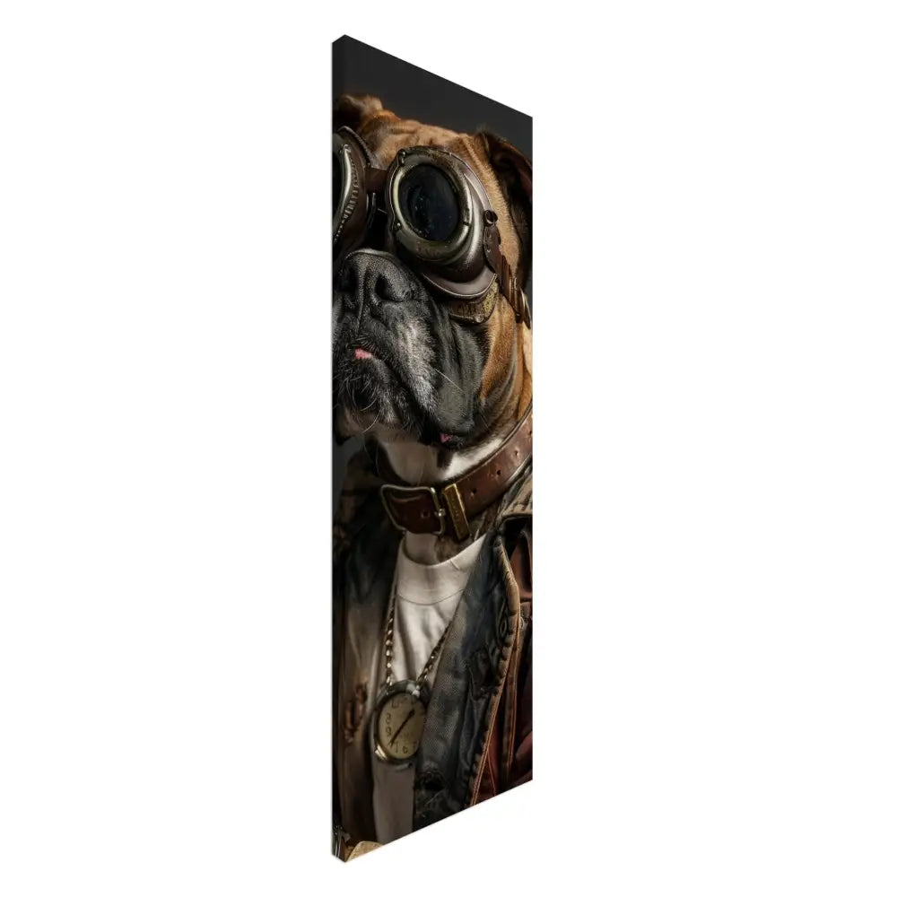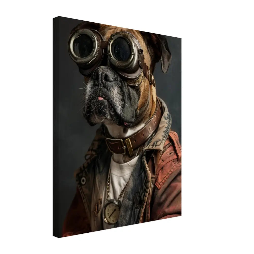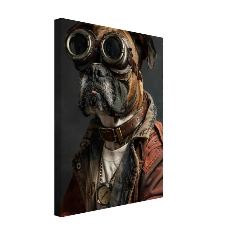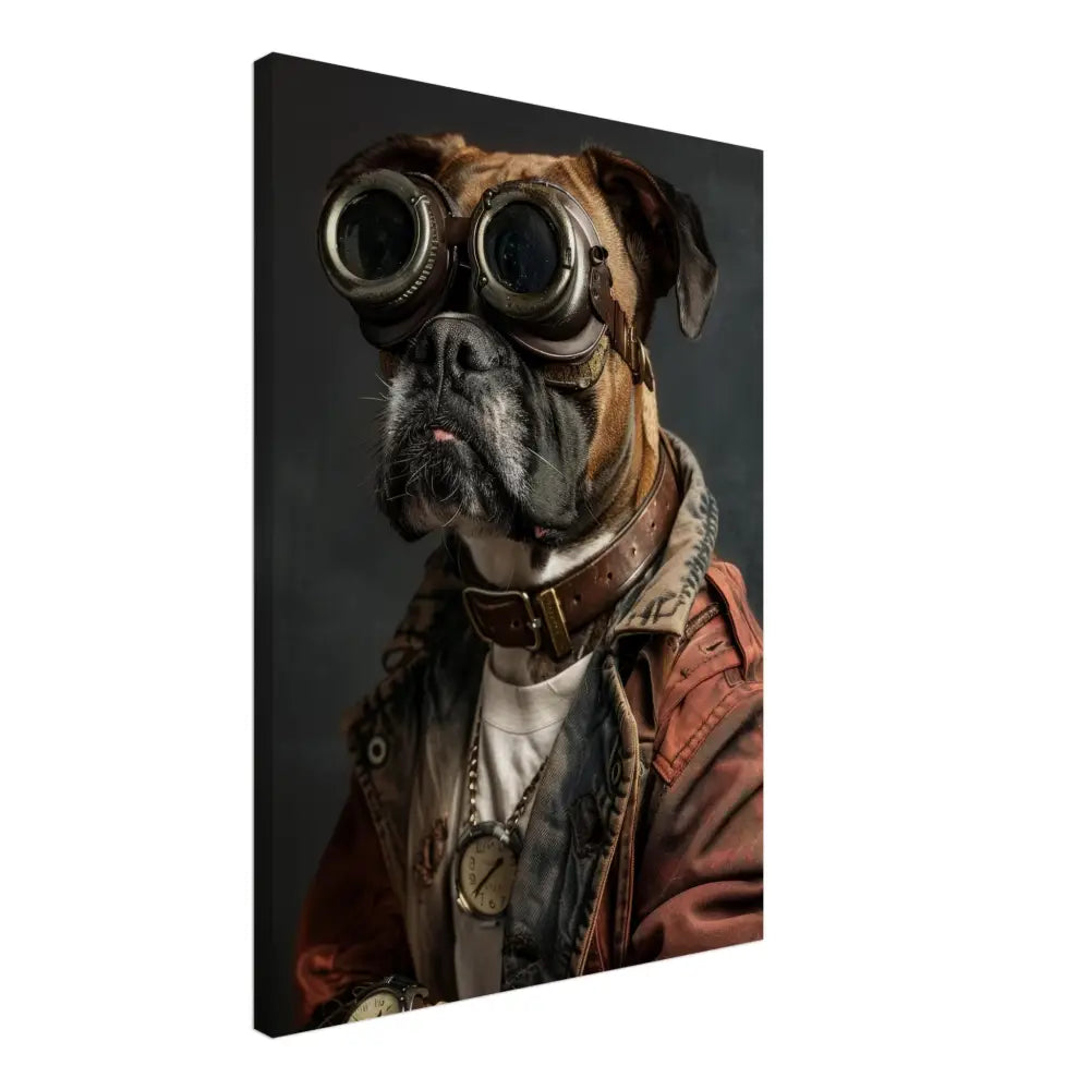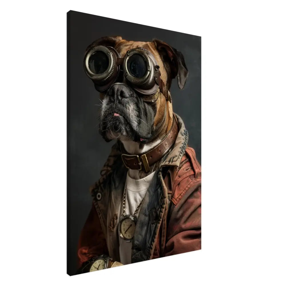 Deze afbeelding toont een dier, gekleed in een prachtige vintage steampunk outfit. Het draagt een robuuste, bruin-grijze jas met subtiele, verweerde patronen en koperkleurige accenten. Om de nek hangt een antieke, zilverkleurige klok, die een vleugje nostalgie toevoegt. De kop wordt gesierd door een indrukwekkende, retro-futuristische bril met gedetailleerde bronzen metalen onderdelen, waardoor de hond er als een gedurfde avonturier uitziet. De pootjes zijn voorzien van elegante, beige bontachtige manchetjes en leren accenten, compleet met contrasterende stiksels. De achtergrond is donker en minimalistisch, waardoor de outfit van de hond centraal staat.