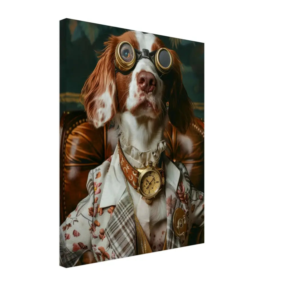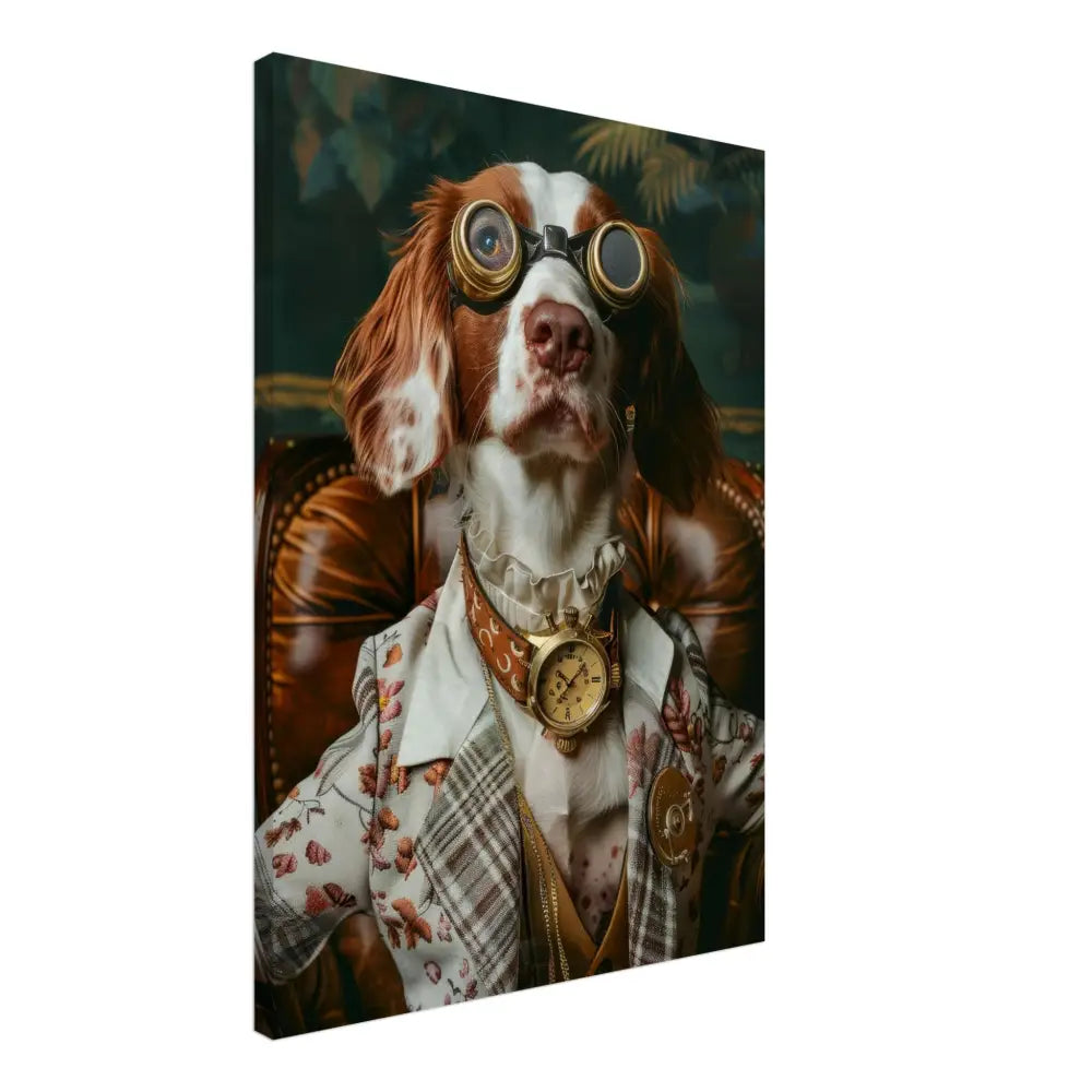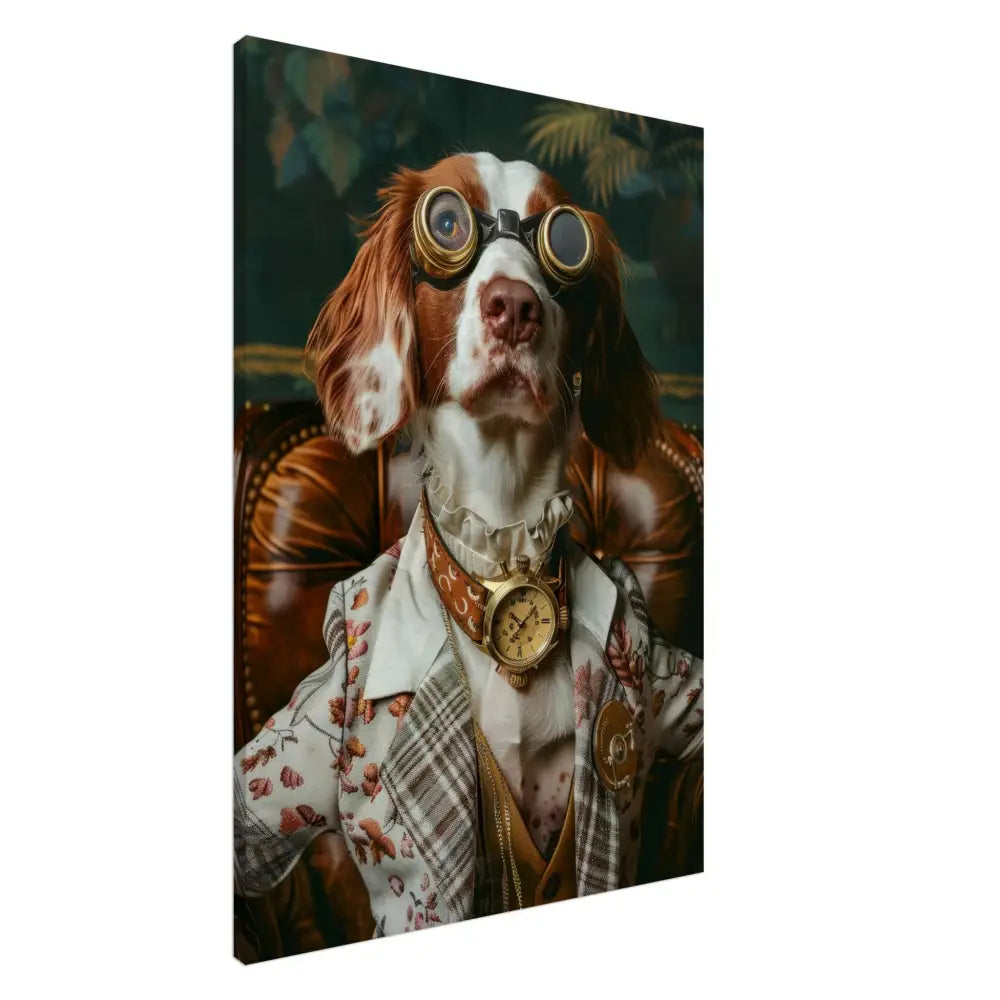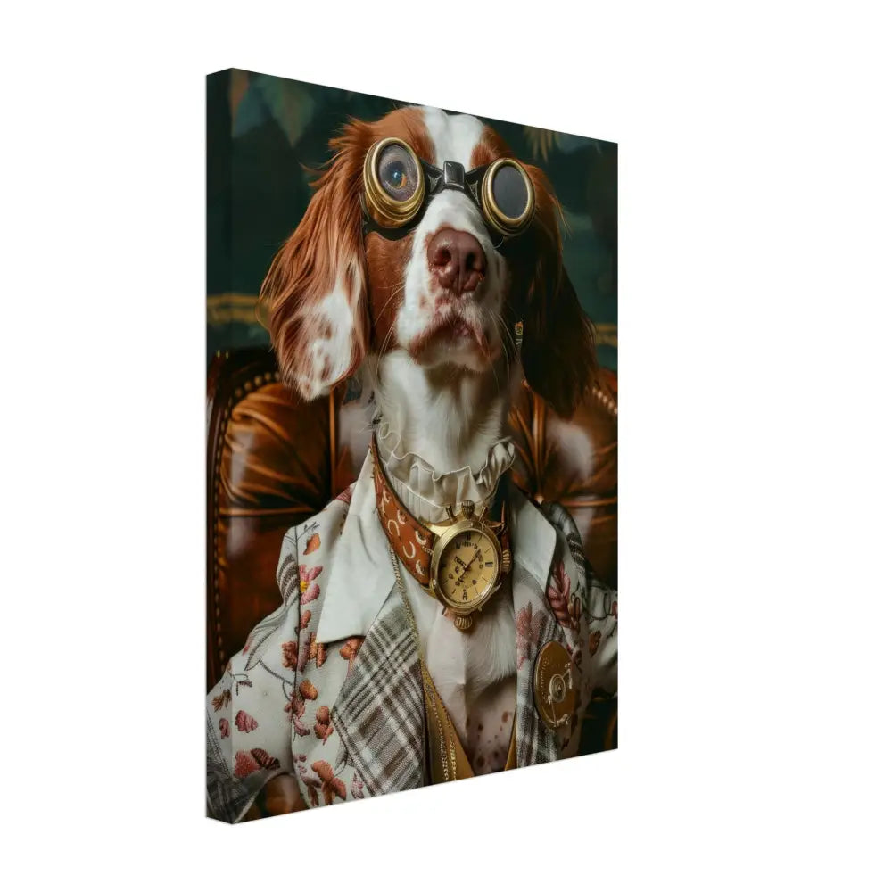 Deze afbeelding toont een dier, gekleed in een prachtige vintage steampunk outfit. Het draagt een sierlijke, crèmekleurige jas met een bloemenpatroon en subtiele stiksels. Om de nek hangt een antieke gouden klok, die het geheel een tijdloze charme geeft. De kop is versierd met imposante, bronskleurige bril met metalen details, waardoor het dier een avontuurlijke uitstraling krijgt. De pootjes worden omhuld door fijne leren accenten en contrasterende stiksels die het esthetische geheel vervolmaken. De achtergrond van dit schilderij toont een weelderig, groen decor, wat het geheel een mysterieuze en romantische sfeer verleent.