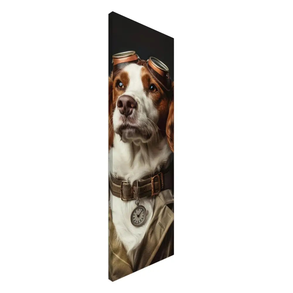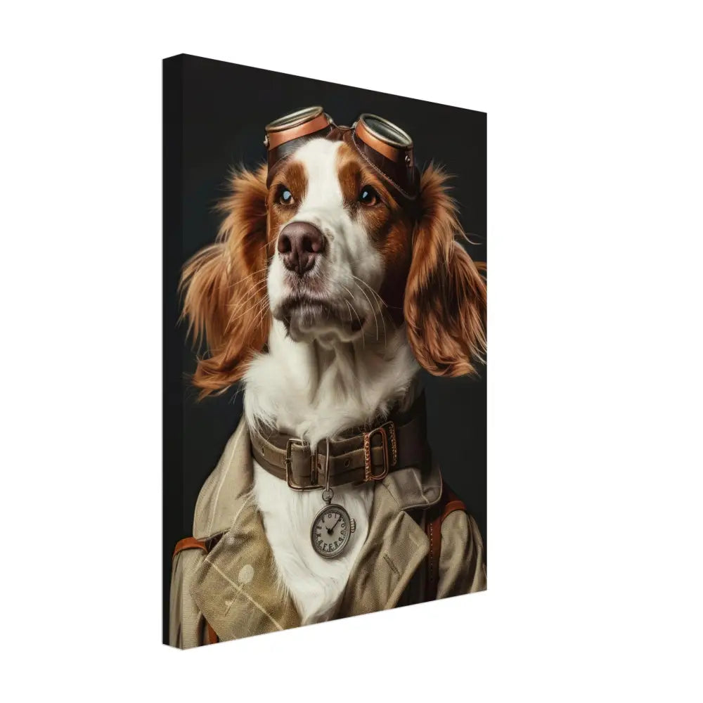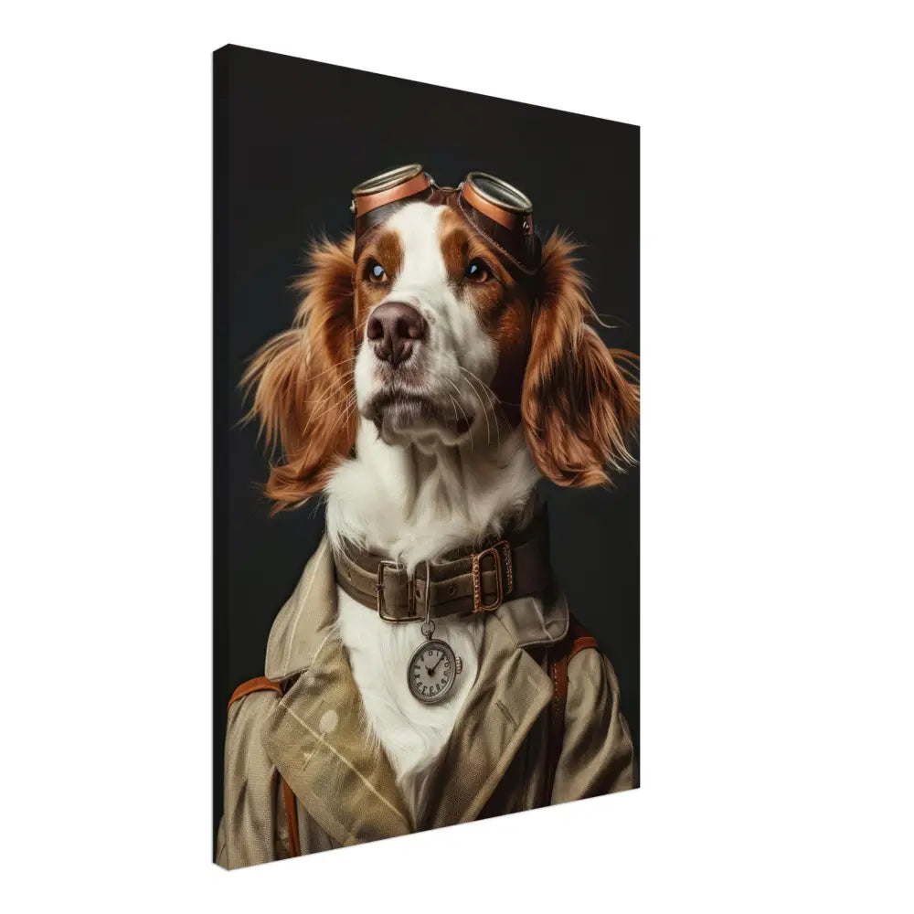 Deze afbeelding toont een hond, gekleed in een prachtige vintage steampunk outfit. Het draagt een elegante, beige jas met subtiele patronen en lederen accenten. Om de nek hangt een antieke zilveren klok, die de tijdloze charme van de outfit versterkt. Op het hoofd pronkt een paar grote, retro-futuristische brillen met bronzen metalen details, wat het geheel een avontuurlijke uitstraling geeft. De pootjes zijn afgewerkt met stijlvolle, lederen manchetjes die de jas complementeren. De achtergrond is donker en mysterieus, wat de focus volledig op het indrukwekkende kostuum van de hond legt.