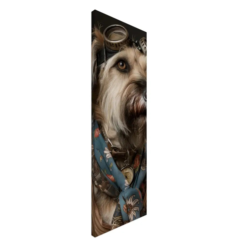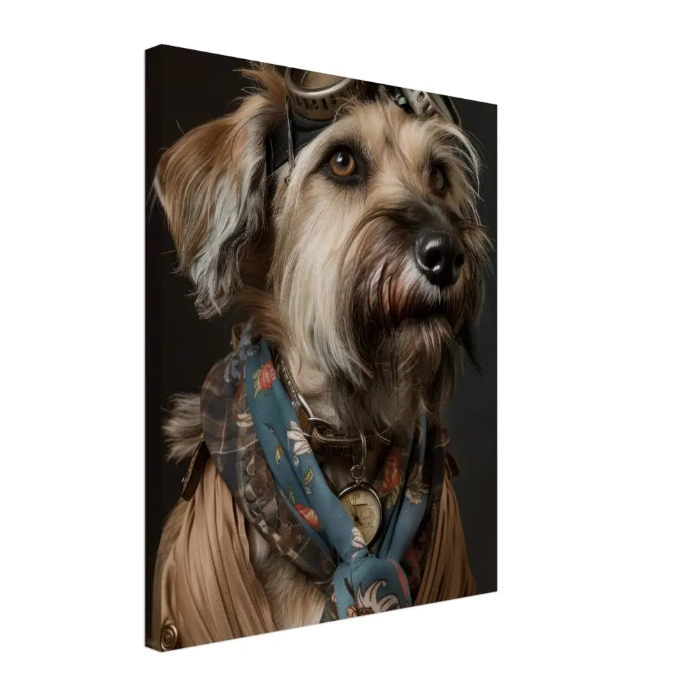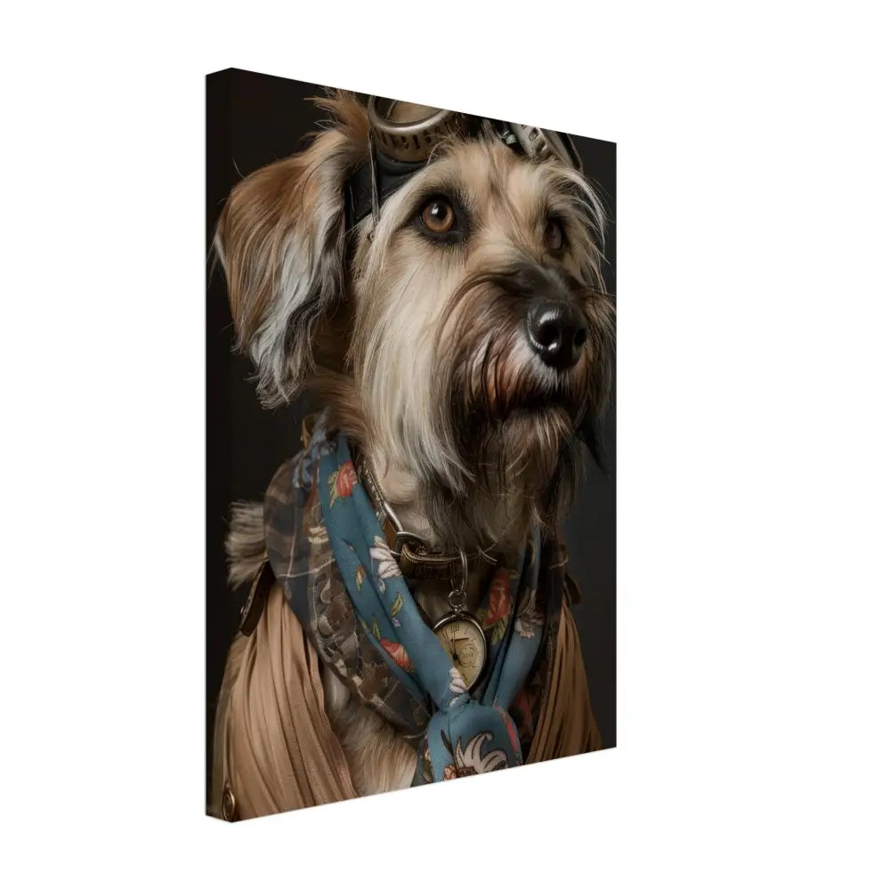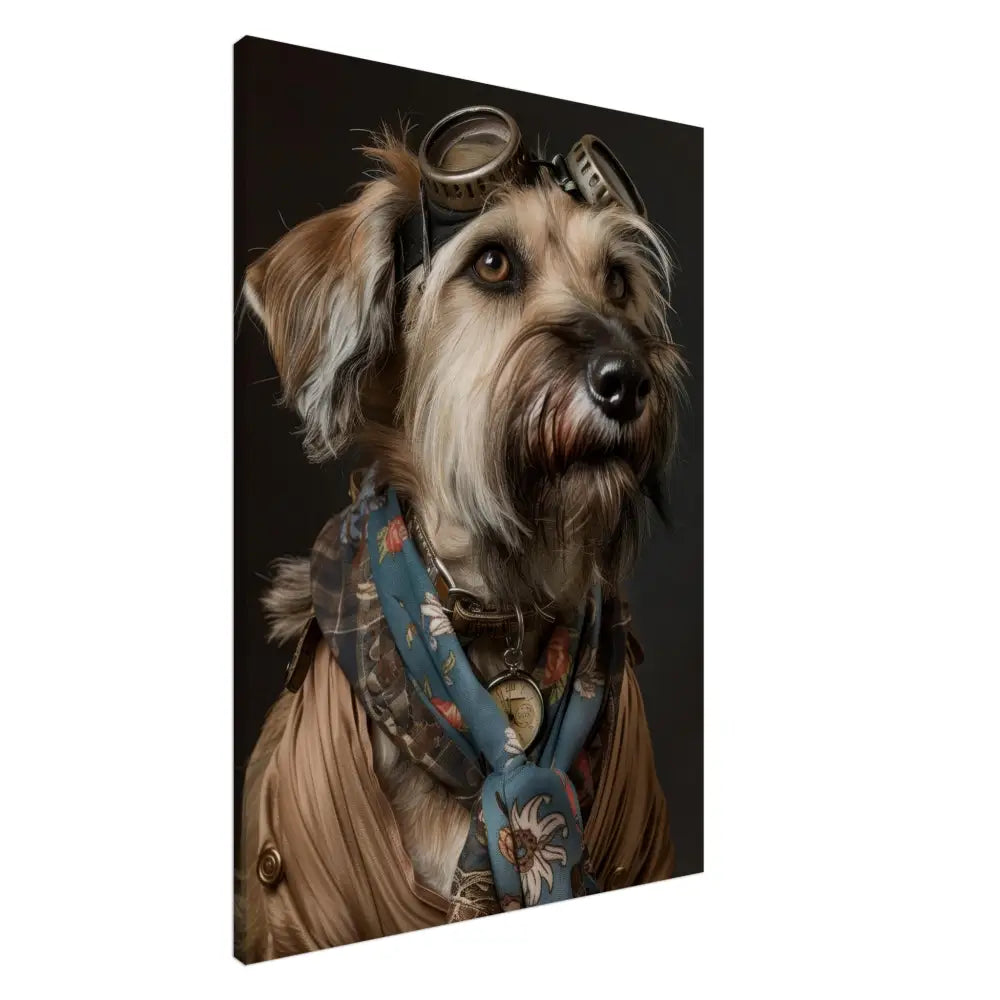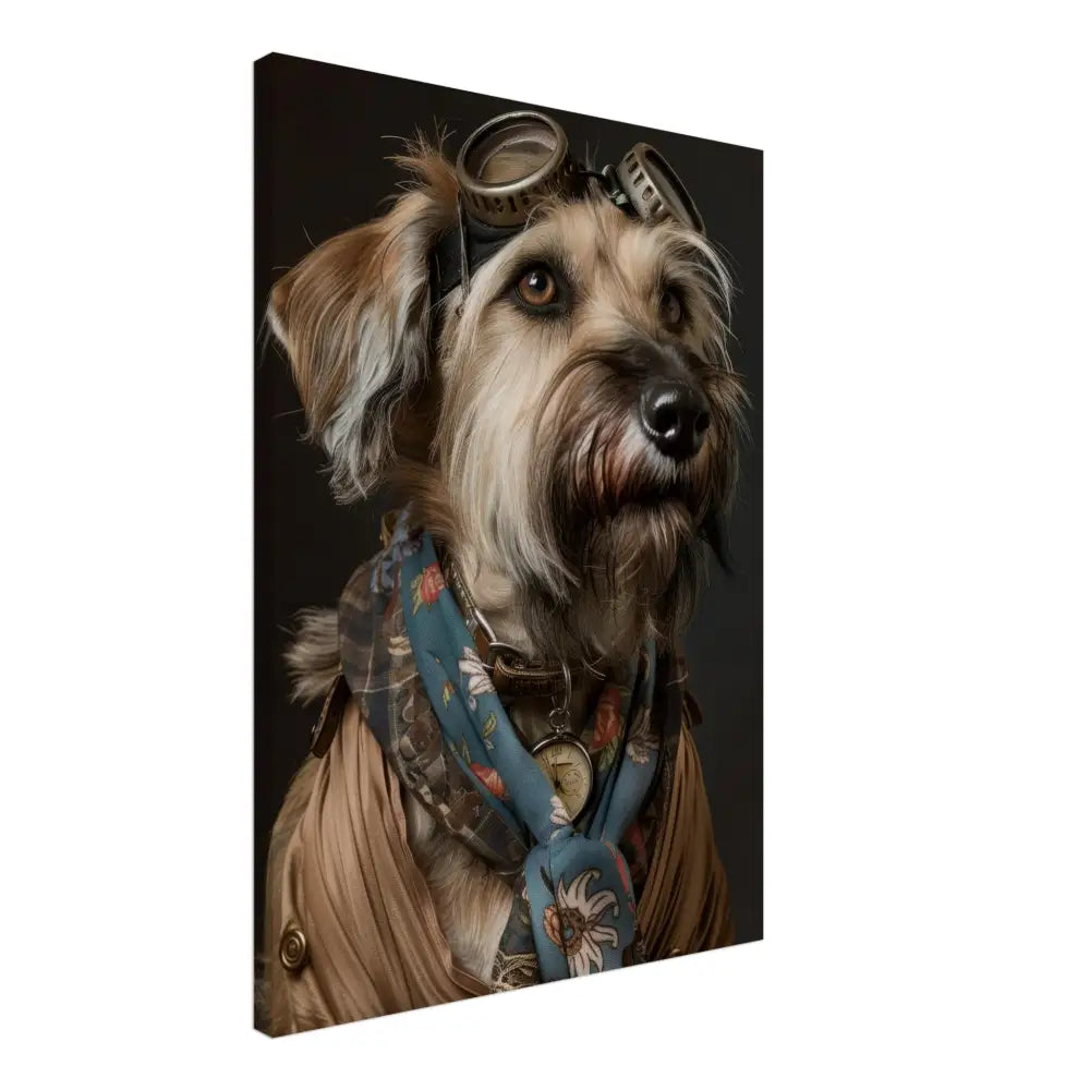 Deze afbeelding toont een dier, gekleed in een prachtige vintage steampunk outfit. Het draagt een elegante, beigekleurige jas met subtiele plooien en koperen knopen. Om de nek van het dier hangt een antieke gouden klok, die extra klasse toevoegt. Zijn hoofd is voorzien van een paar stevige, bronzen brillen met verfijnde, industriële accenten. Het geheel wordt verder verfraaid door een sierlijke, gebloemde sjaal met een mix van blauw- en rozetinten. De achtergrond is donker gehouden, waardoor de steampunk elementen nog meer naar voren komen en de focus volledig op het dier ligt.