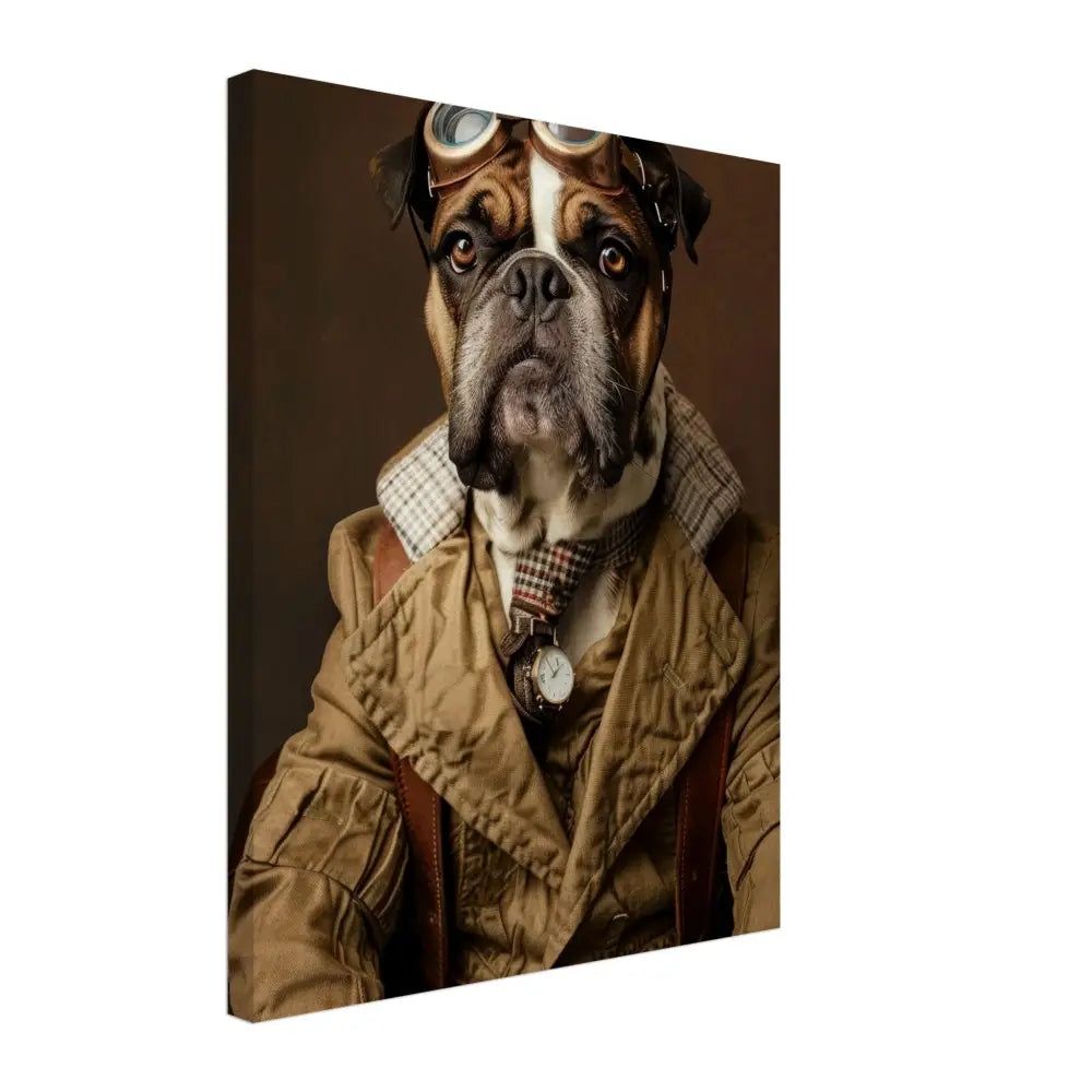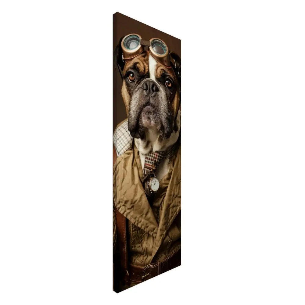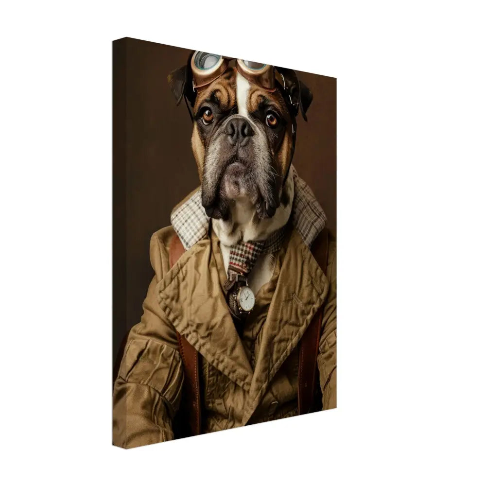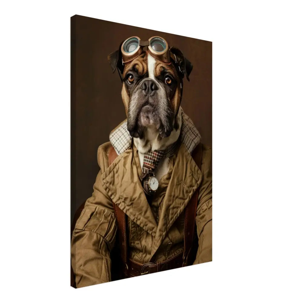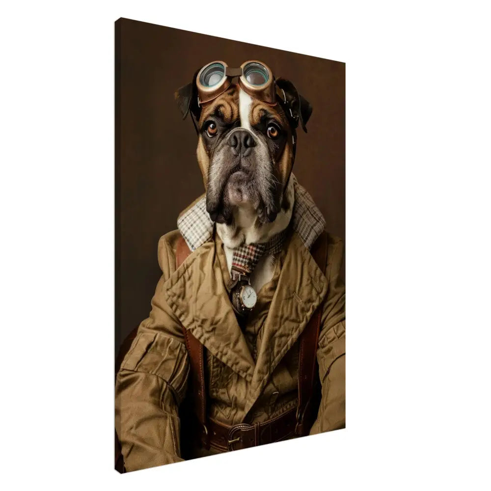 Deze afbeelding toont een dier, gekleed in een prachtige steampunk outfit. Het draagt een elegante, zandkleurige jas met verfijnde plooien en leren accenten. Om de nek van de hond hangt een antieke zilveren klok, subtiel verweerd en prachtig glanzend. Het hoofd van het dier is gesierd met een paar robuuste, koperen goggles met reflecterende lenzen en gedetailleerde metalen accenten. De outfit wordt verder gecomplementeerd door ruitjesmotief accenten en een riem met contrasterende stiksels die de vintage uitstraling versterken. De achtergrond is rustiek en doet denken aan een oude studie, met warme bruine tinten die het geheel een tijdloze sfeer geven.