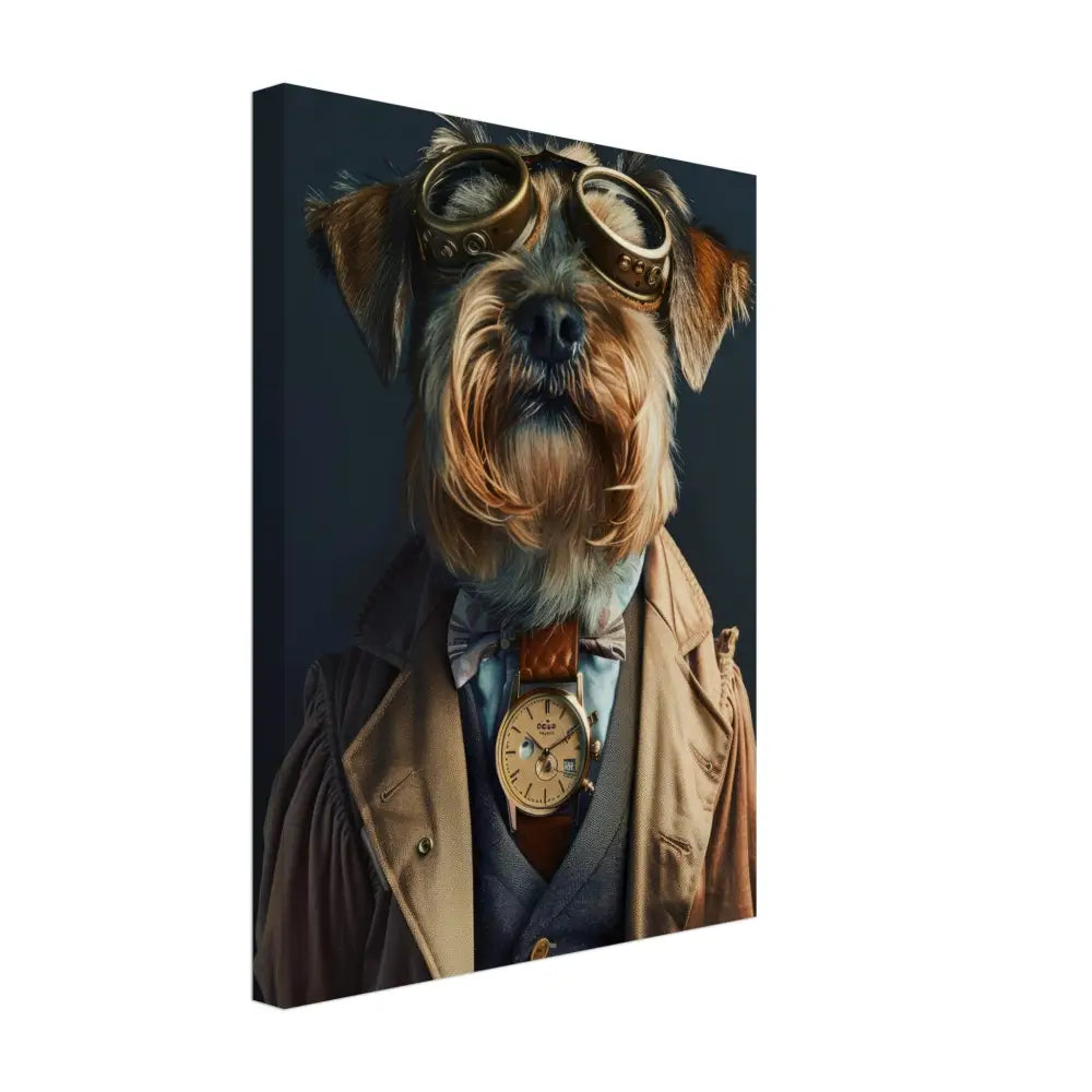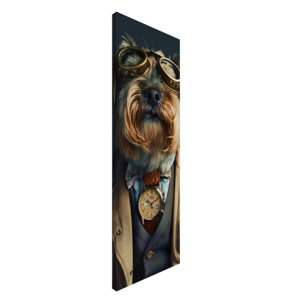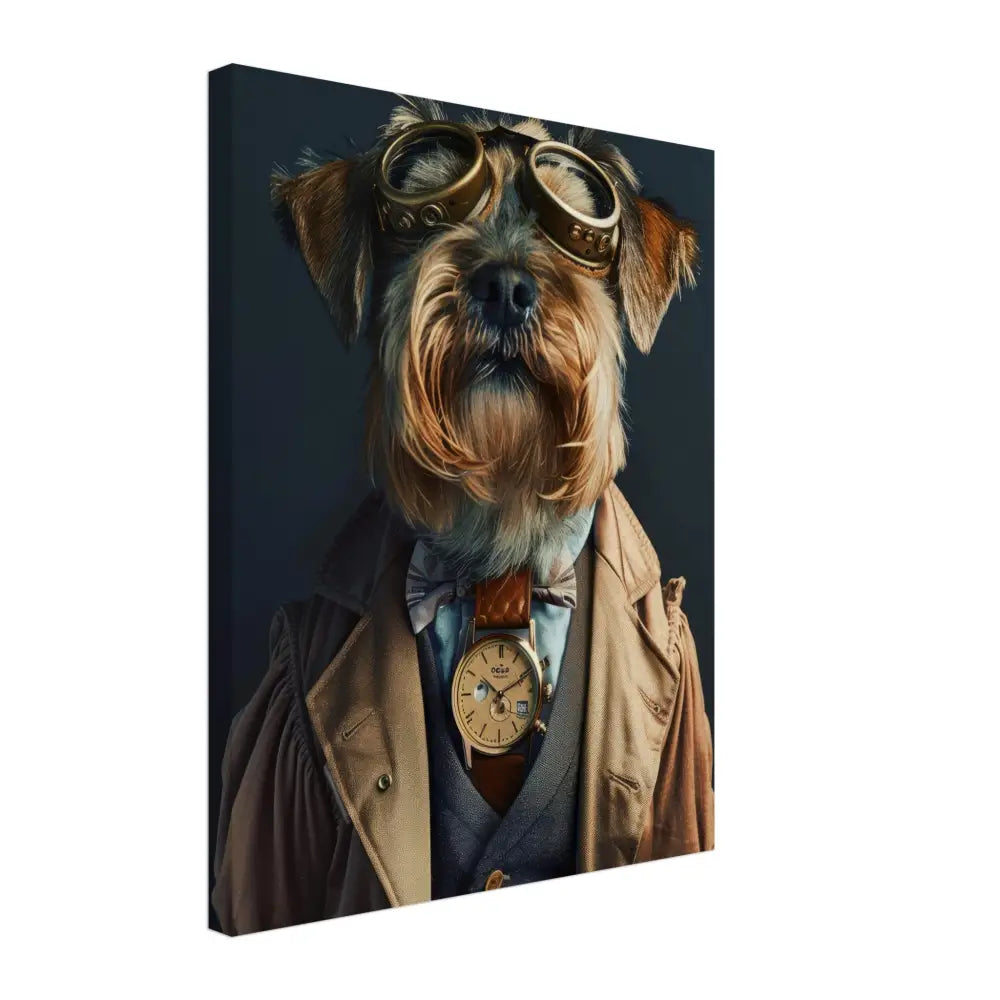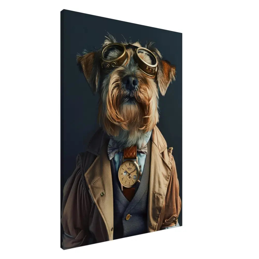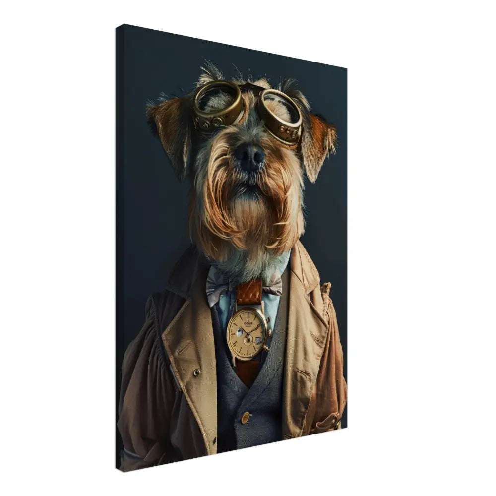 Deze afbeelding toont een dier, gekleed in een prachtige vintage steampunk outfit. Het draagt een verfijnde beige jas met subtiele stiksels en geplooide accenten. Om de nek hangt een imposante gouden klok die de gehele compositie een elegante toets geeft. De kop van het dier is voorzien van grote, bronzen brillen met delicate en uitgebreide metalen details, die perfect passen bij het steampunk-thema. Daarnaast zijn er accessoires zoals lederachtige manchetjes en een strikje die het geheel afmaken. De achtergrond is gedempt en neutraal, waardoor de aandacht volledig naar de gedetailleerde outfit van het dier wordt getrokken.