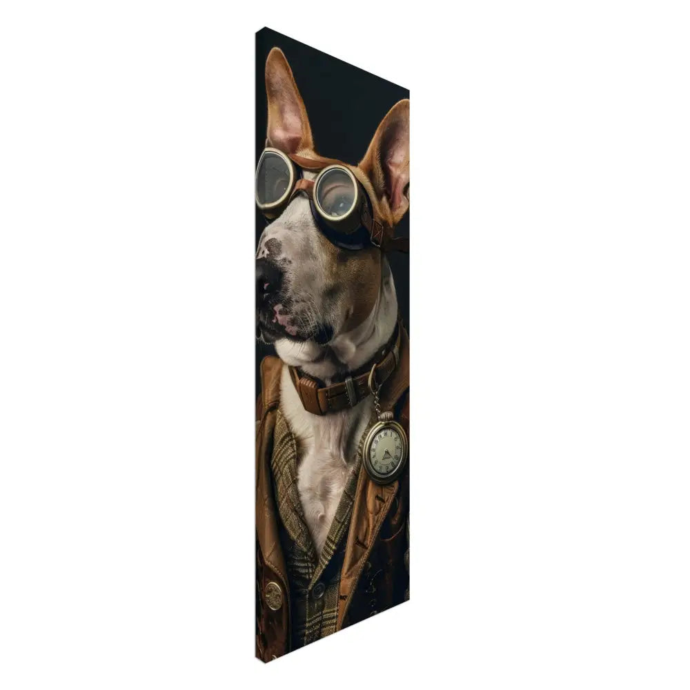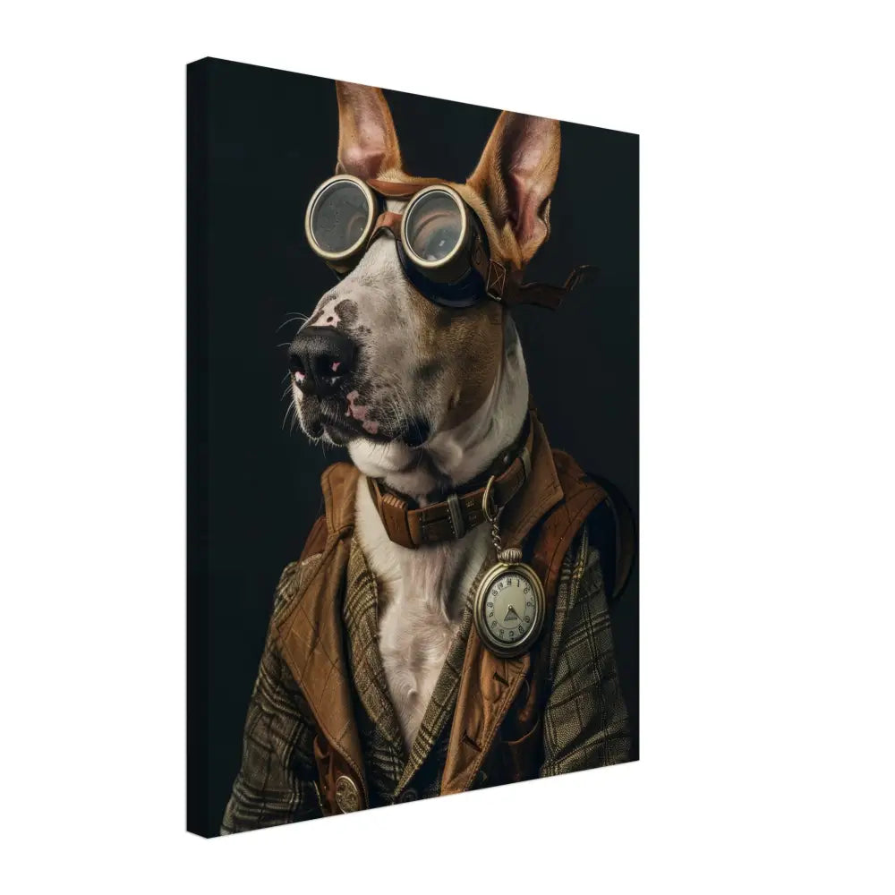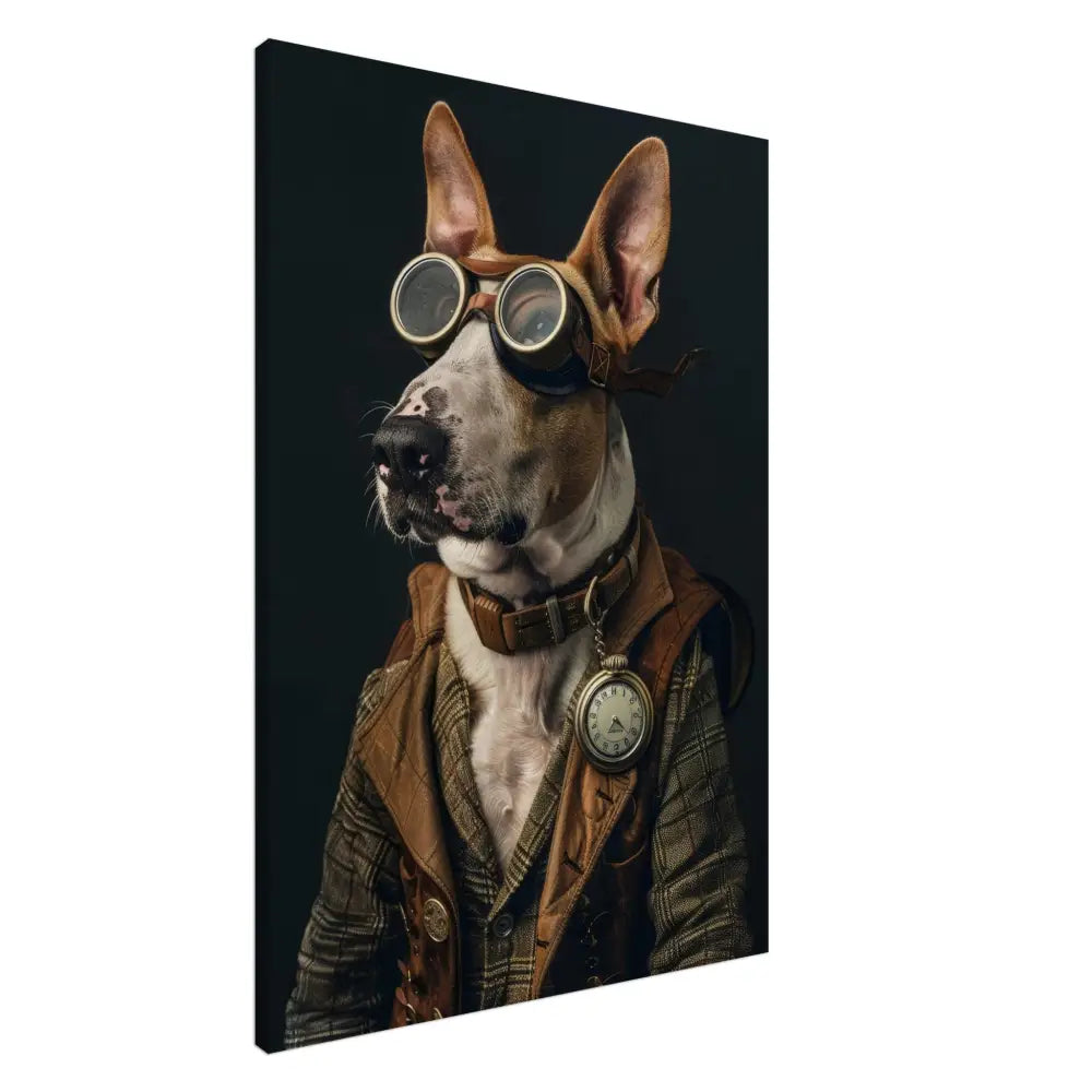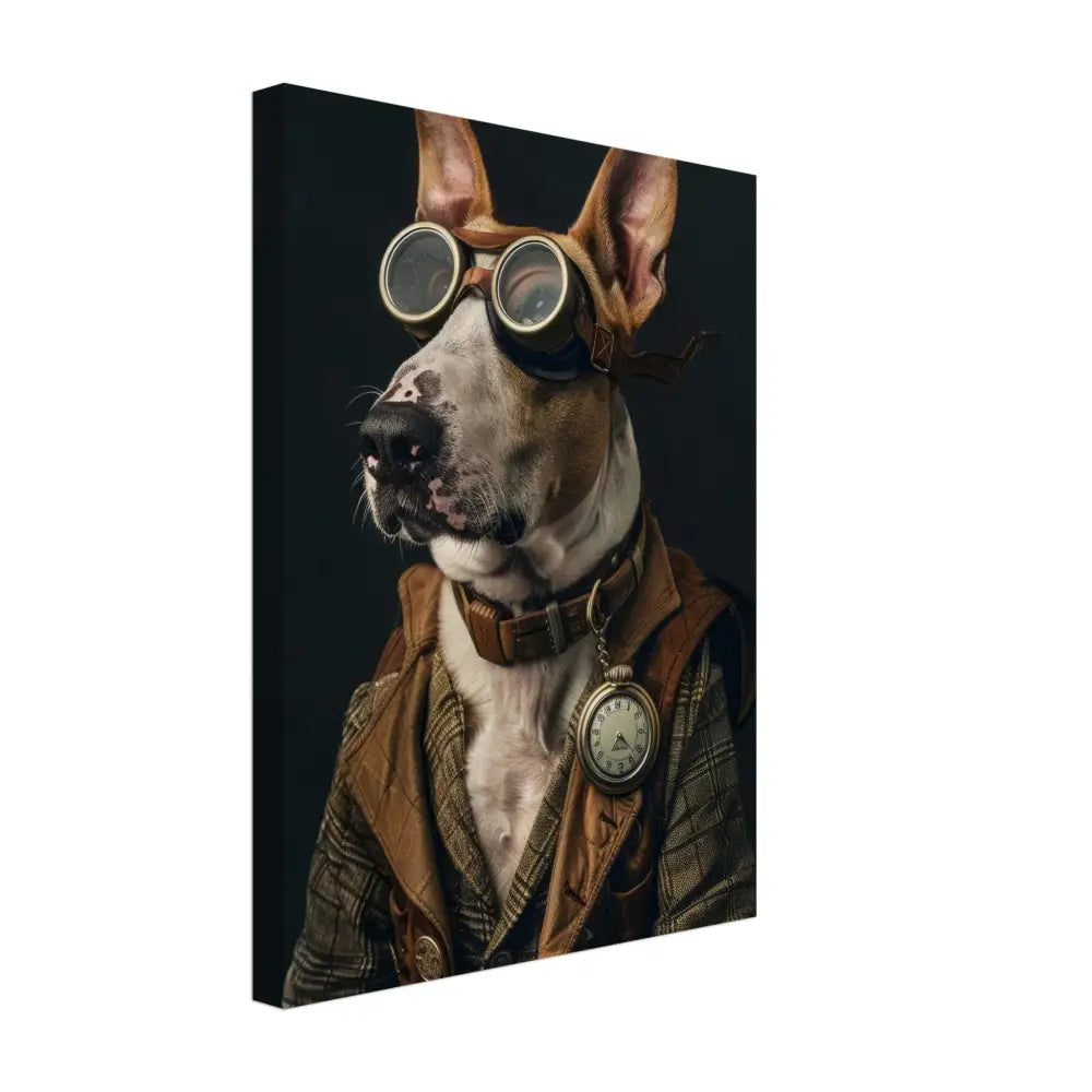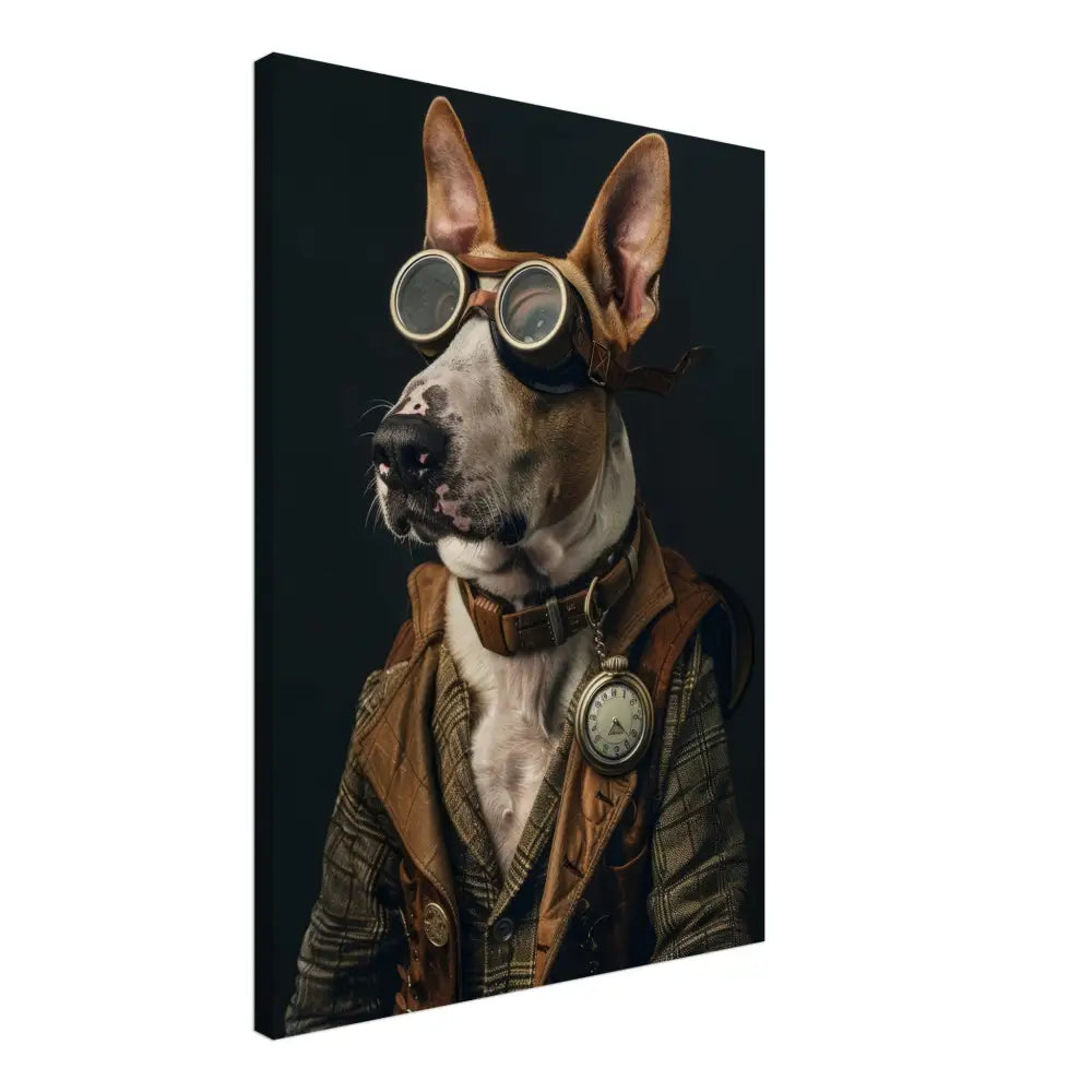Deze afbeelding toont een hond, gekleed in een prachtige vintage steampunk outfit. Hij draagt een elegante, bruine jas met ruitpatroon en leren accenten, wat een klassieke uitstraling geeft. Om zijn nek hangt een antieke zilveren klok, die de tijdloze charme van de outfit benadrukt. De kop wordt gesierd door een paar grote, retro-futuristische brillen met robuuste, bronzen metalen details, wat hem een avontuurlijke look geeft. De pootjes zijn voorzien van verfijnde leren manchetjes met contrasterende stiksels, wat het geheel afmaakt. De donkere achtergrond zorgt ervoor dat de opvallende details van het portret nog meer benadrukt worden.