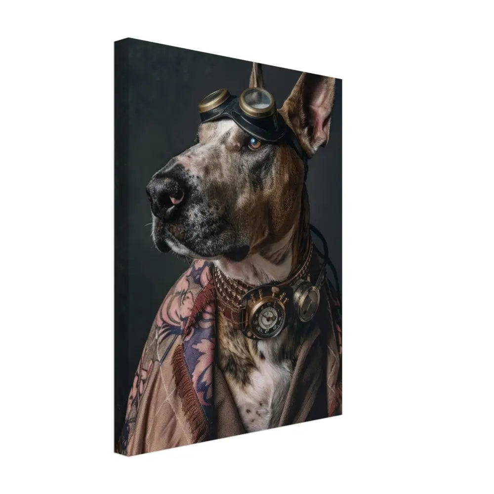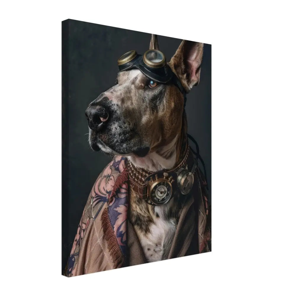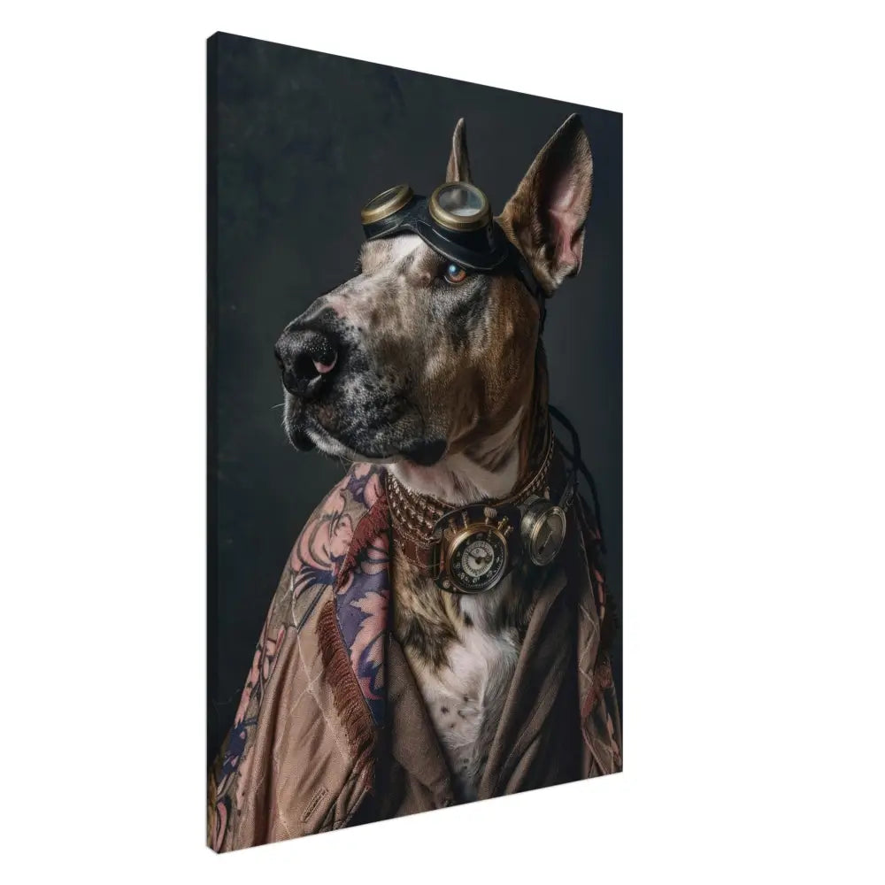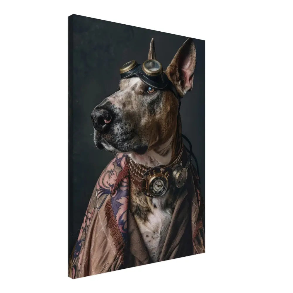 Deze afbeelding toont een dier, gekleed in een prachtige vintage steampunk outfit. Het draagt een indrukwekkende bruine jas met verfijnde patronen en verweerde accenten. Om de nek hangt een antieke bronzen klok, die de tijdloze elegantie benadrukt. De kop wordt gesierd door een paar grote, retro-futuristische brillen met metalen details in goudkleur, die een avontuurlijke sfeer oproepen. De pootjes zijn voorzien van subtiele leren accenten en contrasterende stiksels, die het geheel verfijnen. De achtergrond is donker met mysterieuze schaduwen, waardoor het portret een dramatische en nostalgische uitstraling krijgt.
