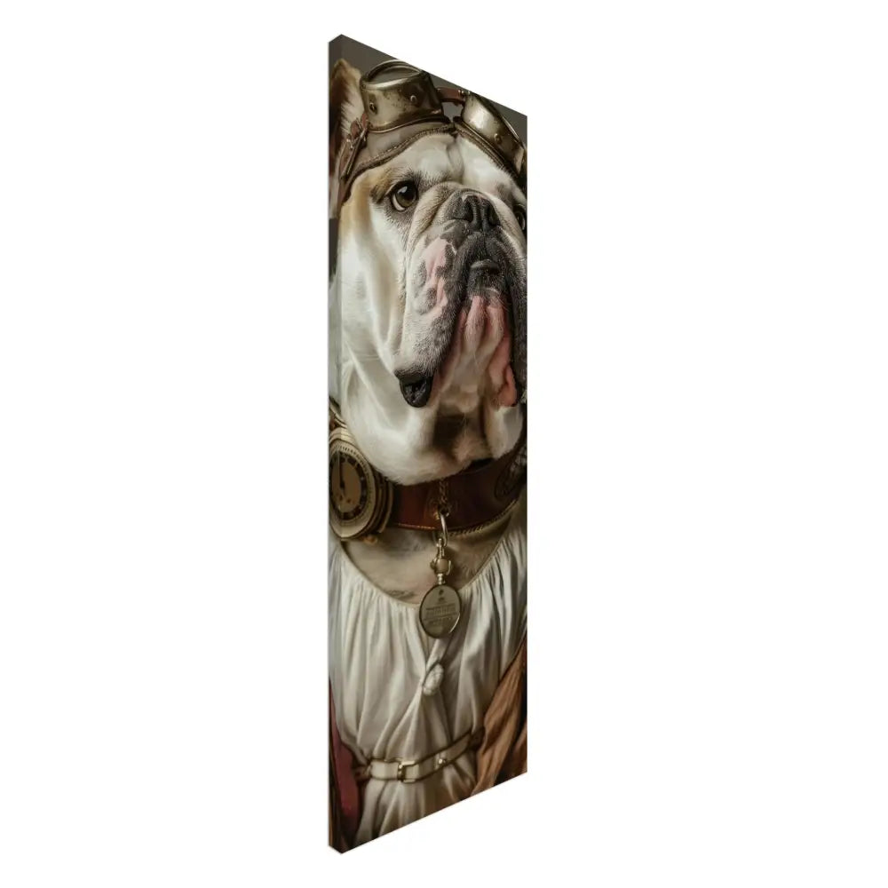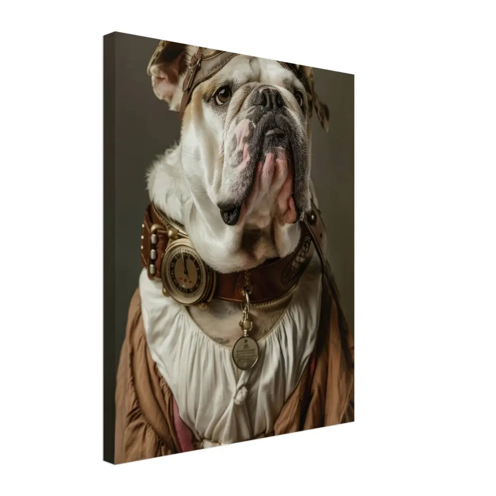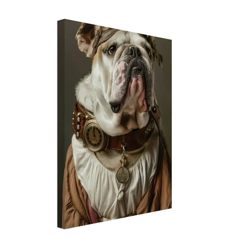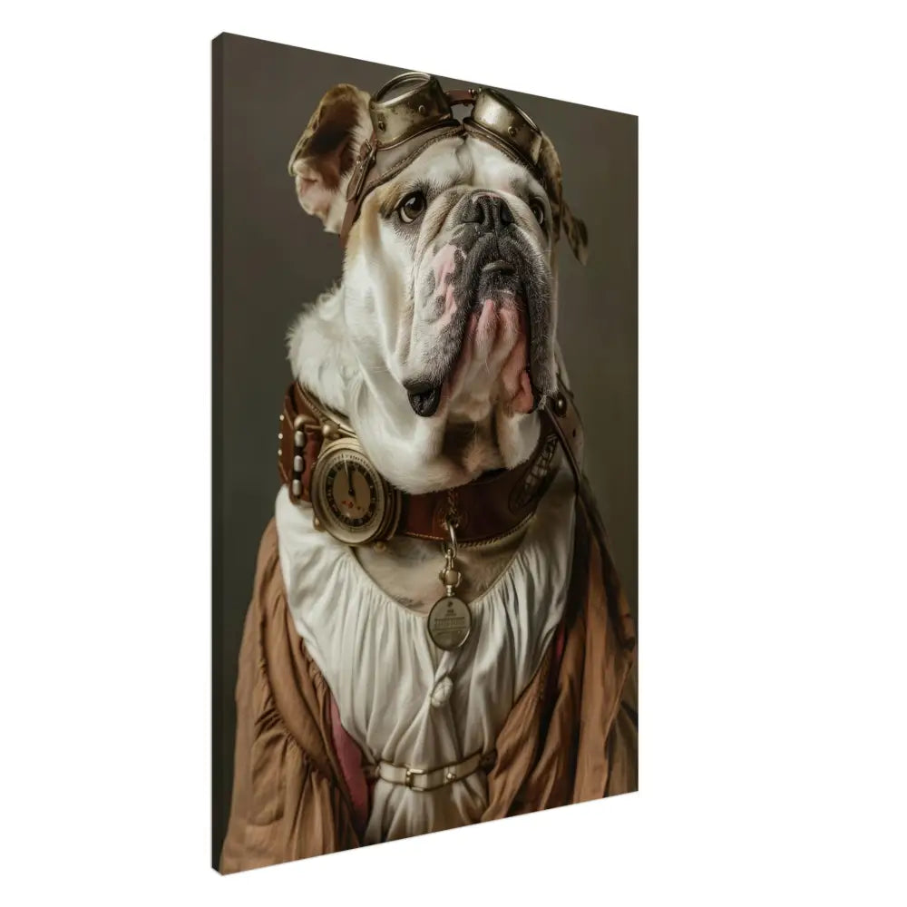 Deze afbeelding toont een hond, gekleed in een prachtige vintage steampunk outfit. Het draagt een sierlijke, bruine jas met subtiele patronen en leren accenten. Om de nek hangt een antieke bronzen klok, die de aristocratische uitstraling versterkt. De kop wordt gesierd door een paar grote, retro-futuristische brillen met metalen details in bronskleur, waardoor deze eruitziet als een avontuurlijke tijdreiziger. De pootjes zijn voorzien van elegante, beige bontachtige manchetjes die het geheel afmaken. De afbeelding wordt compleet gemaakt door een neutrale, grijzige achtergrond die de warme kleuren van de outfit accentueert.